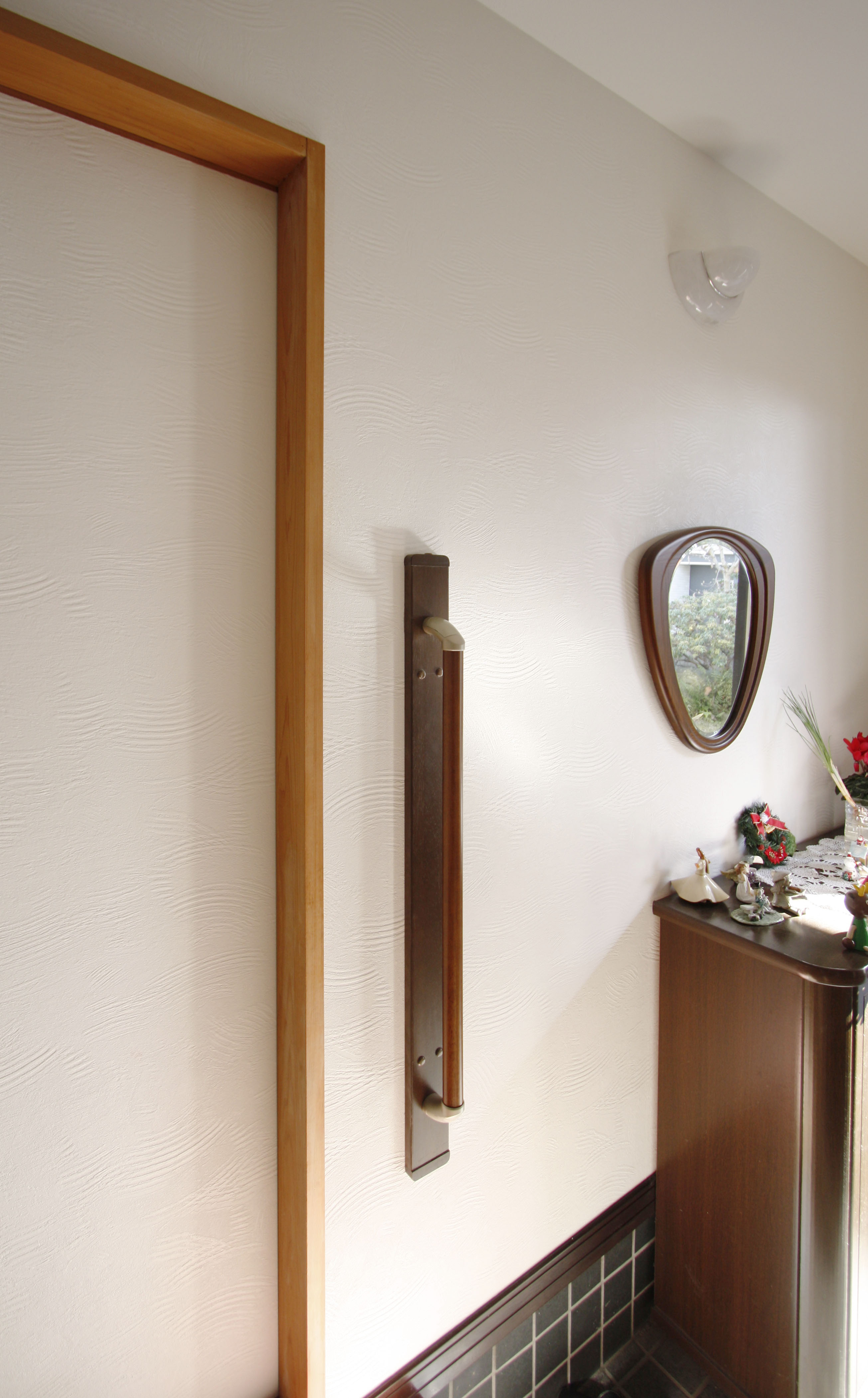 お風呂も昔のユニットバスでしたが、やはり現在のユニットバスと比べると、暖かさ、メンテナンス、バリアフリー化などでかなり見劣りします。非常に気持ちいいお風呂になったようです。 また玄関手摺はあれば意外と使用します。手摺は使用する場所によっては体の症状に合わせて取り付けますが、これは怪我を未然に防ぐ対策として取り付けました。 健康に生活できる空間になったと思います。