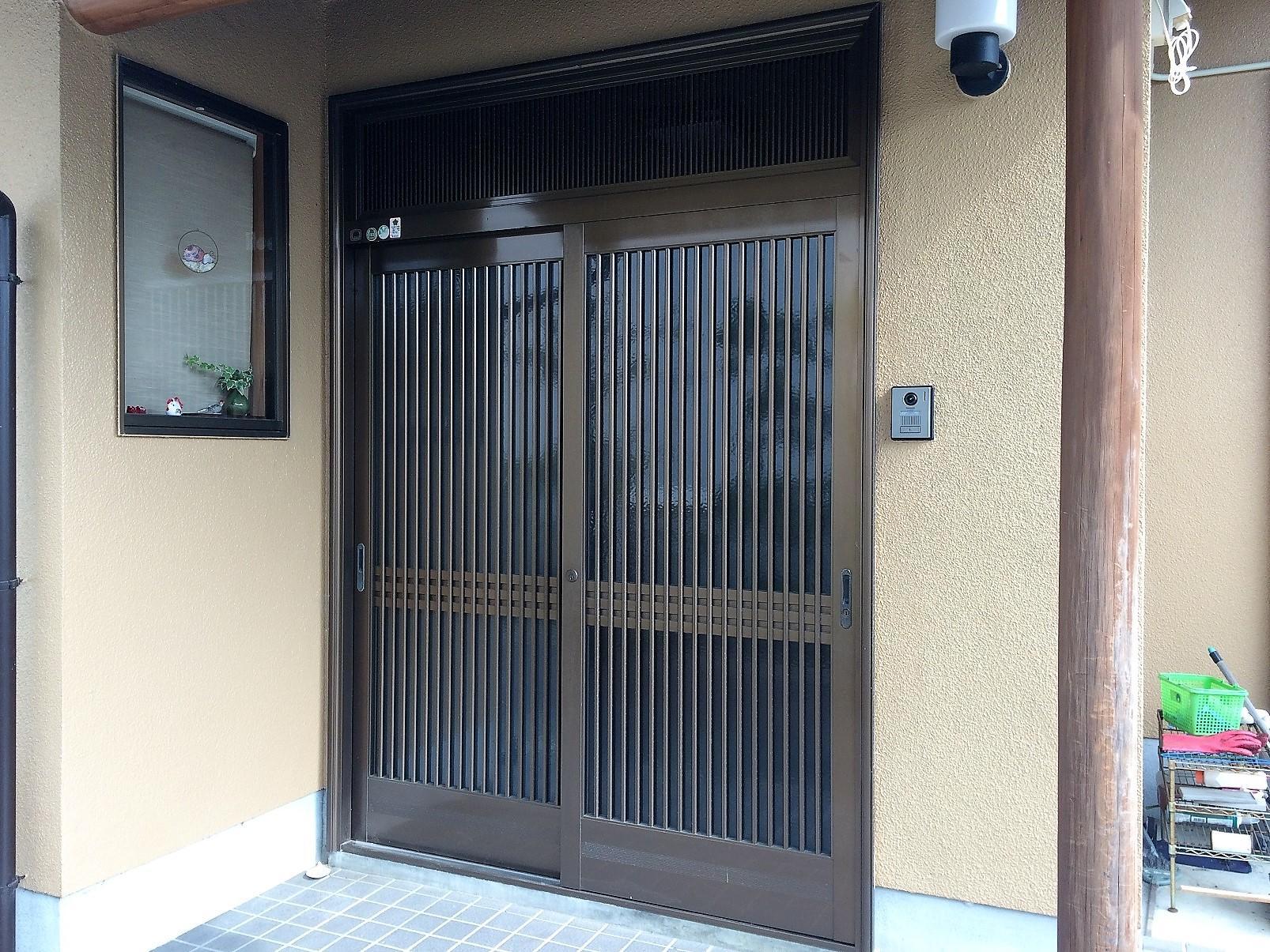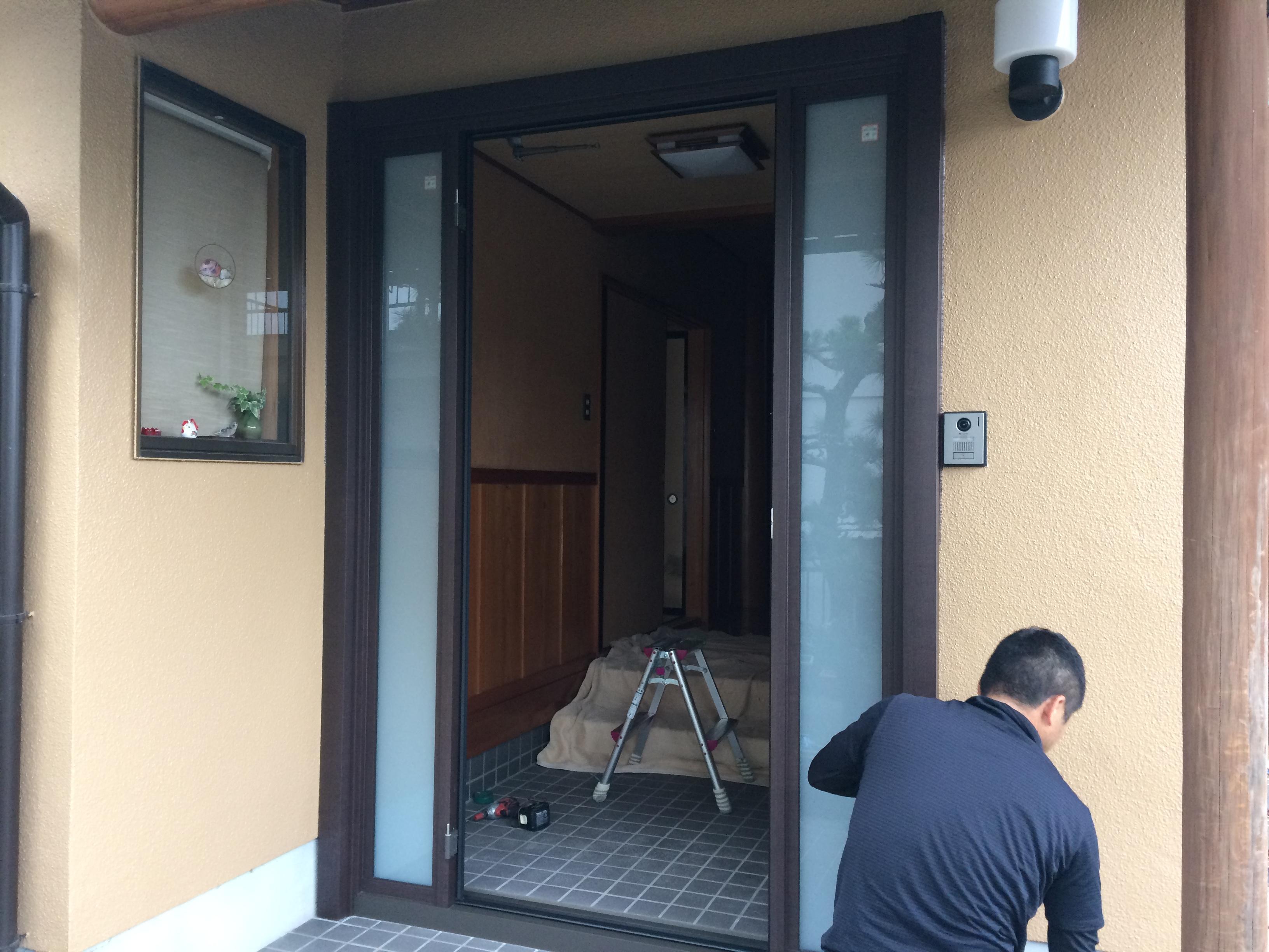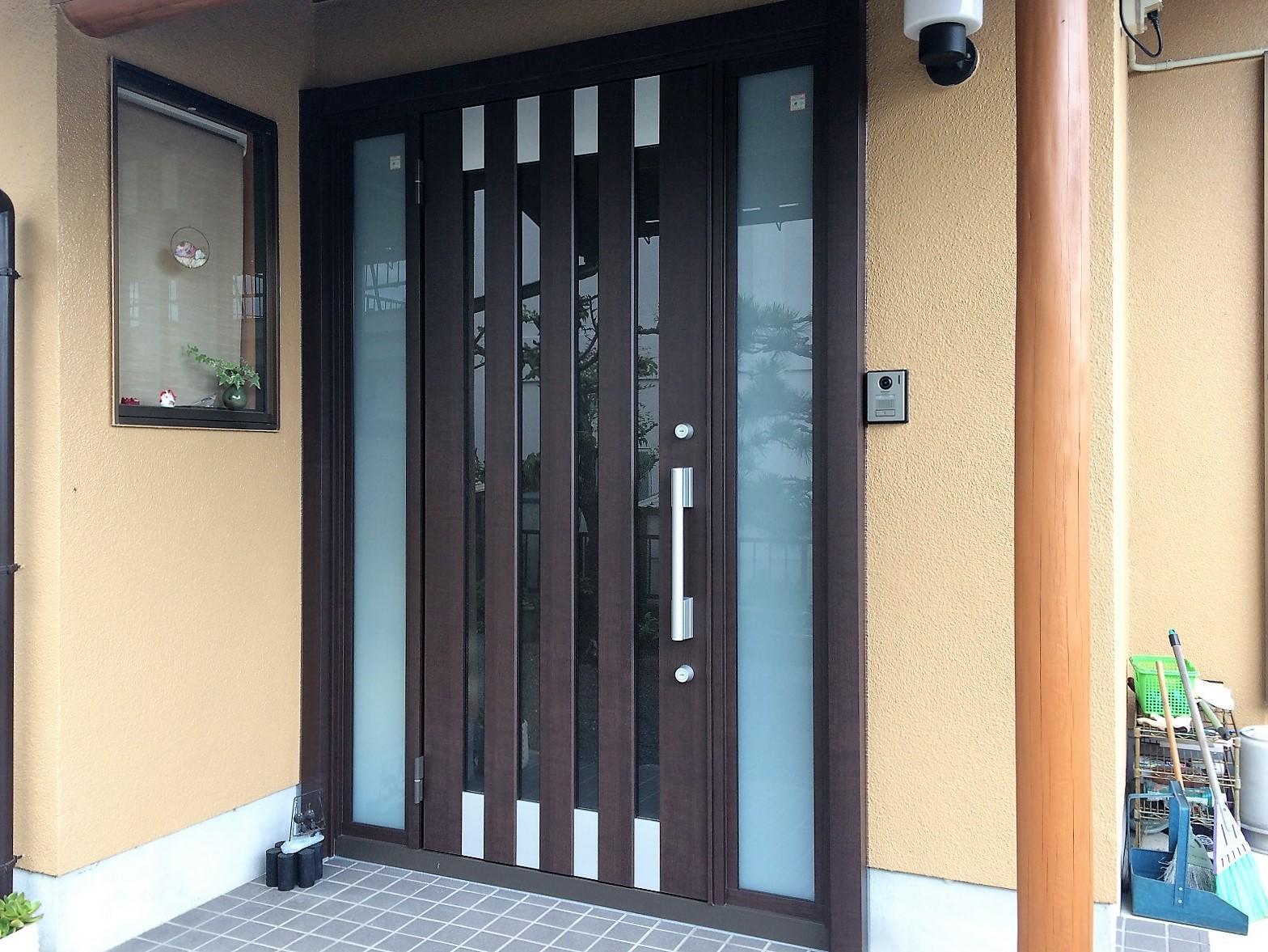 引違いの玄関扉から、開き戸タイプの玄関扉へ交換しました。 引き戸は扉を離しただけでは開いたままですが、開き戸は手を離せば扉は閉じるようになっています。(ストッパーがかからなければ)今回の工事は、お施主様がそこに着目した交換リフォームでした。 引違のW寸法があったため、すこし開口部の広い扉になっています。