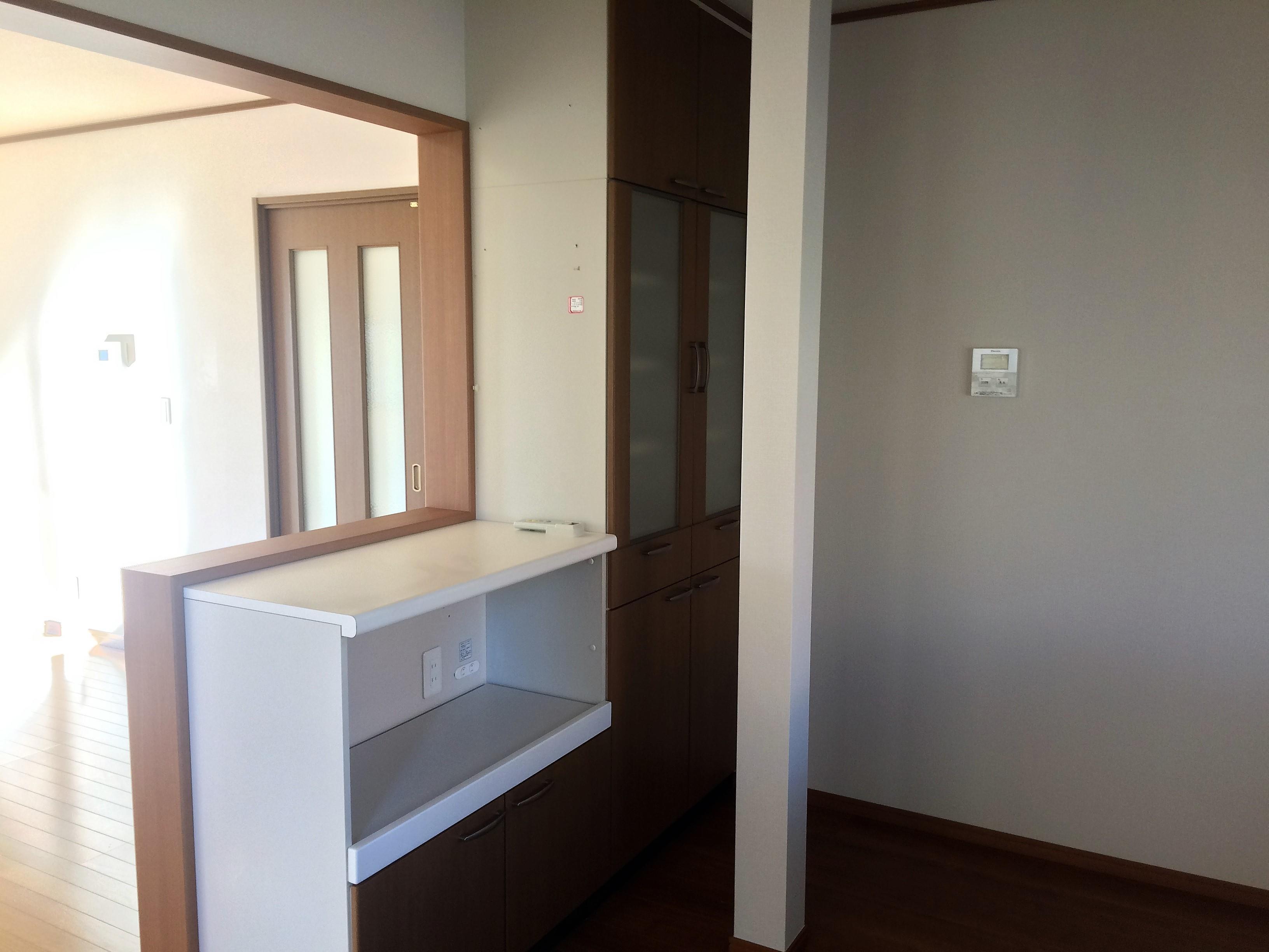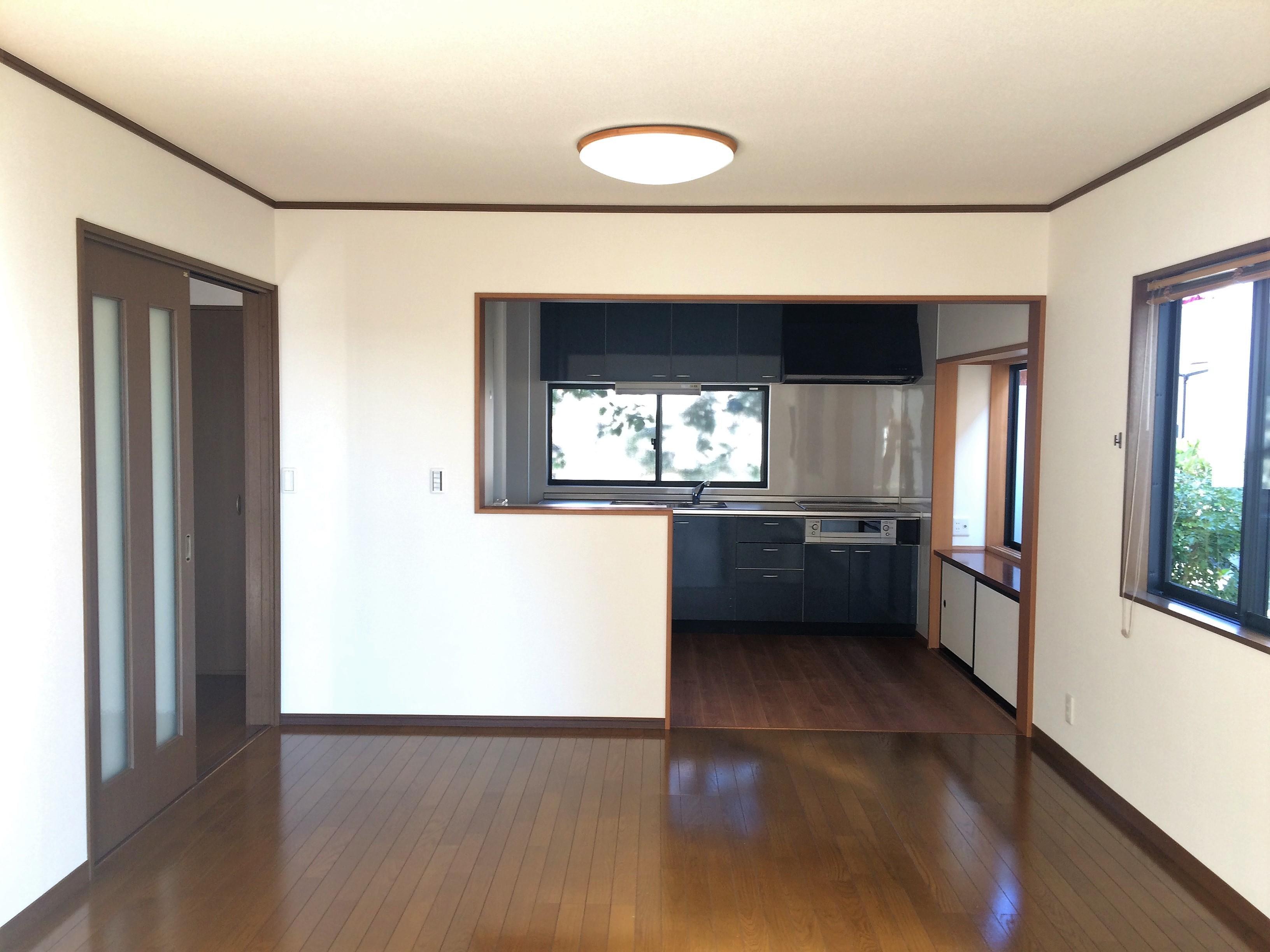 二世帯仕様の住宅を購入し、1階にLDKを設けたいとのご希望でした。 まだ築浅でキッチンも新しかったため、1階の和室と洋間をLDKに改装し、2階のキッチンを移設。和室の窓は、キッチンの高さに合わせ、カバー工法で小さくしました。