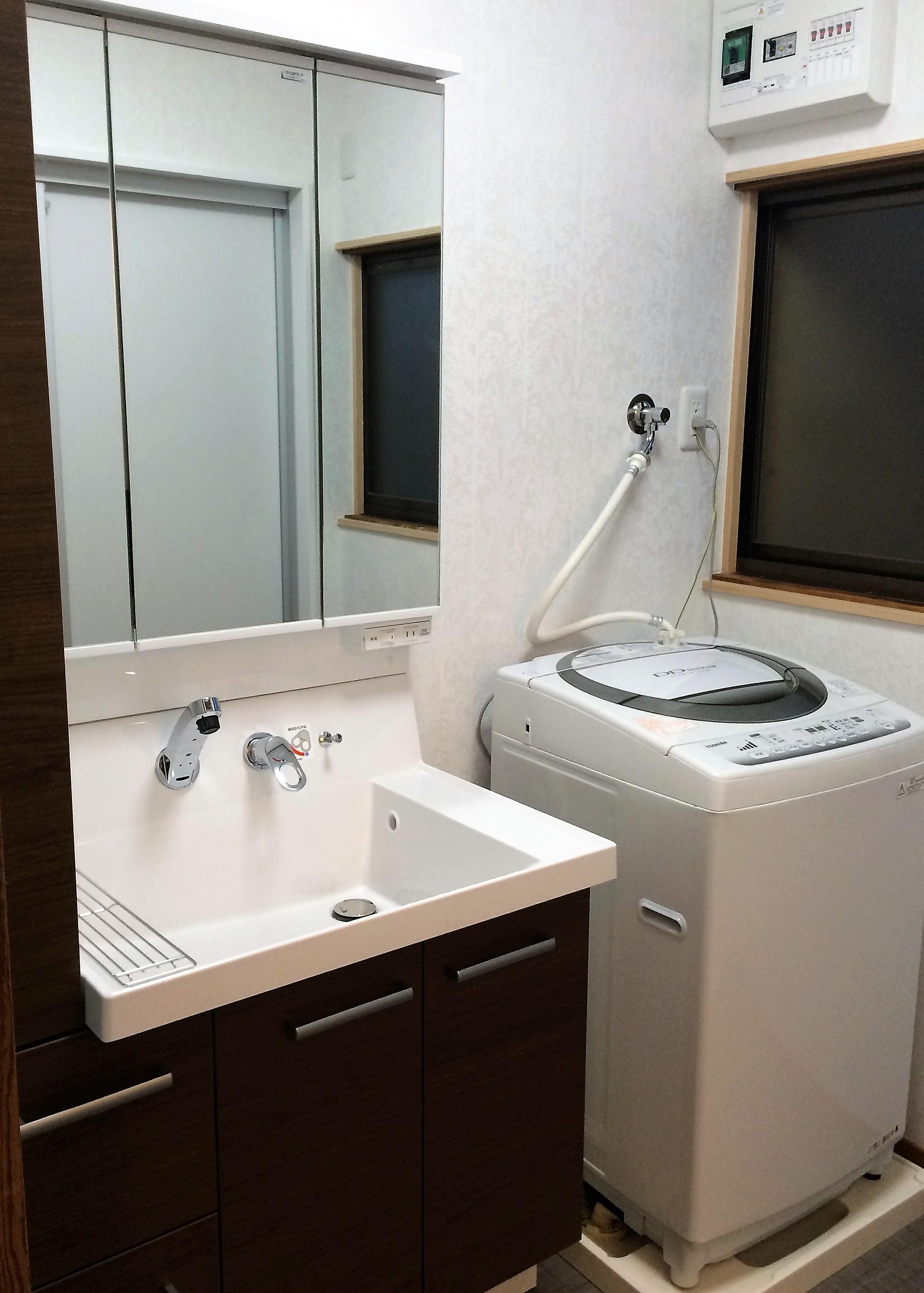 洗面化粧台と洗濯機の配置を変更し、無駄のない使い勝手のよい脱衣室へリフォームしました。サイド収納のある『LIXIL:ピアラ』を採用しました。