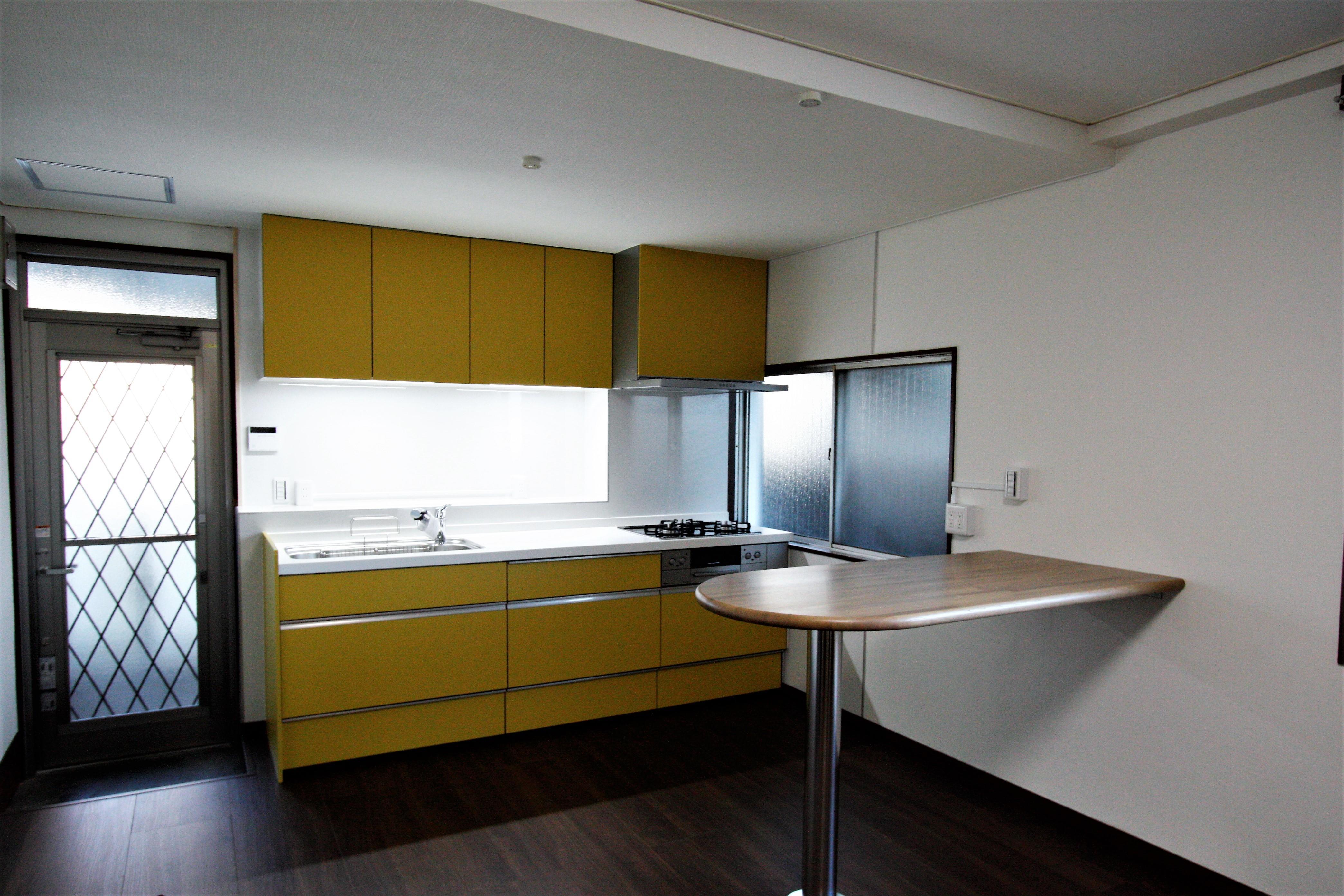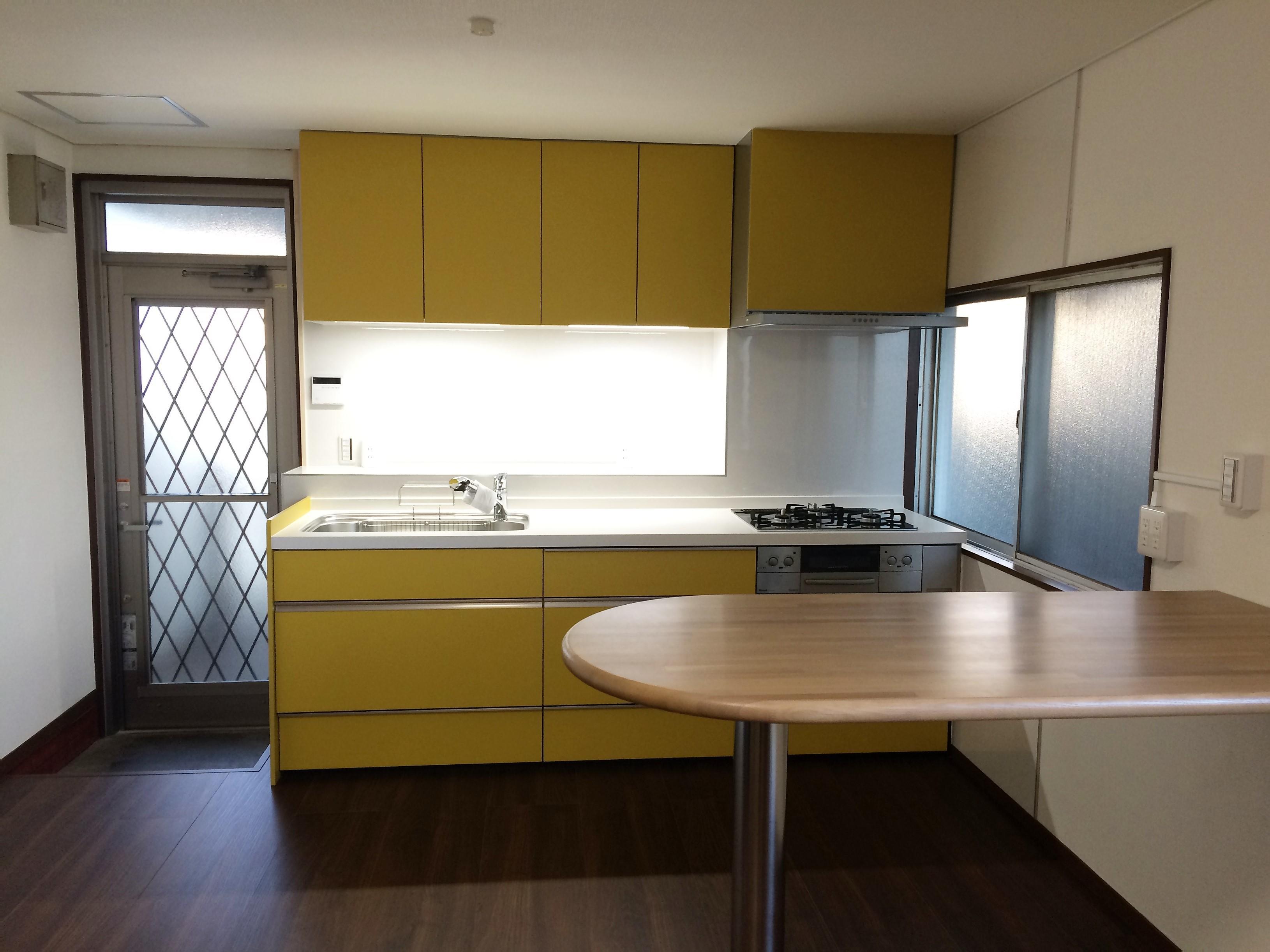 ご両親がお住まいだった住居部分を次の世代が生活できるようにとの相談をお受けしました。暗かったLDKを明るく開放的にし、カウンターや可動棚を設置し限られた空間を有効的に活用。キッチンなどの設備は水栓やコンロもショールームでひとつひとつ吟味し、奥様が選ばれました。(キッチンはLDKの主役となるイエローを採用)RC造のため制限がある中での計画でしたが、話合いを重ね可能な範囲で工夫し、職人さんにも現場で対応していただきました