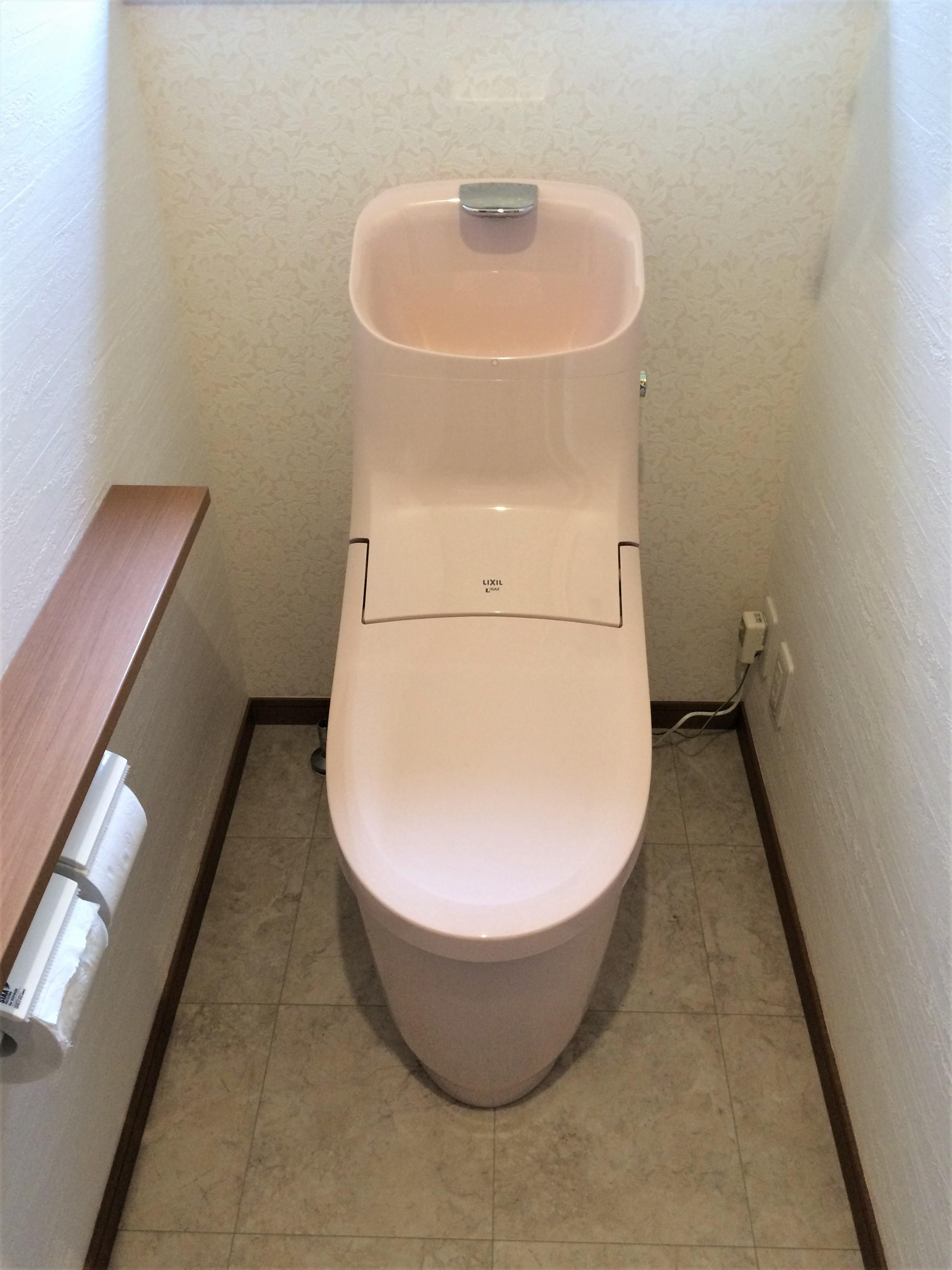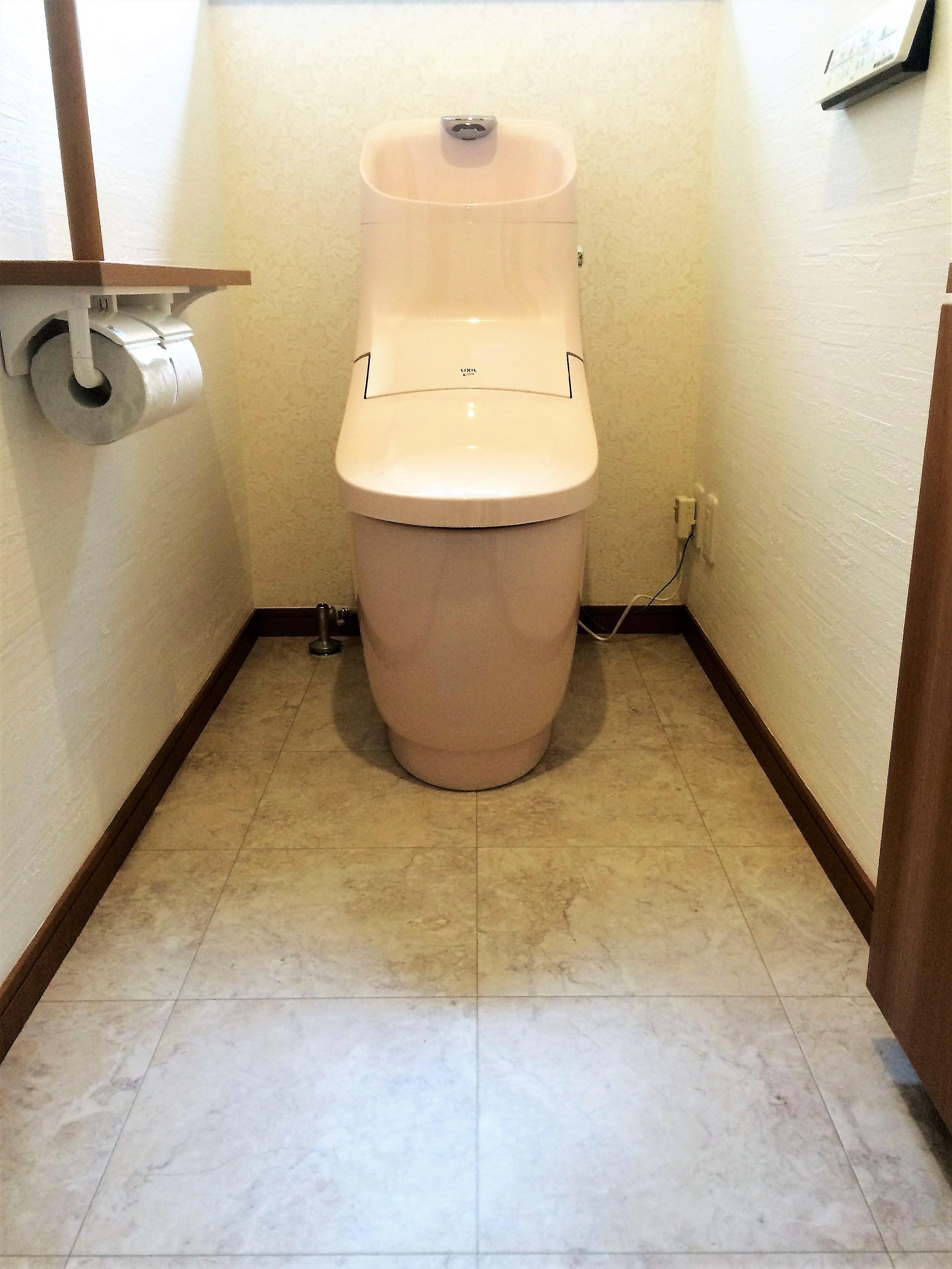 タイル仕上げの和式タイプだったトイレを、段差無しの洋式トイレへ改装しました。 手摺や収納の配置、クロスの色柄など細かい所もお施主様と話合い、素敵な空間に仕上がりました。