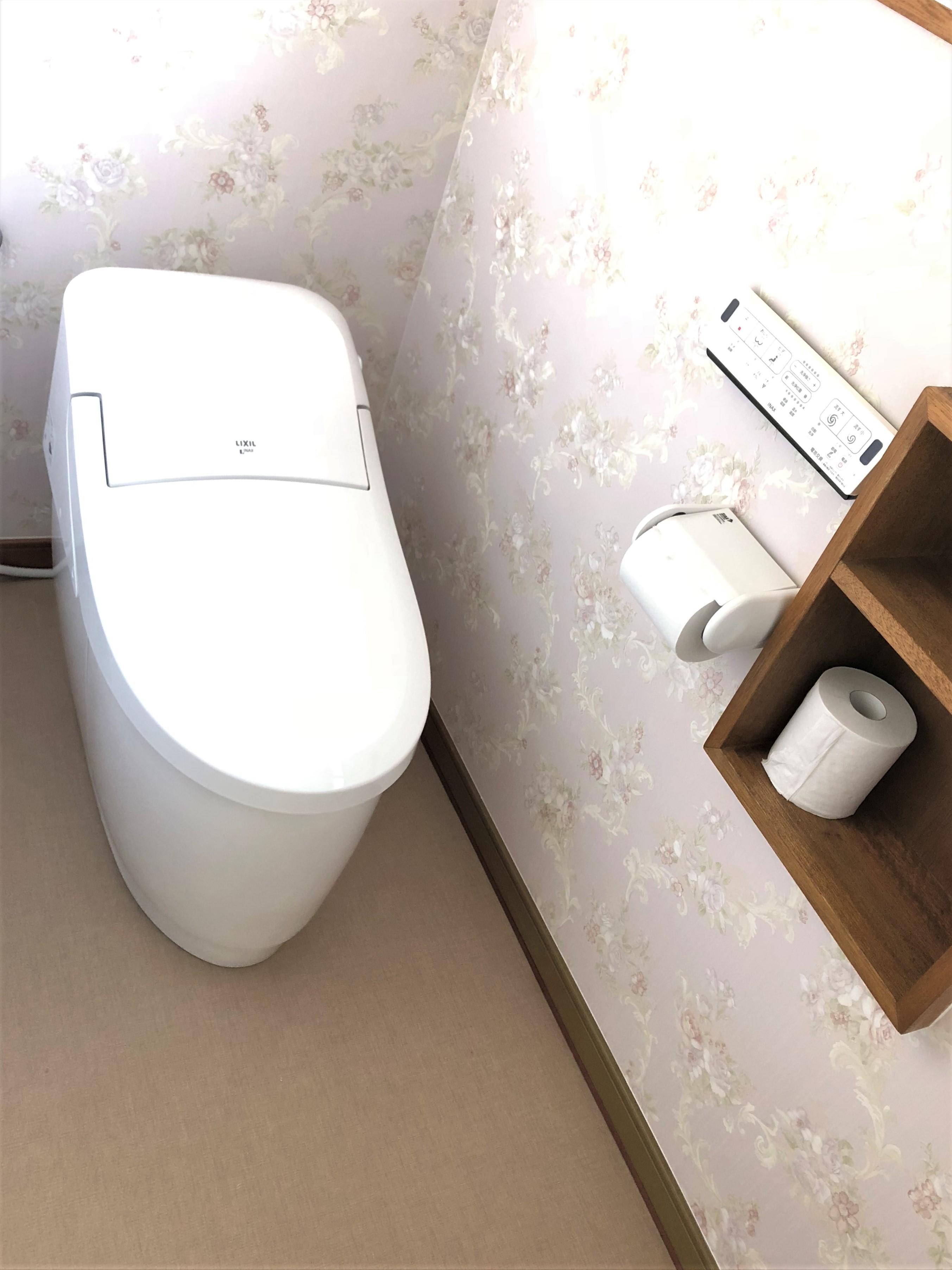 経年劣化により凹みが感じられるようになった廊下の補修をお考えだったお客様。LIXILリフォームフェアにご参加いただき、トイレと洗面化粧台の交換も行うこととなりました。壁紙の色柄にもこだわり、品のある落ち着いたトイレ空間に仕上がりました。
