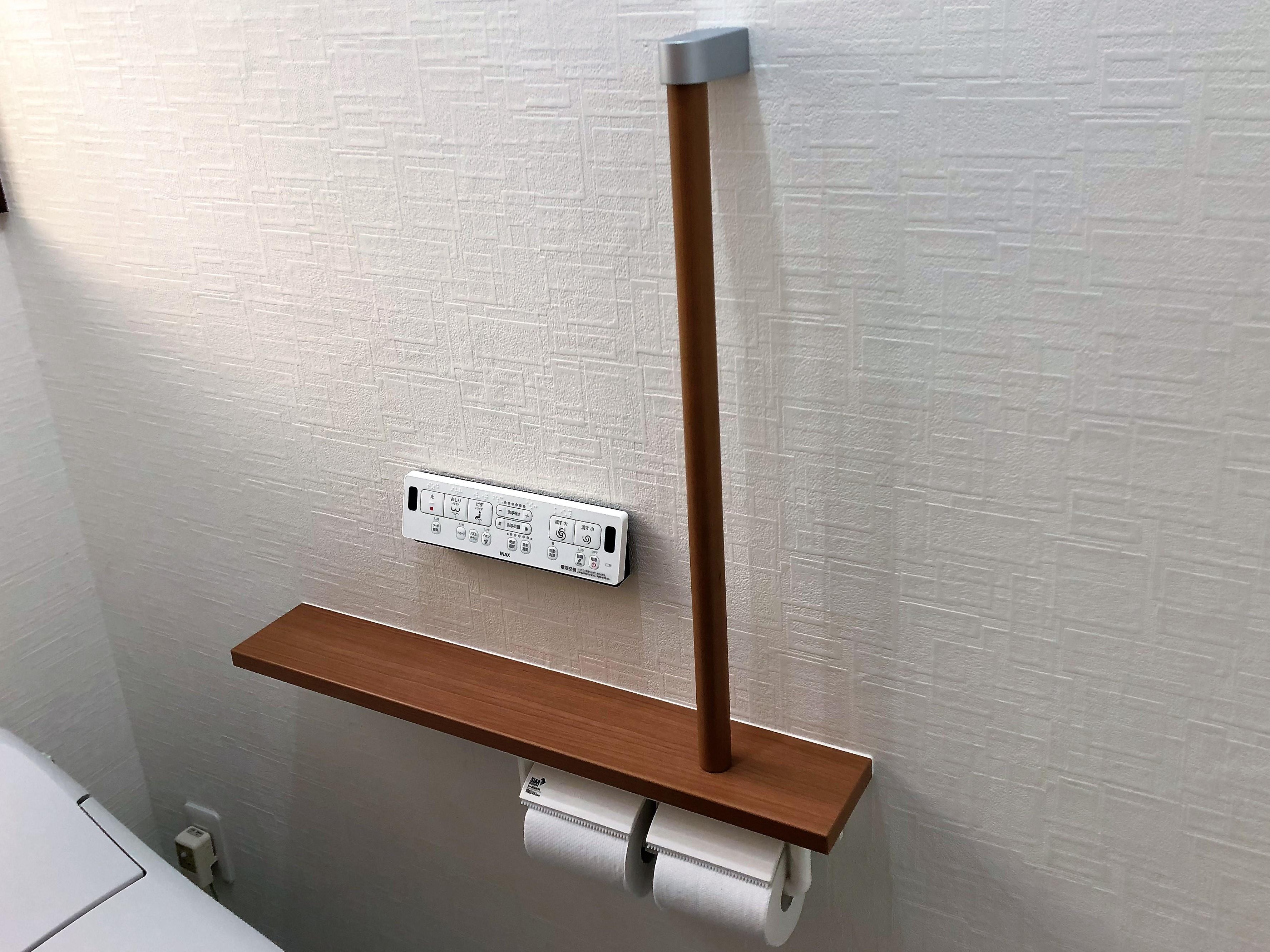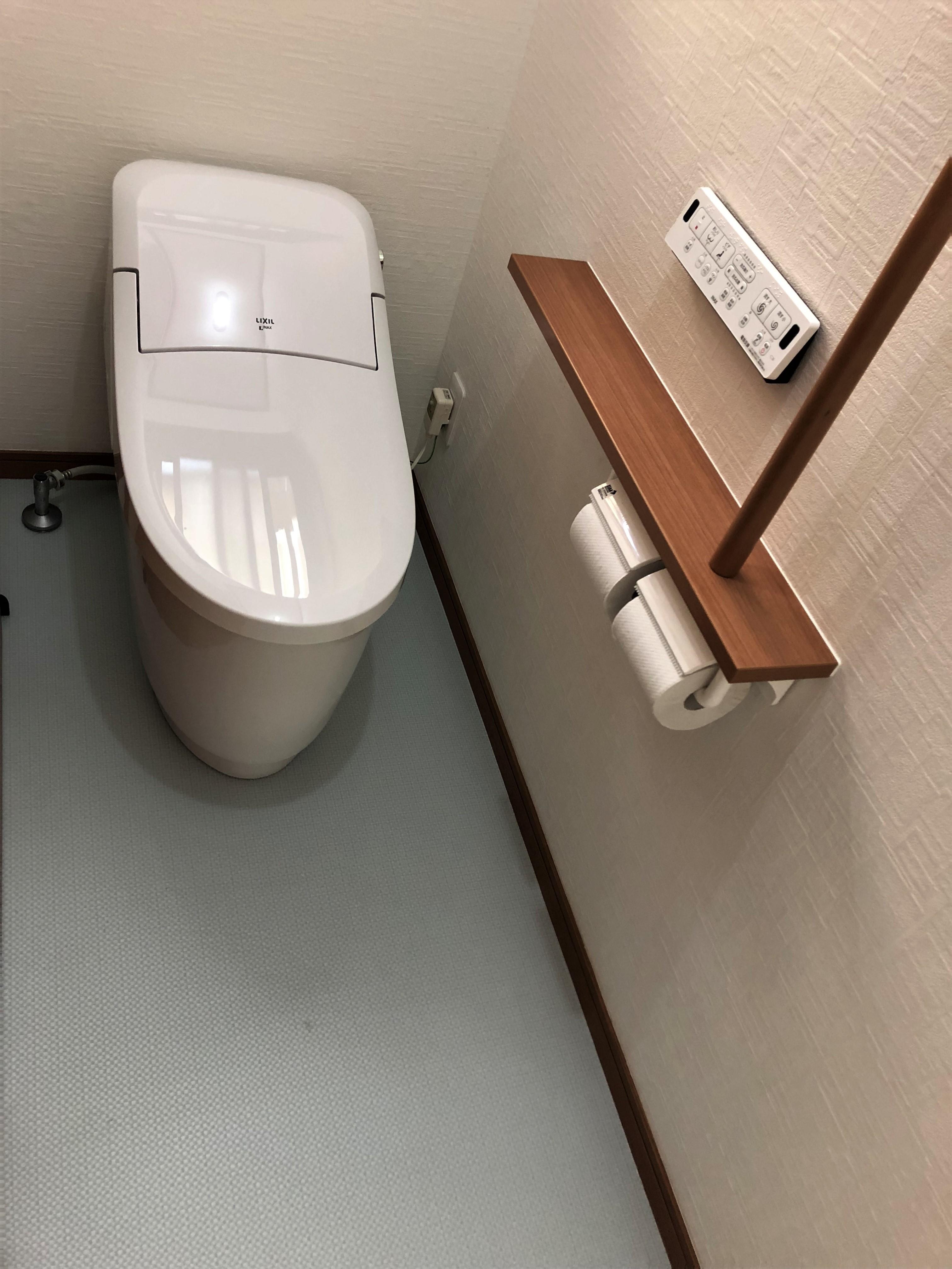 床解体を含む改装工事だったため、工事中は仮設トイレをご利用いただきご不便をおかけしました。トイレの隣が洗面所だったため、手洗い器無しのプレアスLSタイプをお選びいただきました。片引き扉や紙巻器と一体型の手摺を採用することで、限られた空間をすっきりまとめました。
