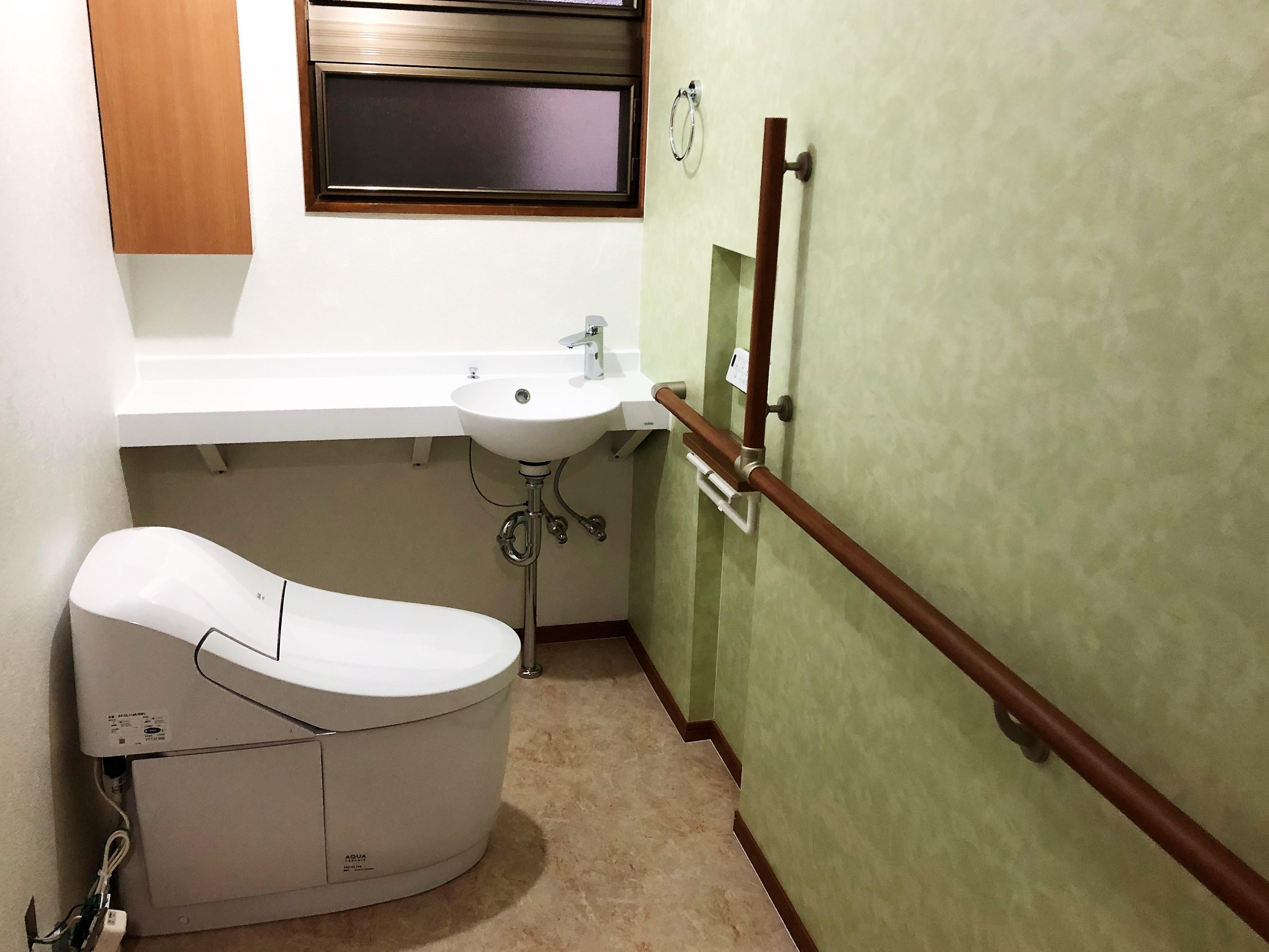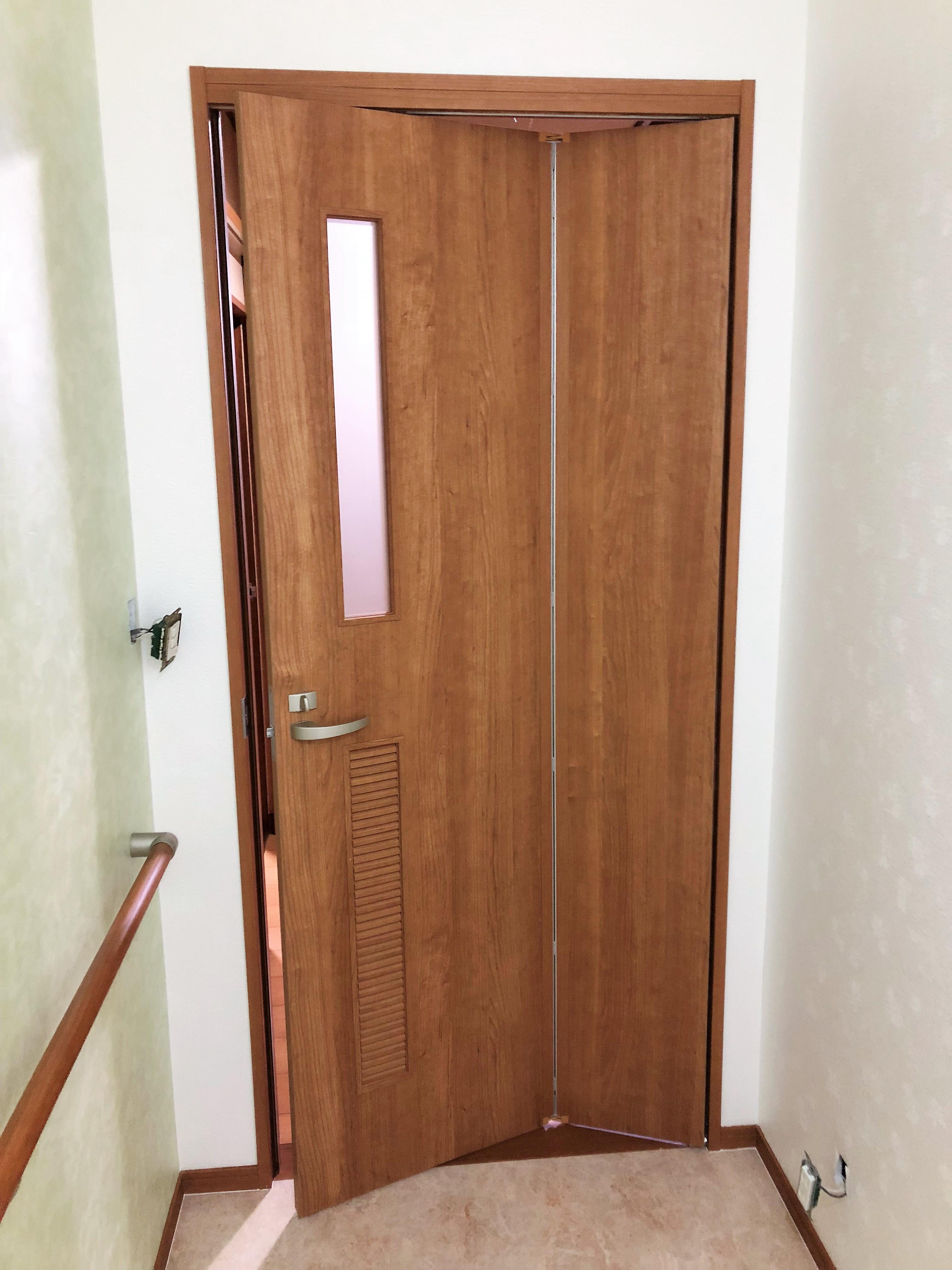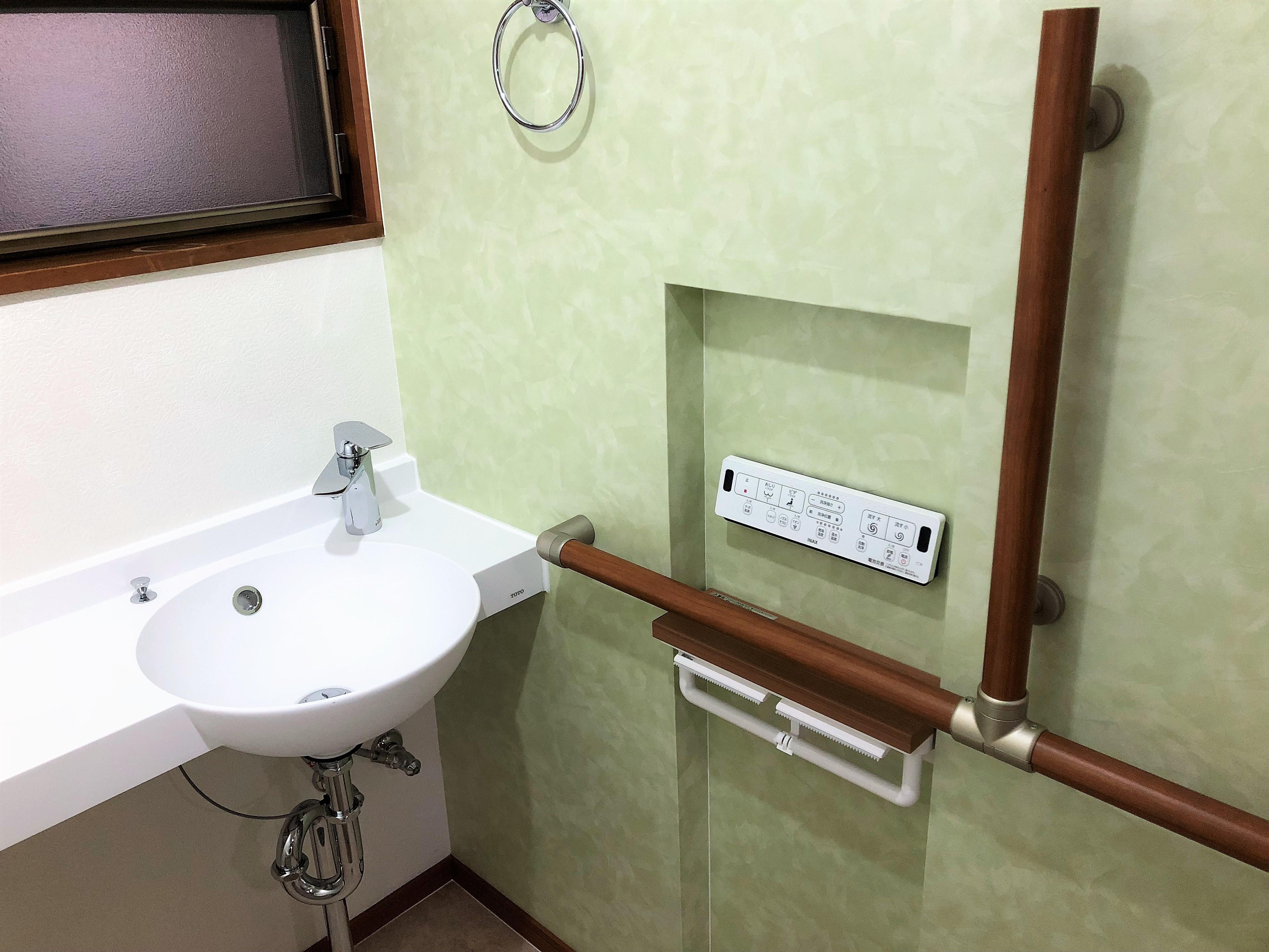 洋式トイレと小便器が間仕切で分けられ、空間はあるのに狭く暗いイメージだったトイレを、洋式トイレだけの1部屋としました。生活に歩行器や手摺が必要となった旦那様の使い易さを考え、床の段差をなくし、開口の広い扉へ変更しました。一連の動作や動線を考え、何度も打合せを行いトイレや手洗い器、手摺の配置を検討し、このような仕上がりになりました。