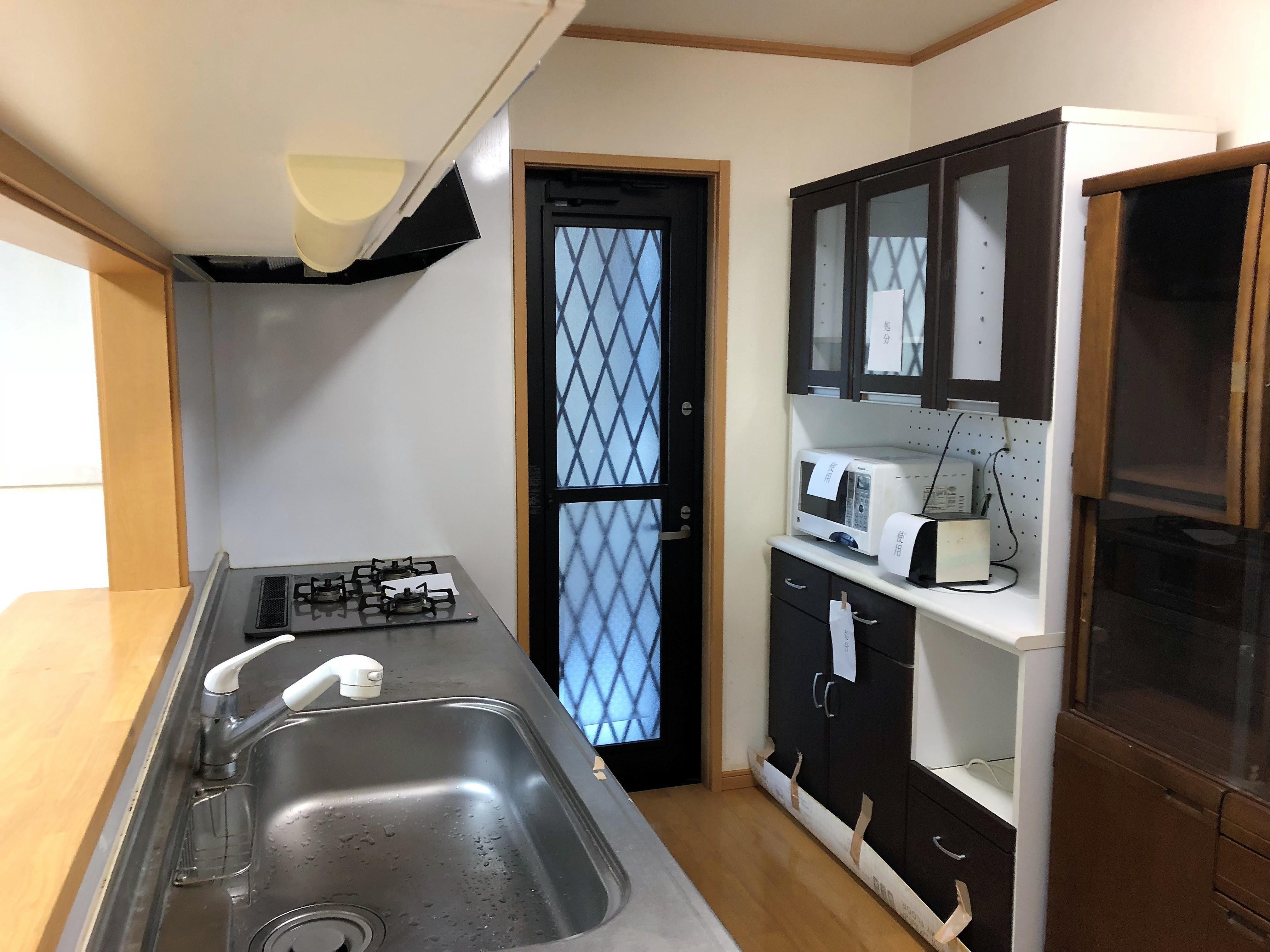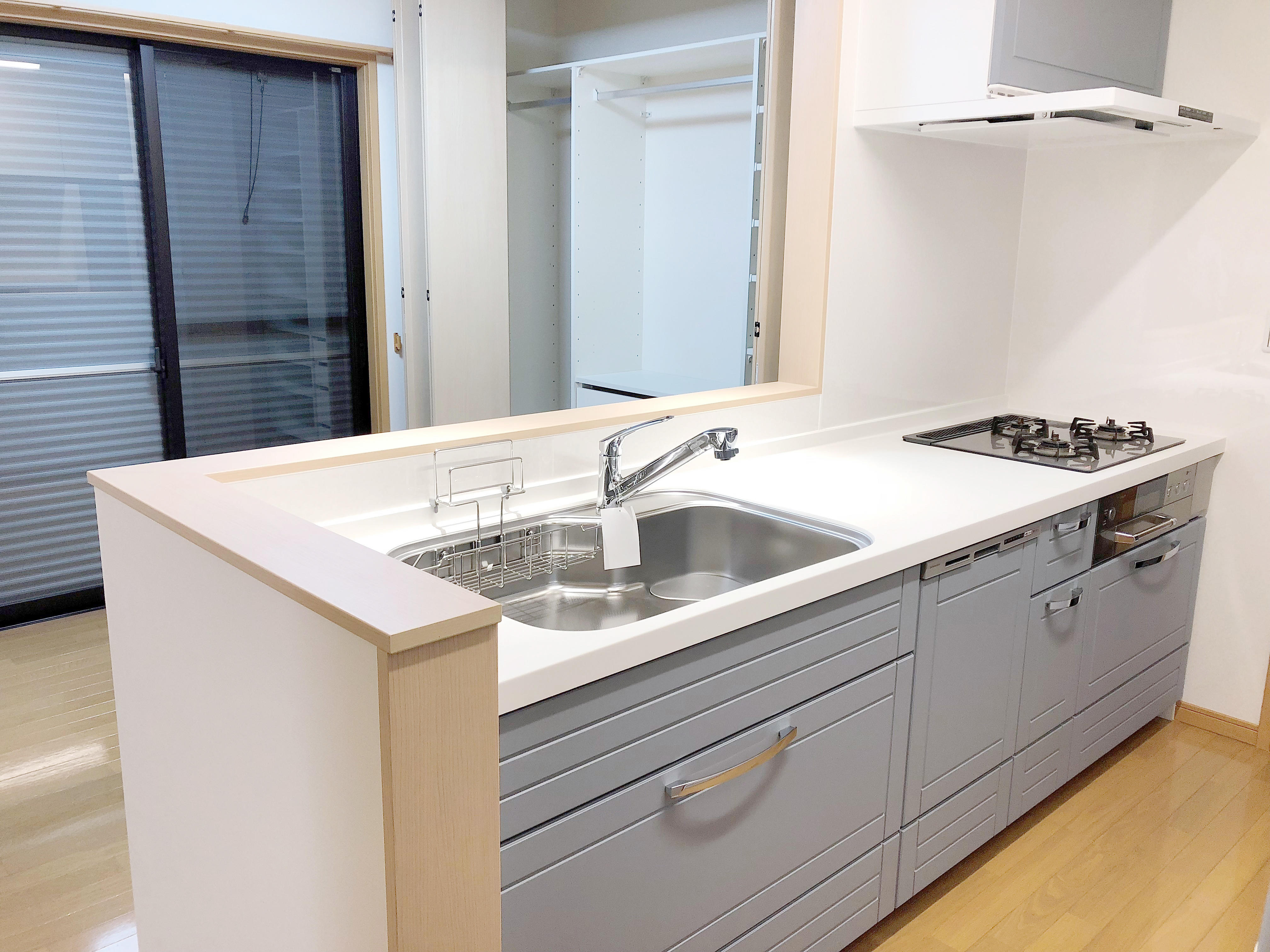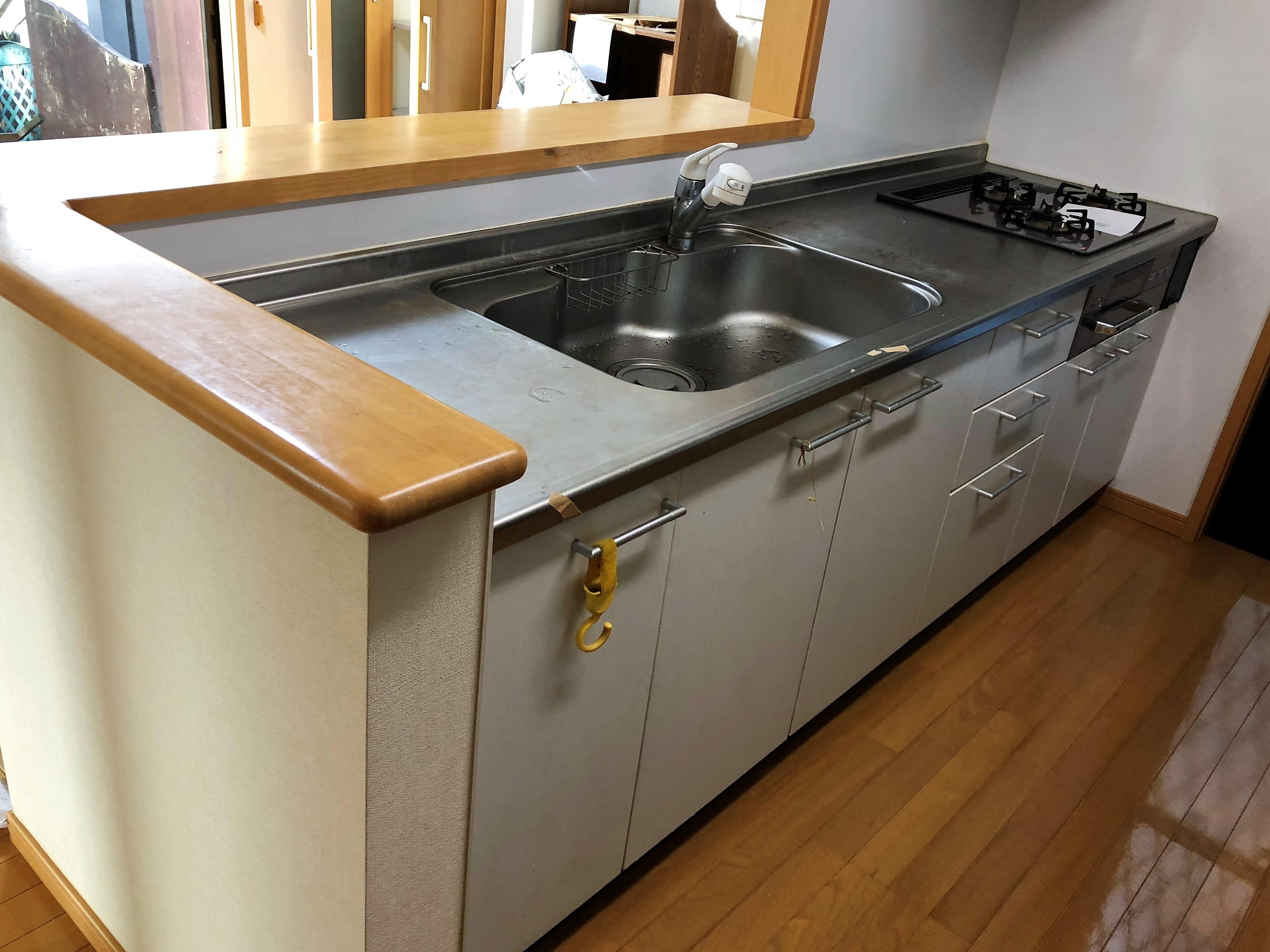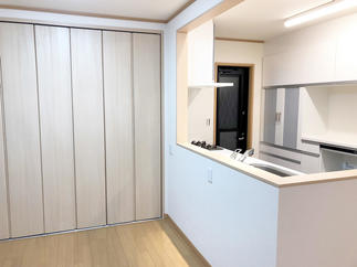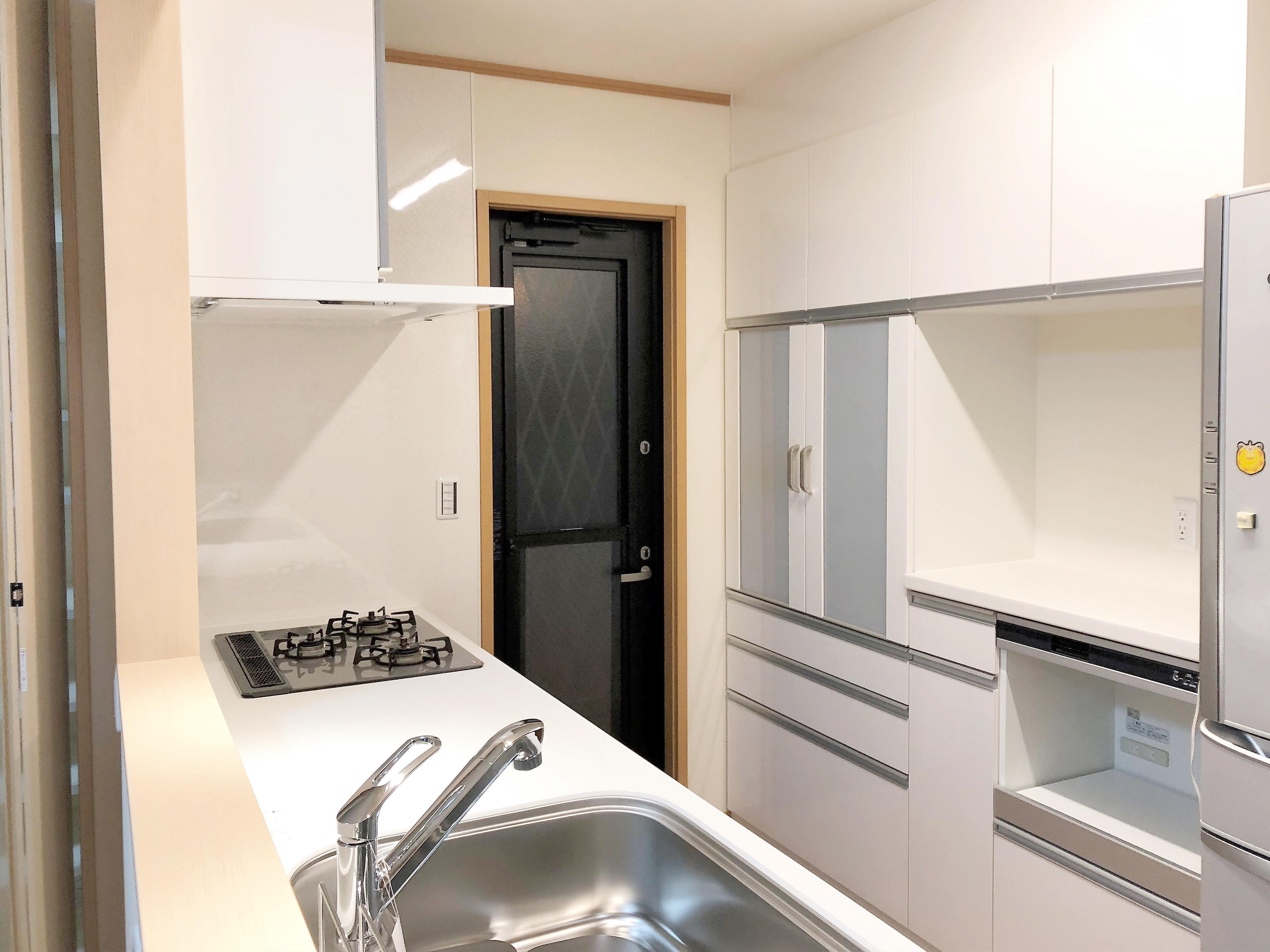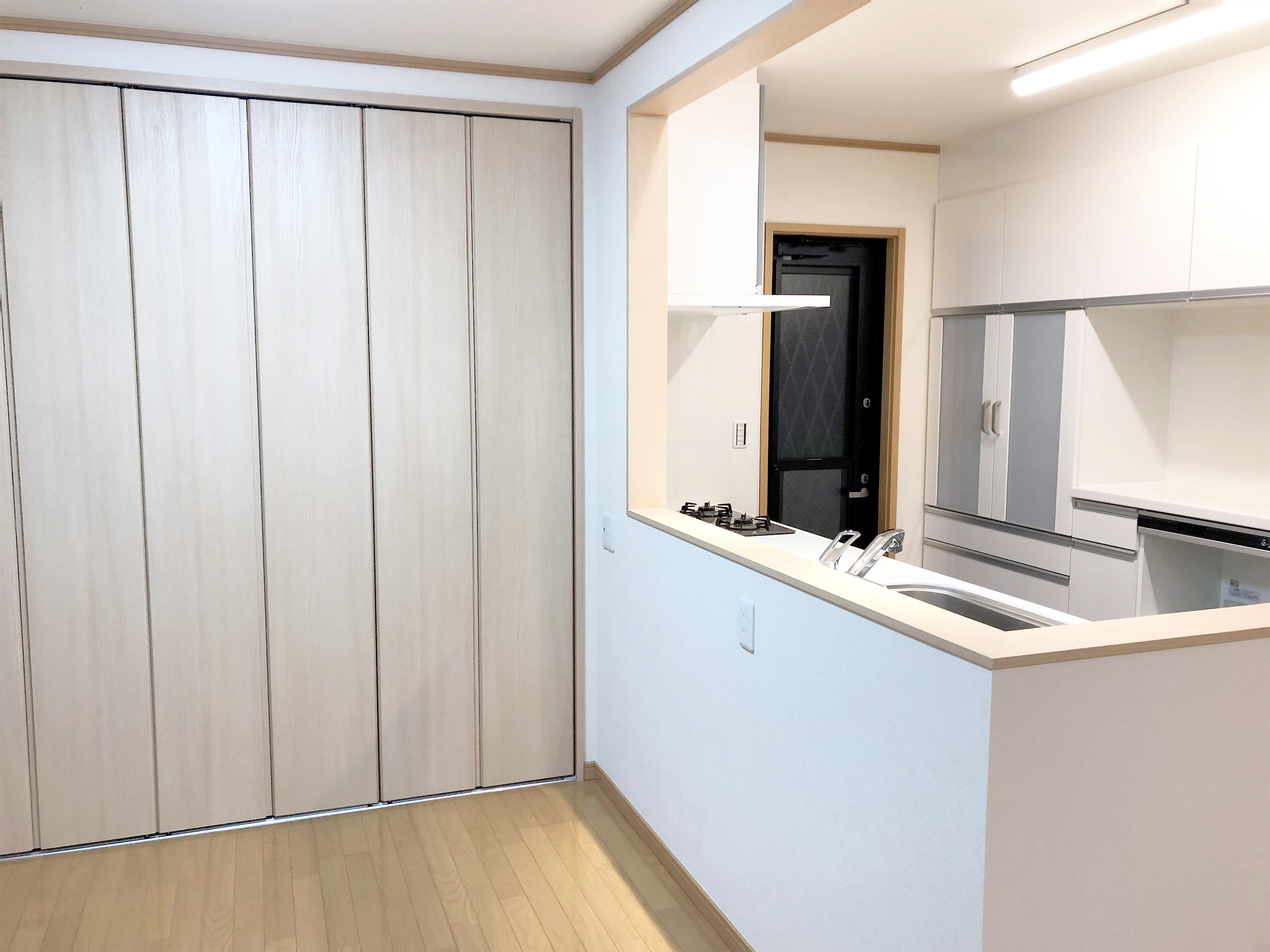 限られたスペースで、収納力を増やしつつ狭くならないダイニングキッチンをご夫婦と一緒に考えていきました。使用頻度の少ない吊戸棚を撤去し、ダイニングとキッチンに繋がりを設けひとつの空間としました。(新しいキッチンは、キャビネットの収納力があるため吊戸棚がなくても十分です)