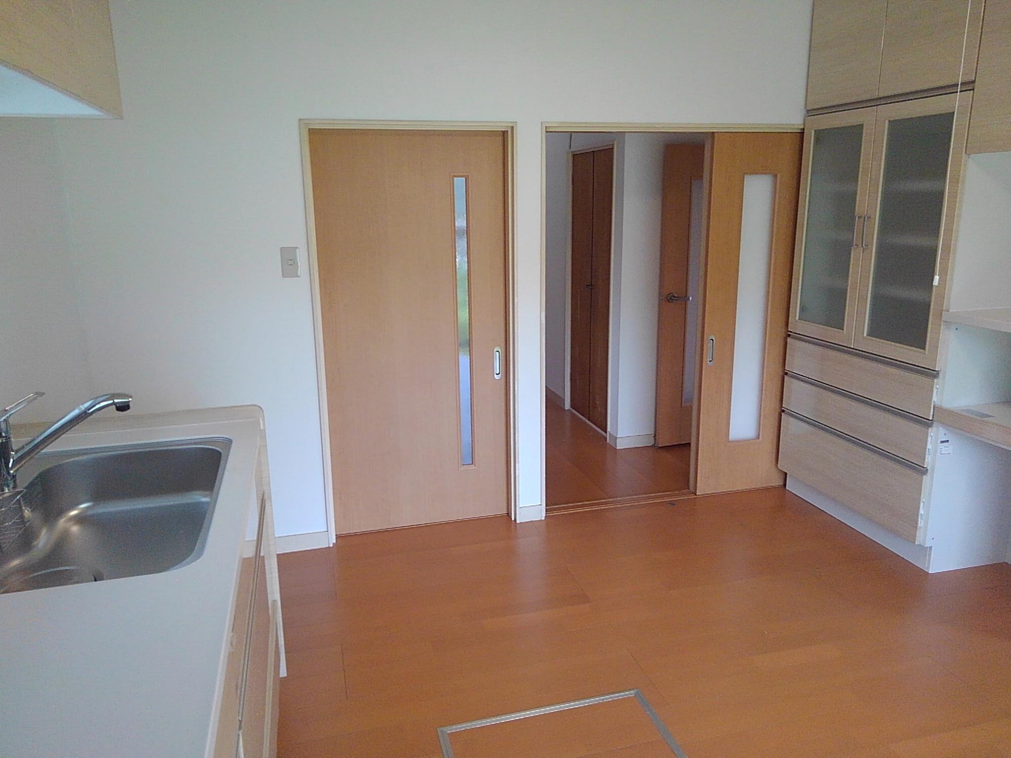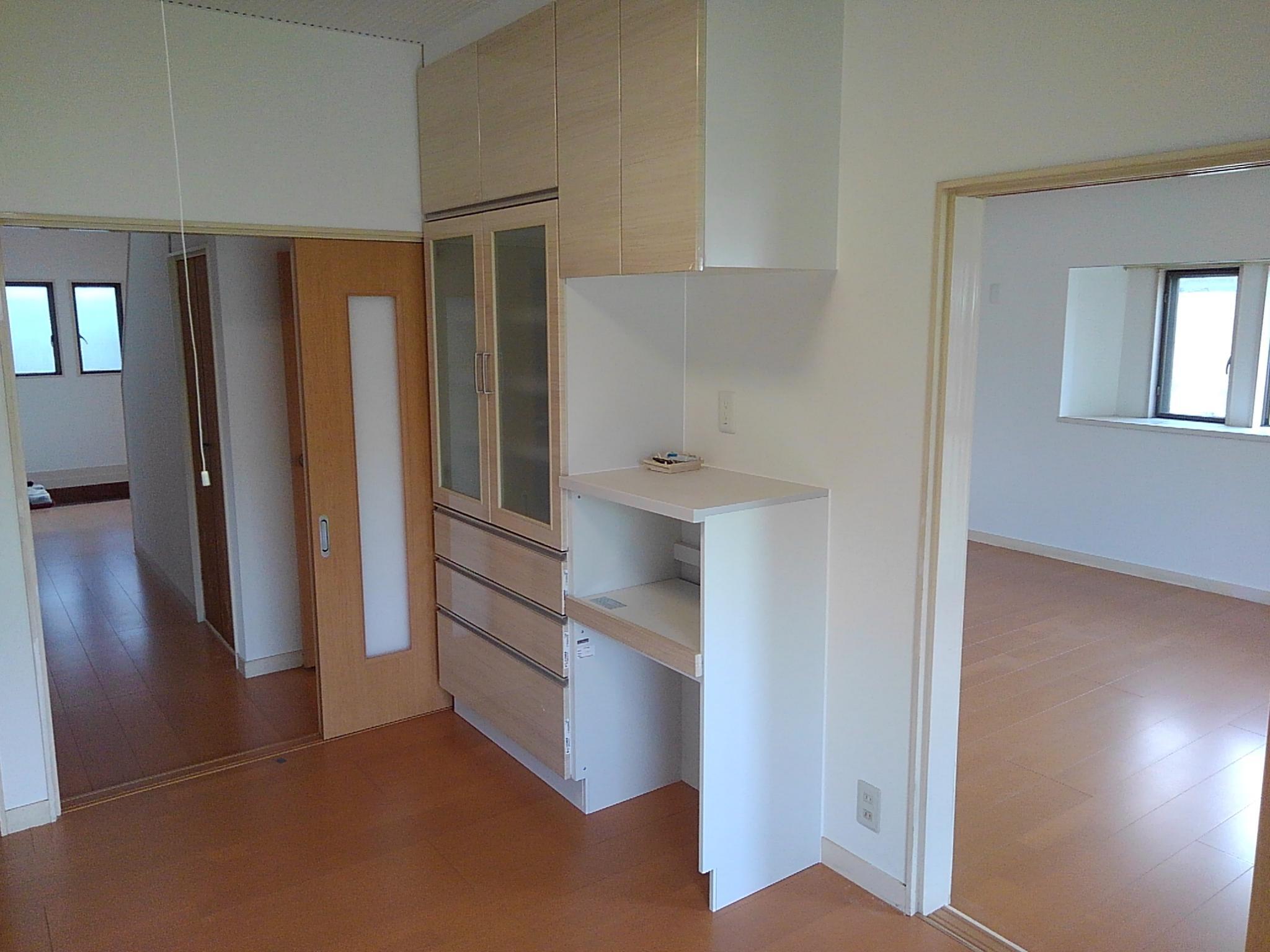 ダイニングキッチン-リビングの連続性はあっても各々プライベートを守れるような間取りをそのまま維持しました。カップボードも設置して収納力もアップしました
