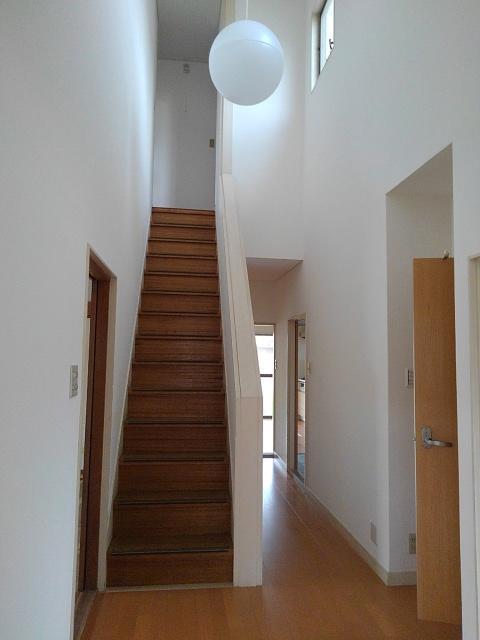 もともと、吹き抜けがあって素敵な玄関ホールでした。フローリング貼、クロスの張替、照明器具の交換を施工しました。皆さんはわかりますか?ホールの照明器具の大きさ、これも新規で付けました。