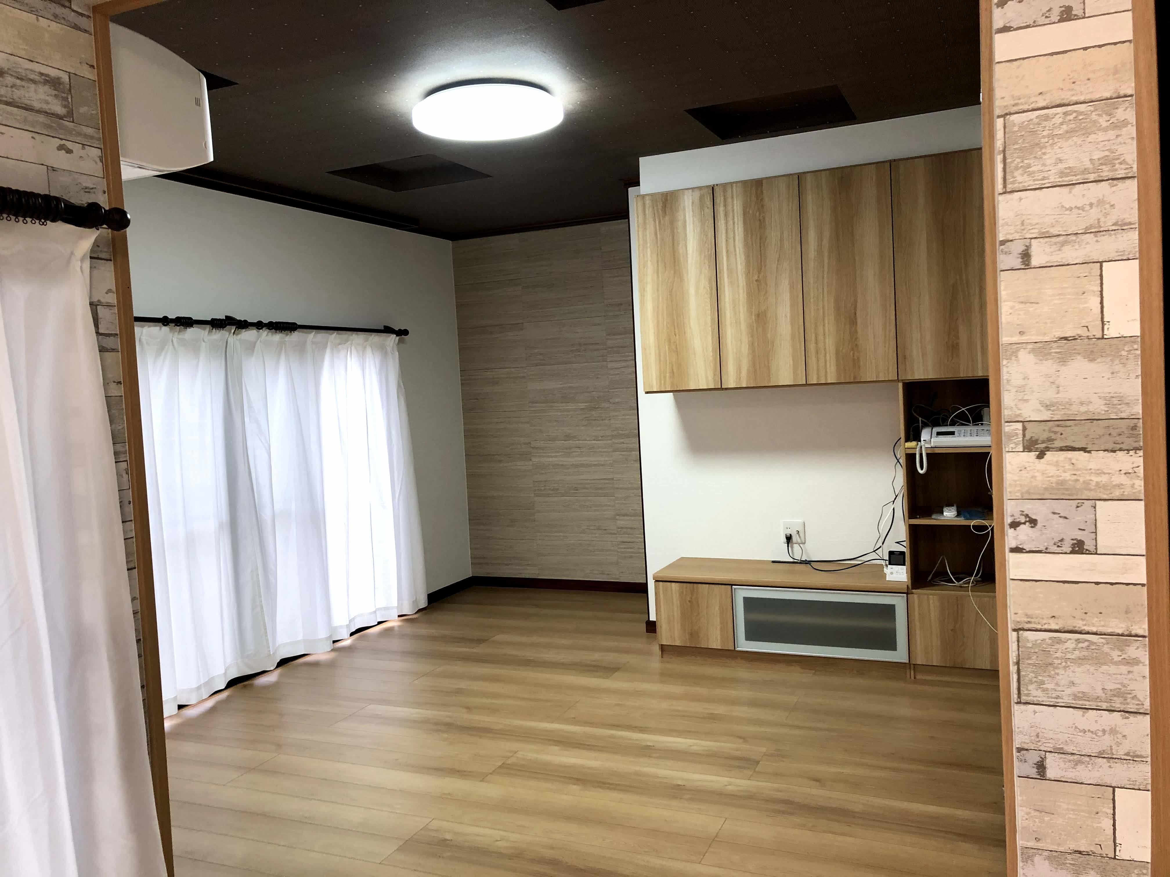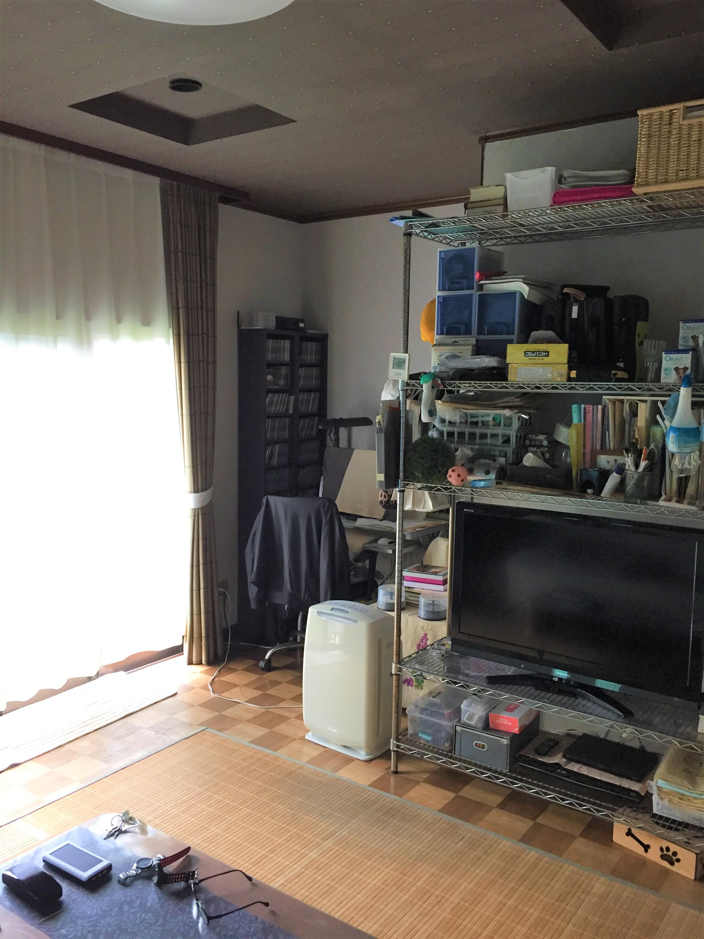 きれいに分類わけされたラック収納でしたが、日常的に使用する物が多いせいかごちゃごちゃした印象になってしまうのがお悩みでした。扉つきの収納を取付け、スッキリしました。床の張替も行い、より明るい印象のリビングに生まれ変わりました。