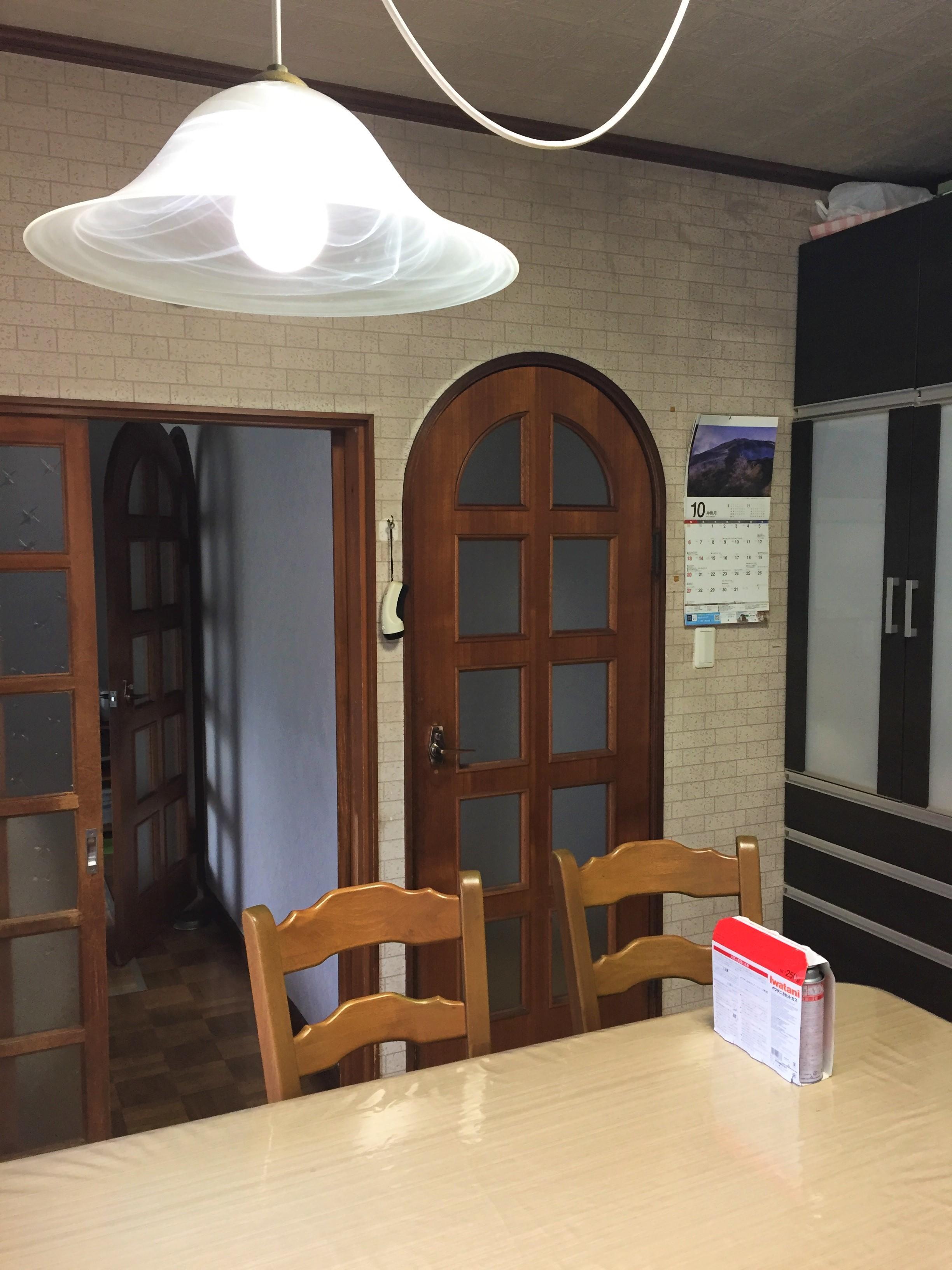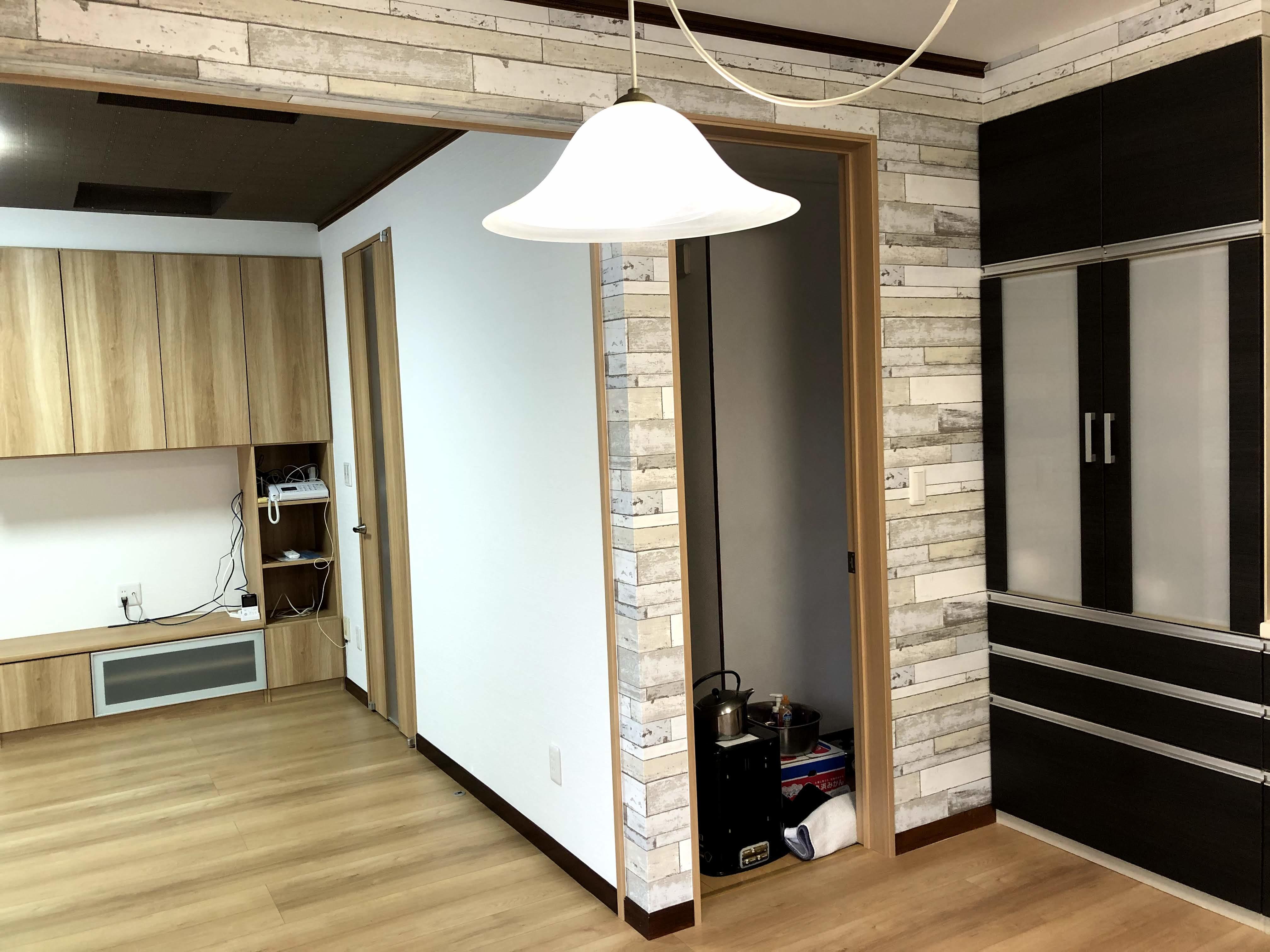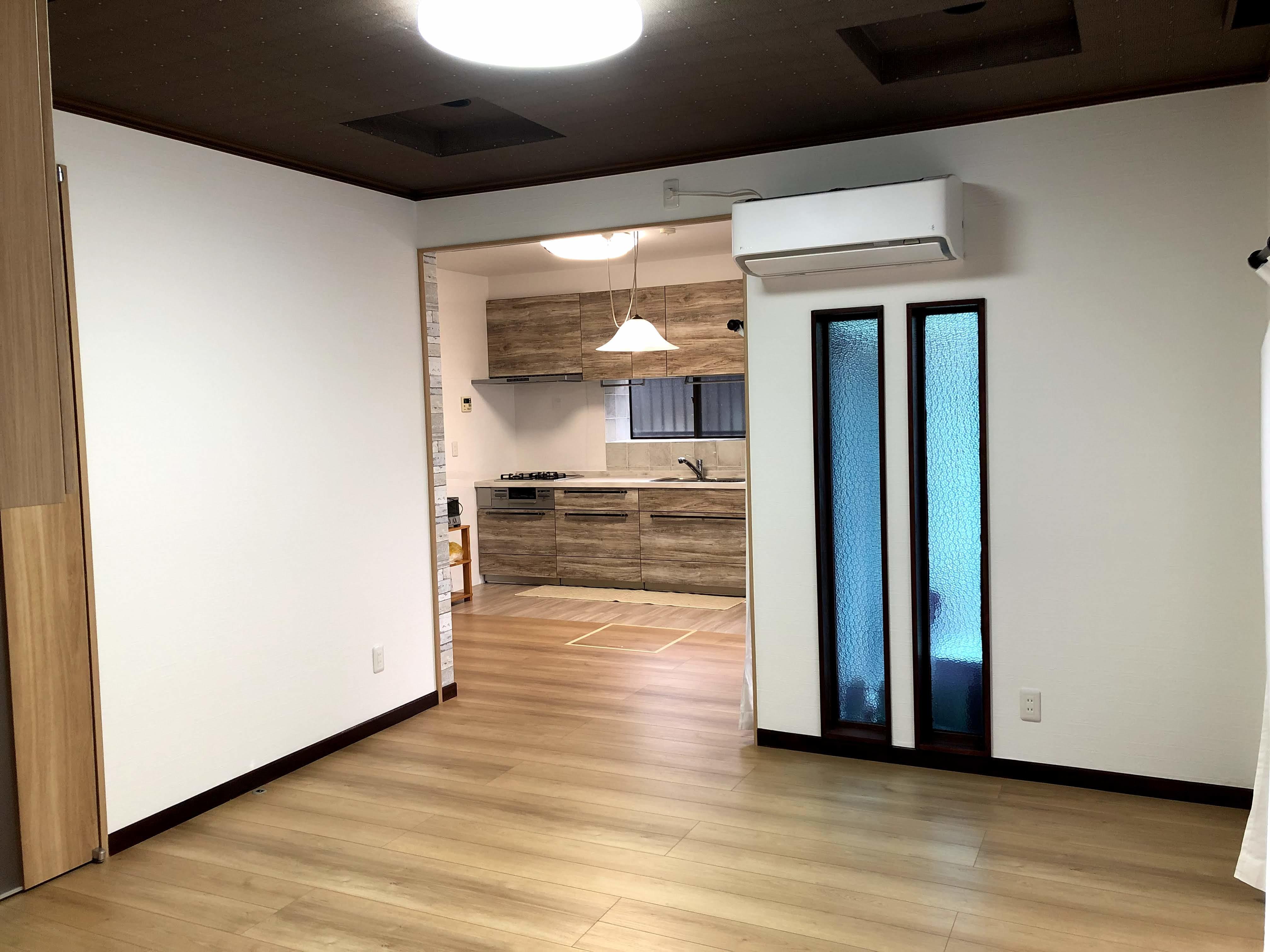 ダイニングキッチンとリビングが分かれた間取りでした。 間仕切りを撤去、食事を楽しみながらテレビを見たり、家族や愛犬とのコミュニケーションも楽しい快適空間になりました。 廊下からダイニングキッチンへ繋がる扉の高さを高くし、敷居も撤去、足元の段差も軽減しました。