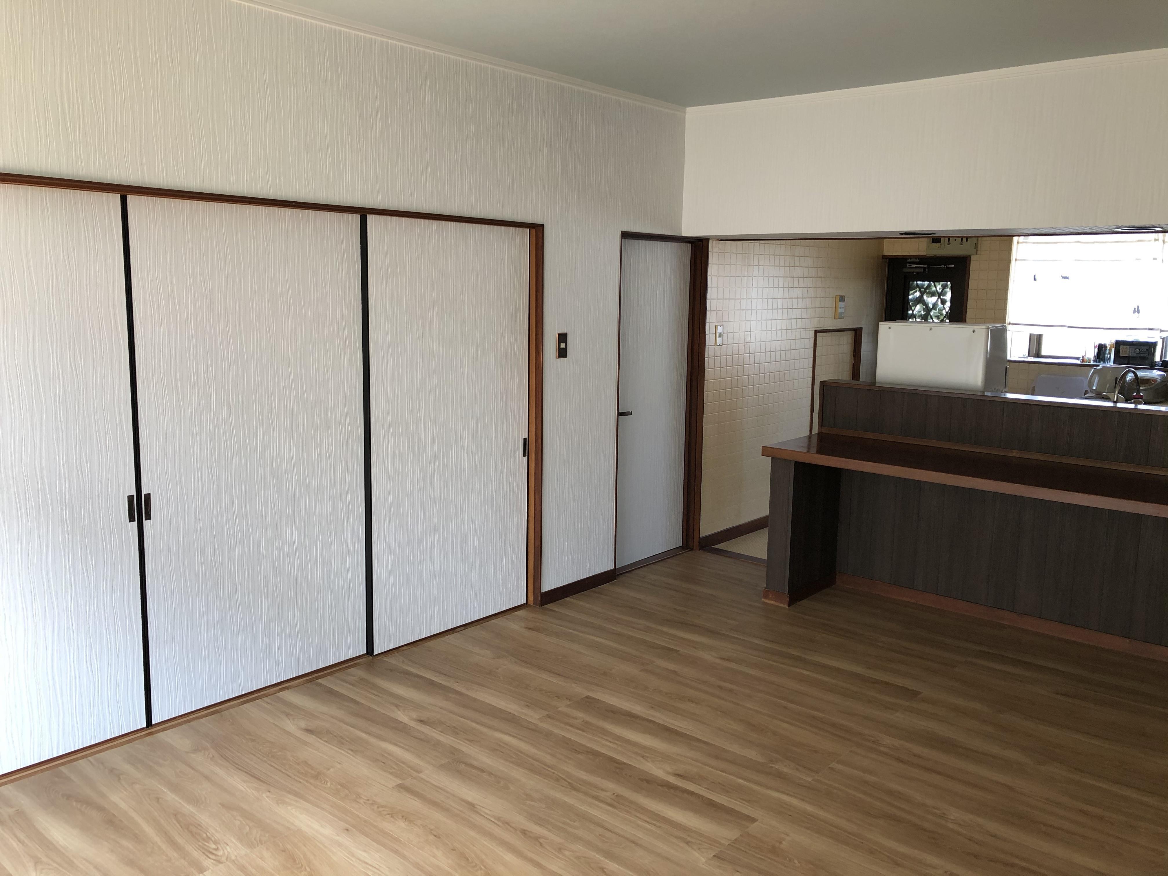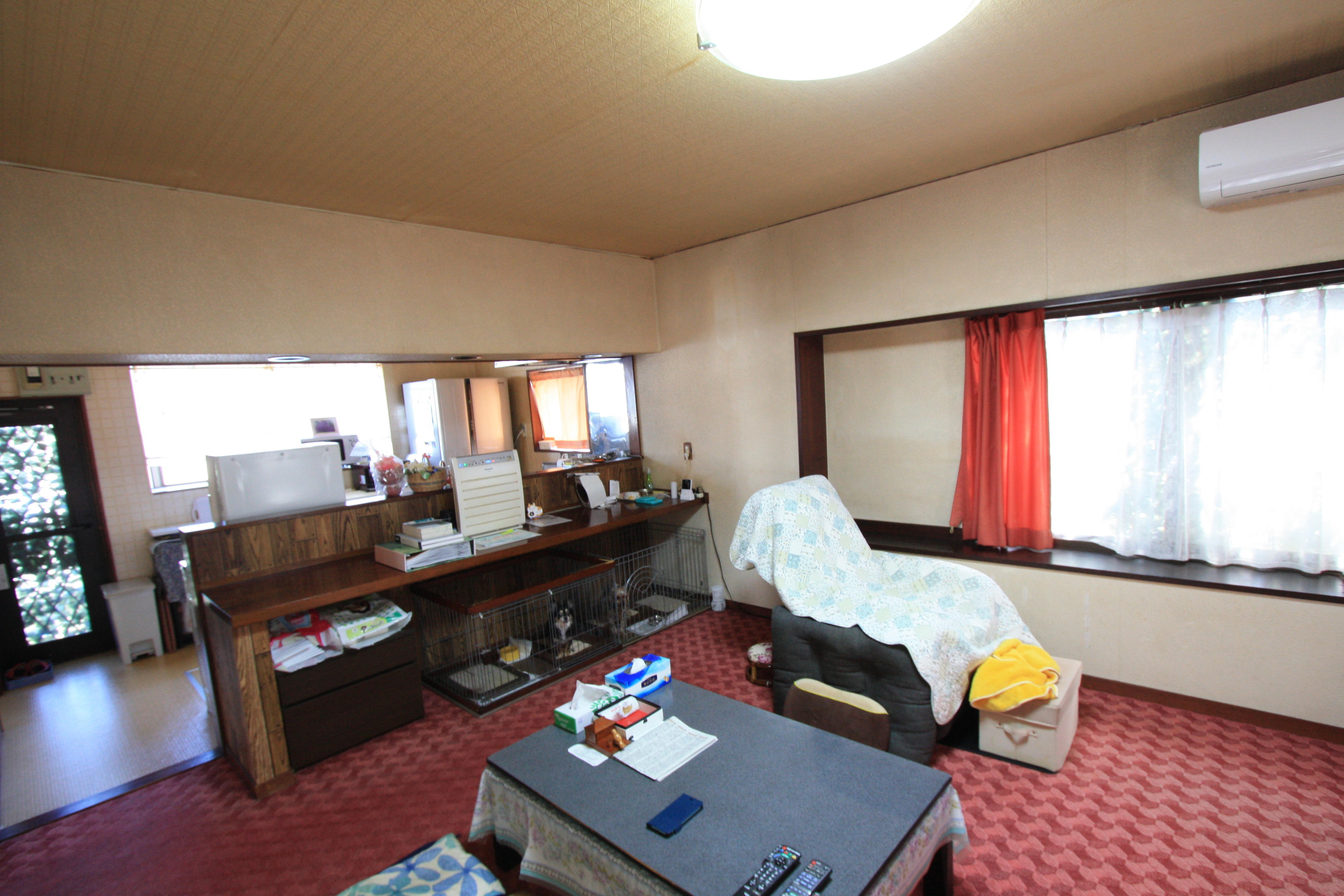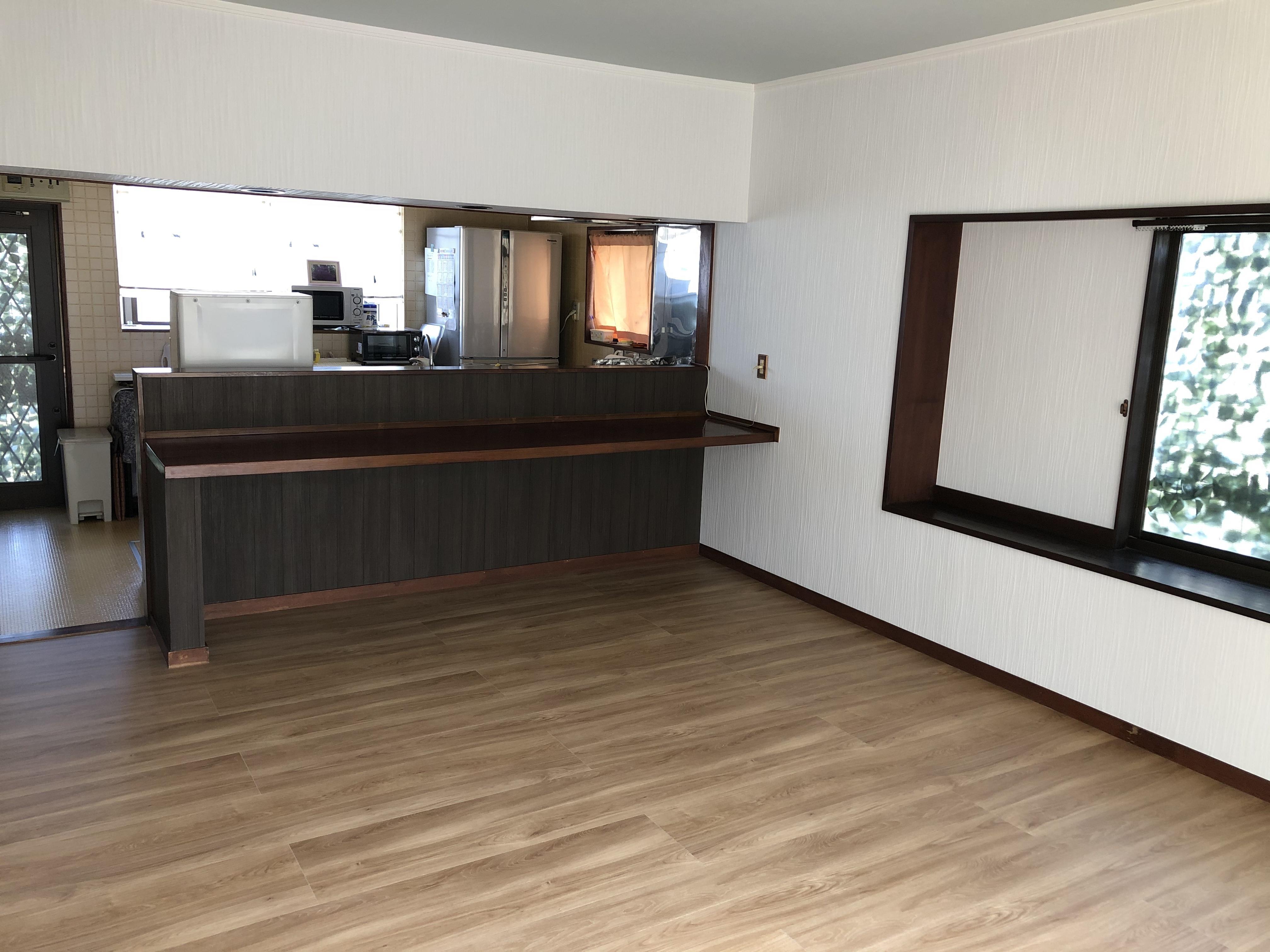 リビングの床のリフォームの相談で来社されました。ご自宅に伺うとかわいいワンちゃんが2匹出迎えてくれました。 今の絨毯の床ではいくら掃除しても奥まで掃除しきれないと言ったお悩みがあり、今回思い切ってペットが歩いても大丈夫なフローリングに替えたいとのご希望でした。フローリングに替えるのと同時に壁・天井のクロスの張替え、カーテンの交換も追加され部屋が全体的に明るい印象になりました。順調に工事が進みお施主様のご理解、ご協力のおかげと感謝いたします。ありがとうございました。