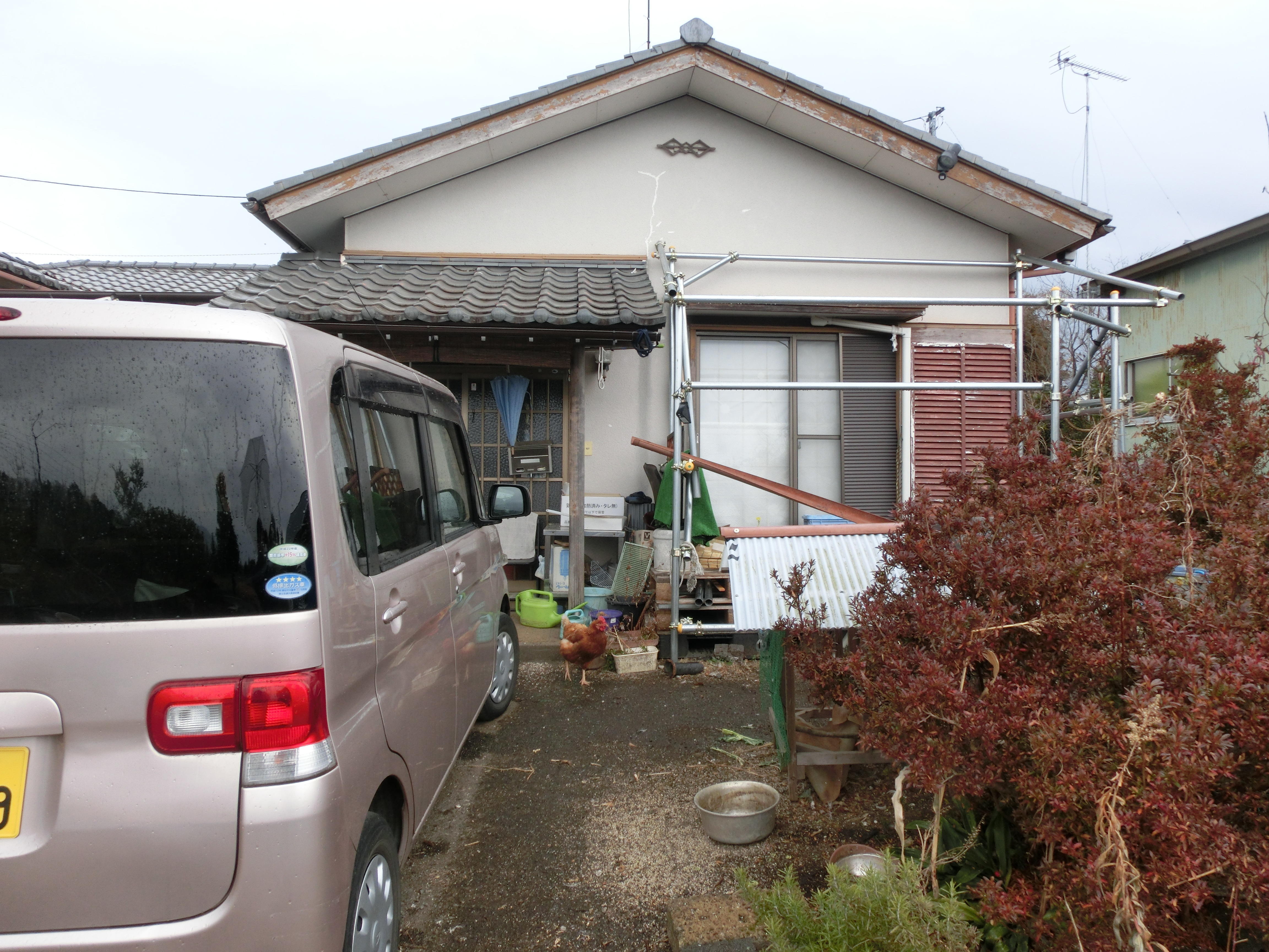 屋根-平板瓦葺き 外壁-ノダハイベストウッド下地防火サイディング ベタ基礎 土台-桧 通し柱-桧4.0寸角 梁-米松KD材 外壁面断熱材 セルロースファイバー 玄関引き戸-採風式バリアフリー対応 サッシ-半樹脂ペアガラス 雨戸-一部採風型