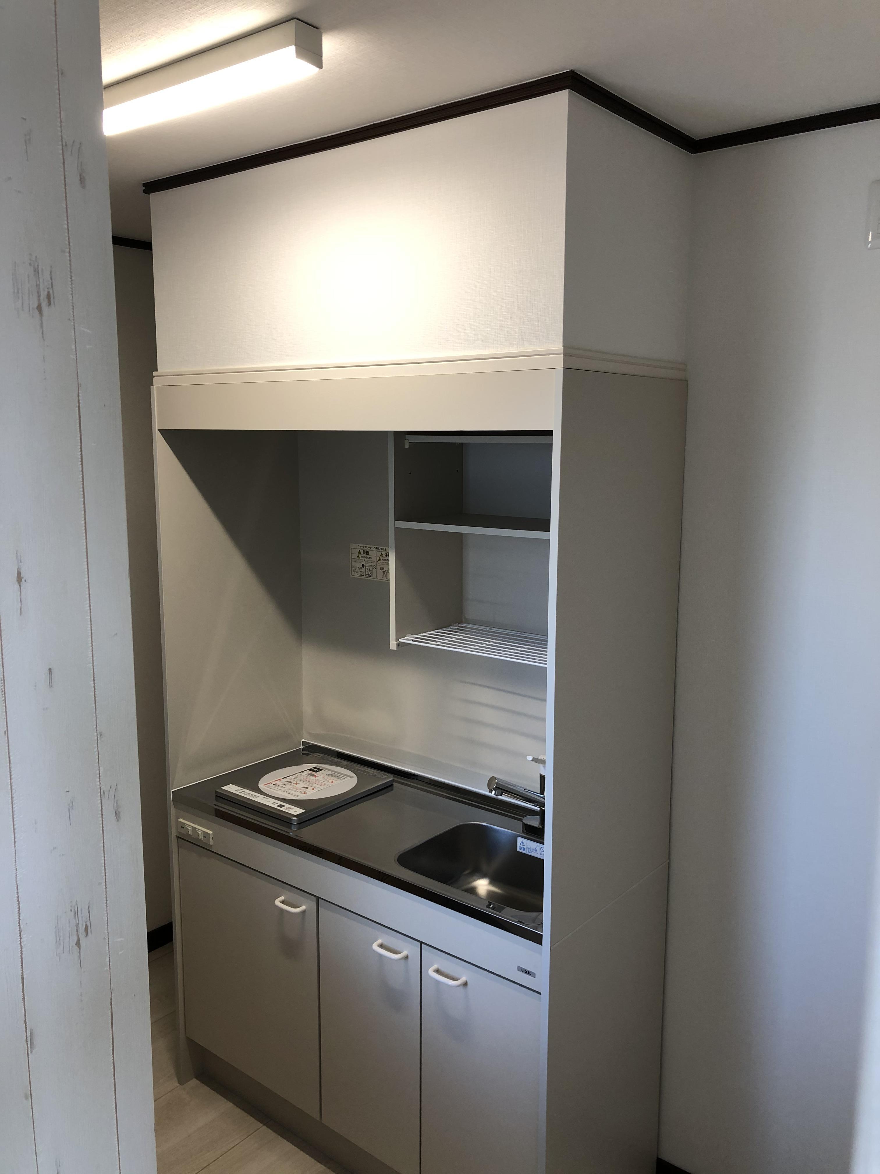 WIC部分にミニキッチンw1200を入れ冷蔵庫スペースと家電置き用のカウンターW1500と可動棚2か所を設置しました。