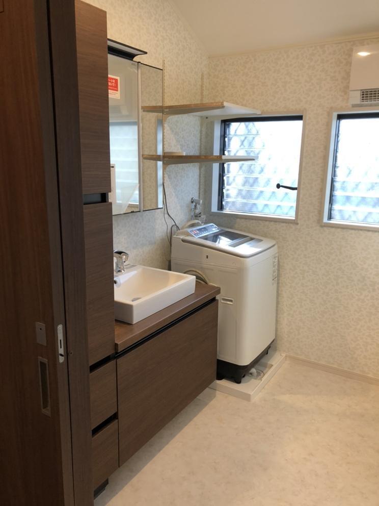 1.0坪洗面脱衣室を1.25坪に拡幅して洗面化粧台にサイドキャビネットを設置、洗濯機上に棚も設置して居住性と収納力がアップしました。