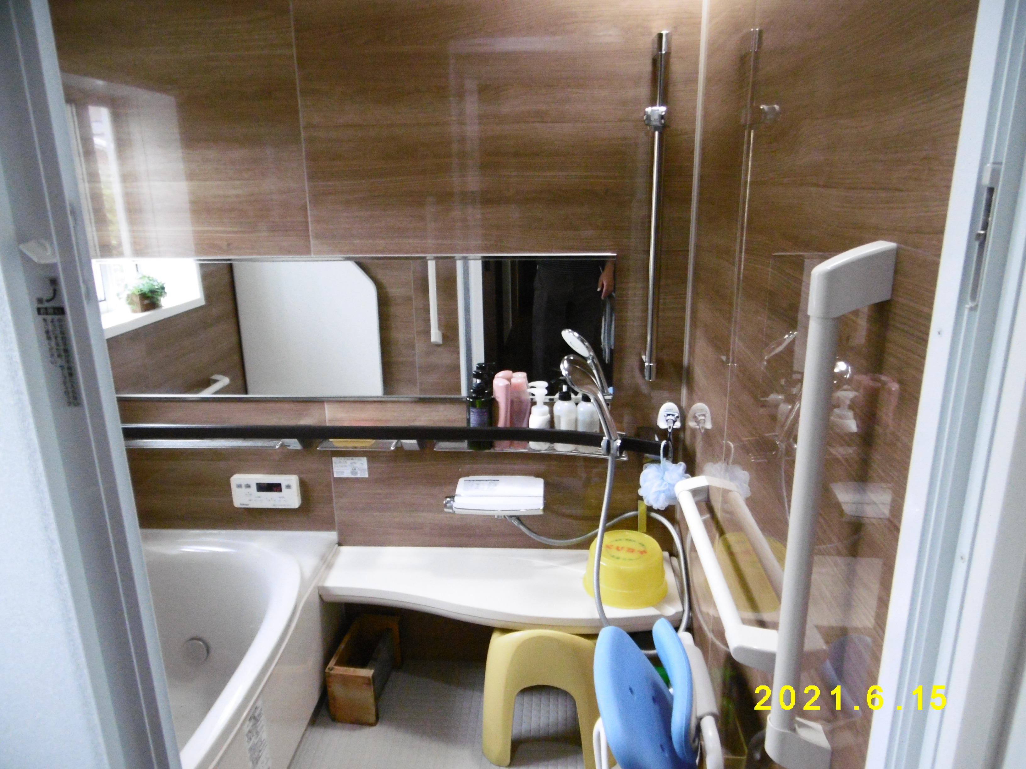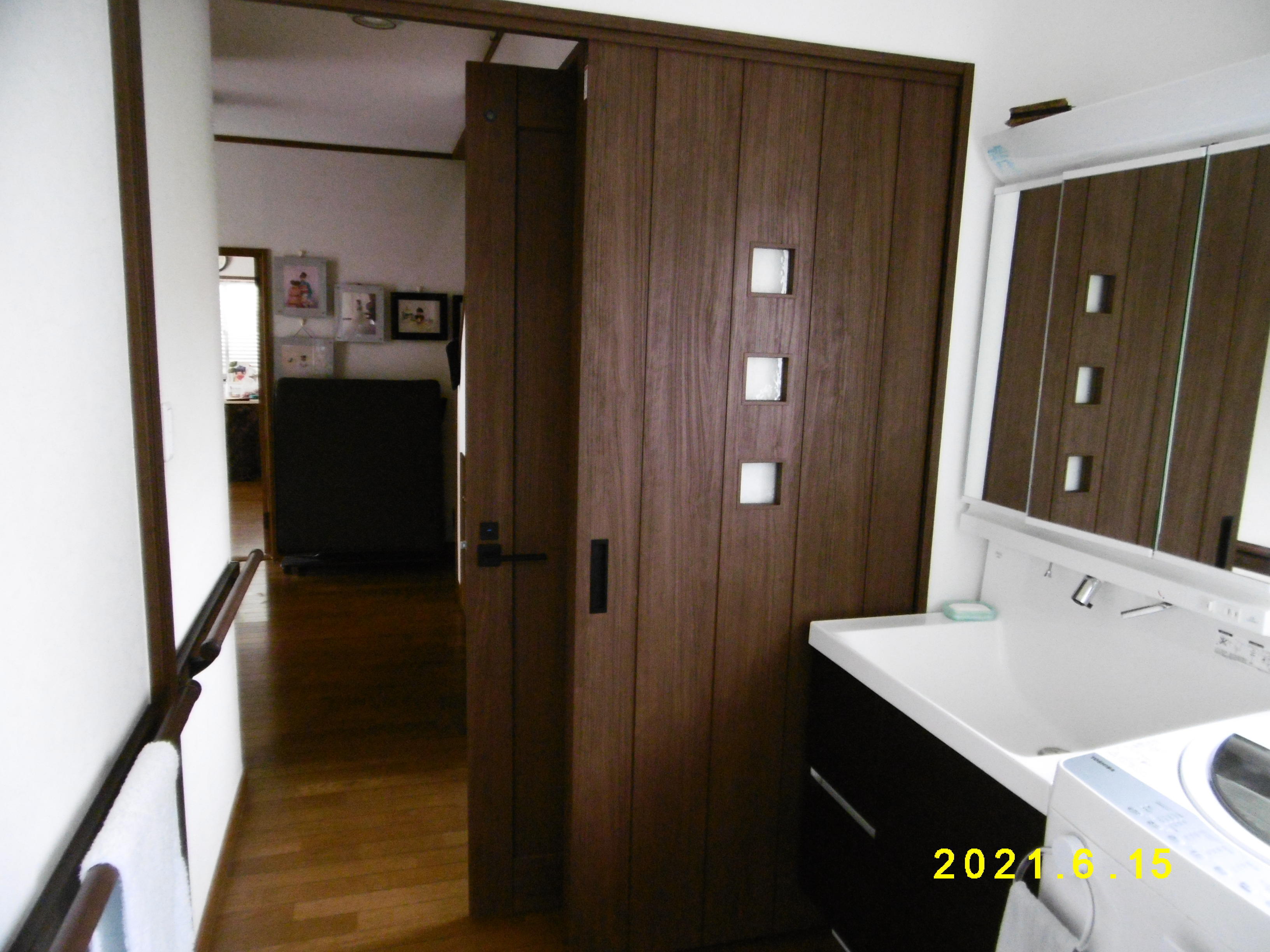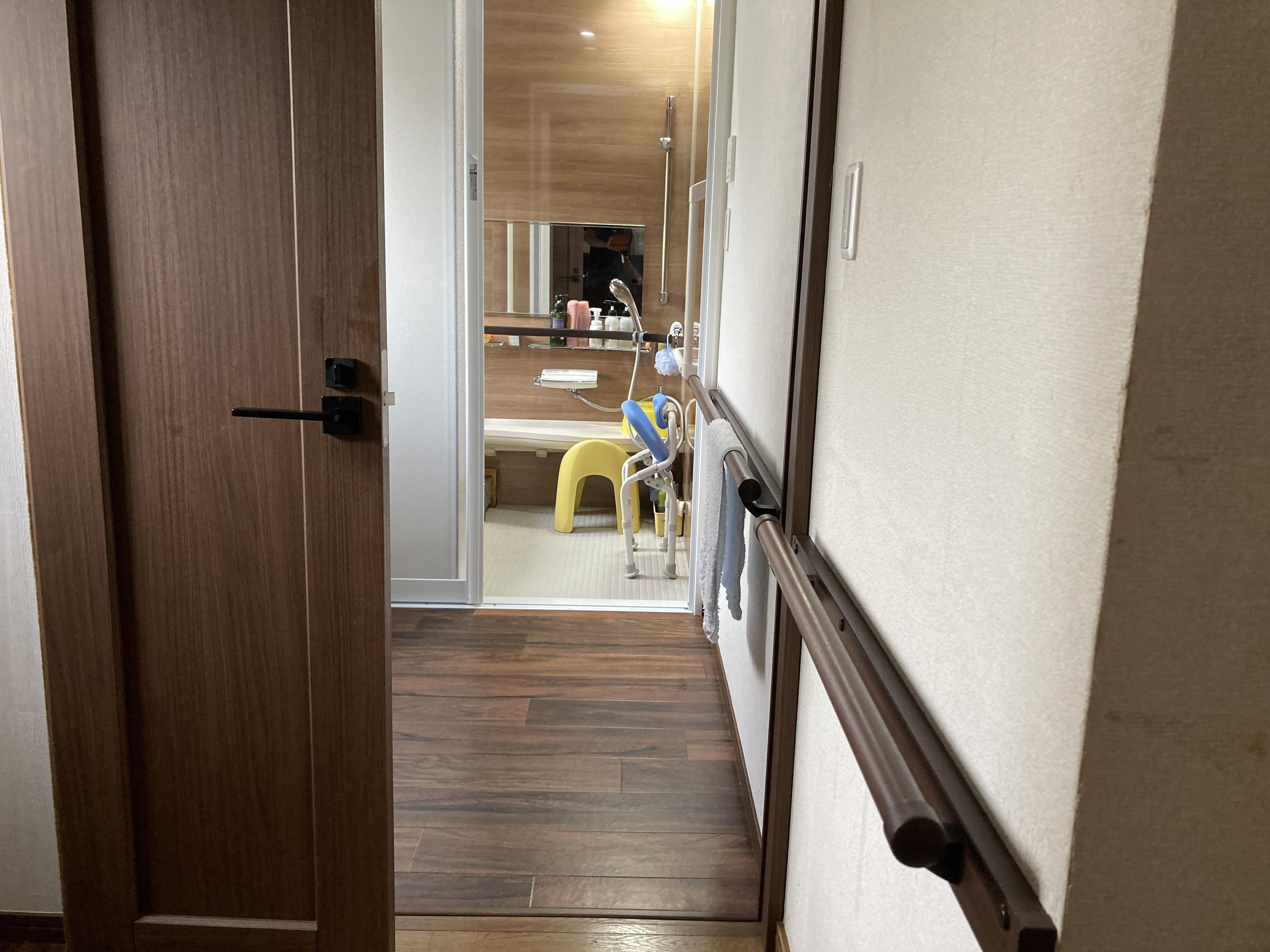 同居している家族の体調の変化によりトイレ洗面浴室を改修したいとの相談でした。部屋の入り口はドアが多く、敷居も床より15mm程上がっていました。 浴室も狭く浴槽も膝を鋭角に折らないと入れない状況でした。 思い切ってホール・トイレ・洗面・浴室の床面積の割合を少し変更して浴室は約10cm広く浴槽も13cm広くなりました。 入口は引戸・折戸となり出入りの際の体の体重移動も少なくなりました。 敷居も撤去しました。 手摺も6ヶ所設置しました。 設備や内装はお施主様のセンスの良さが伺えます。 初めから当社を信頼くださり、工事も順調に行えました。 ありがとうございました。