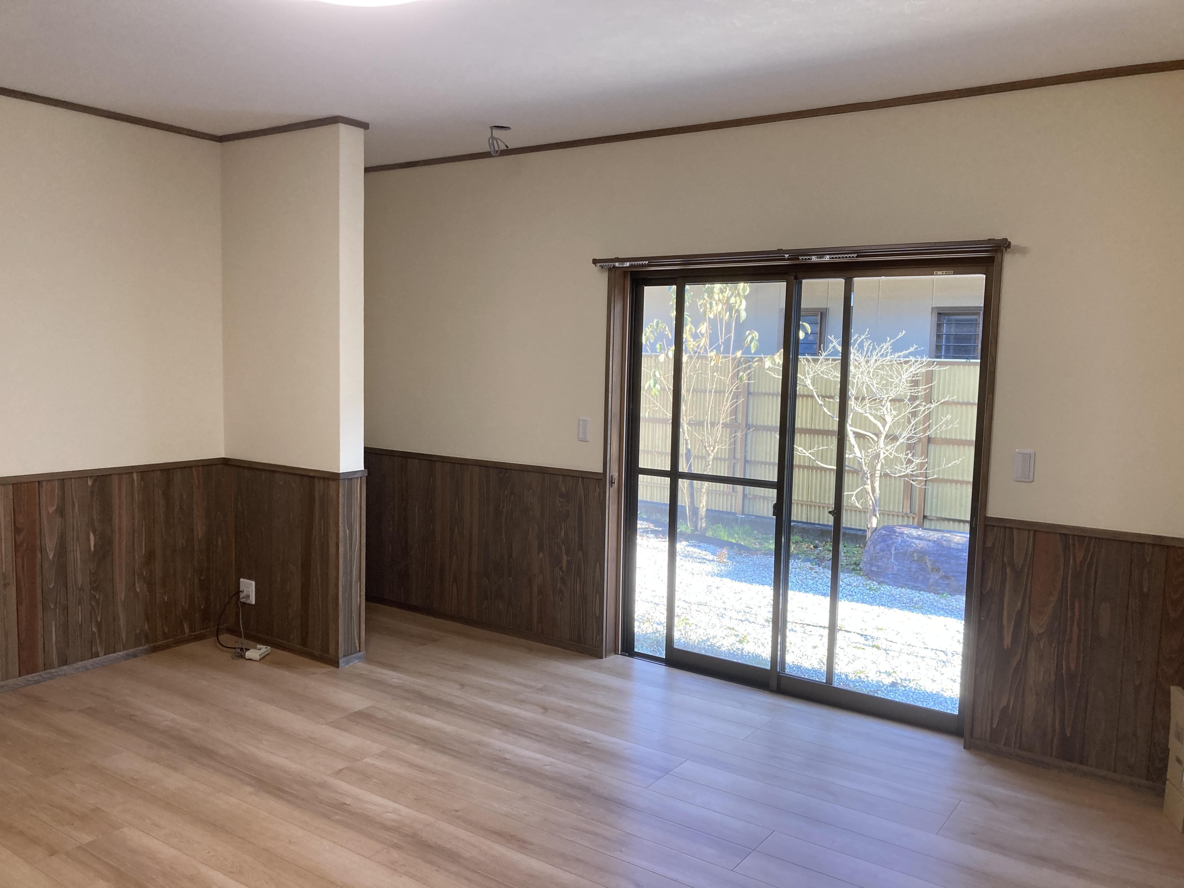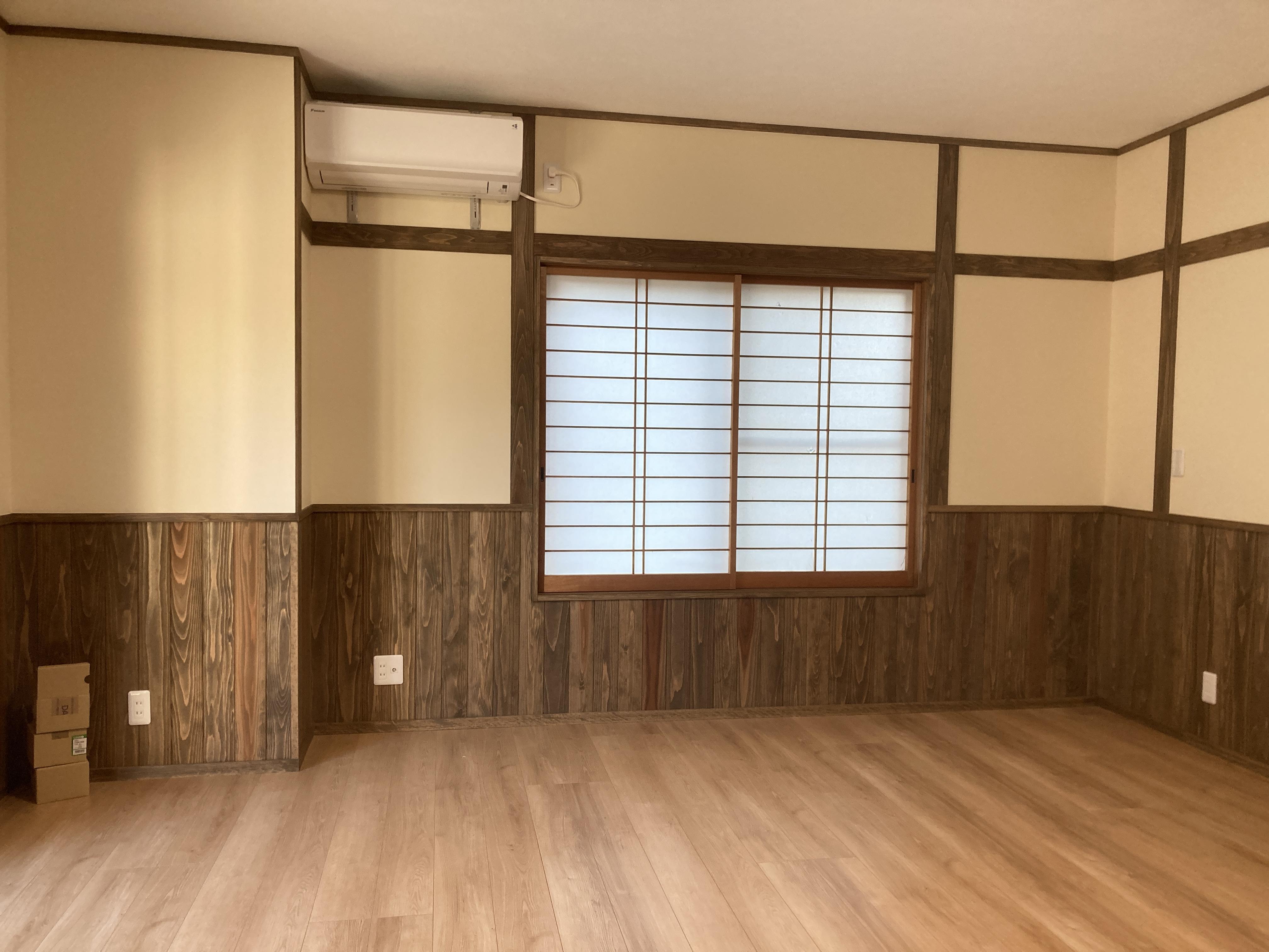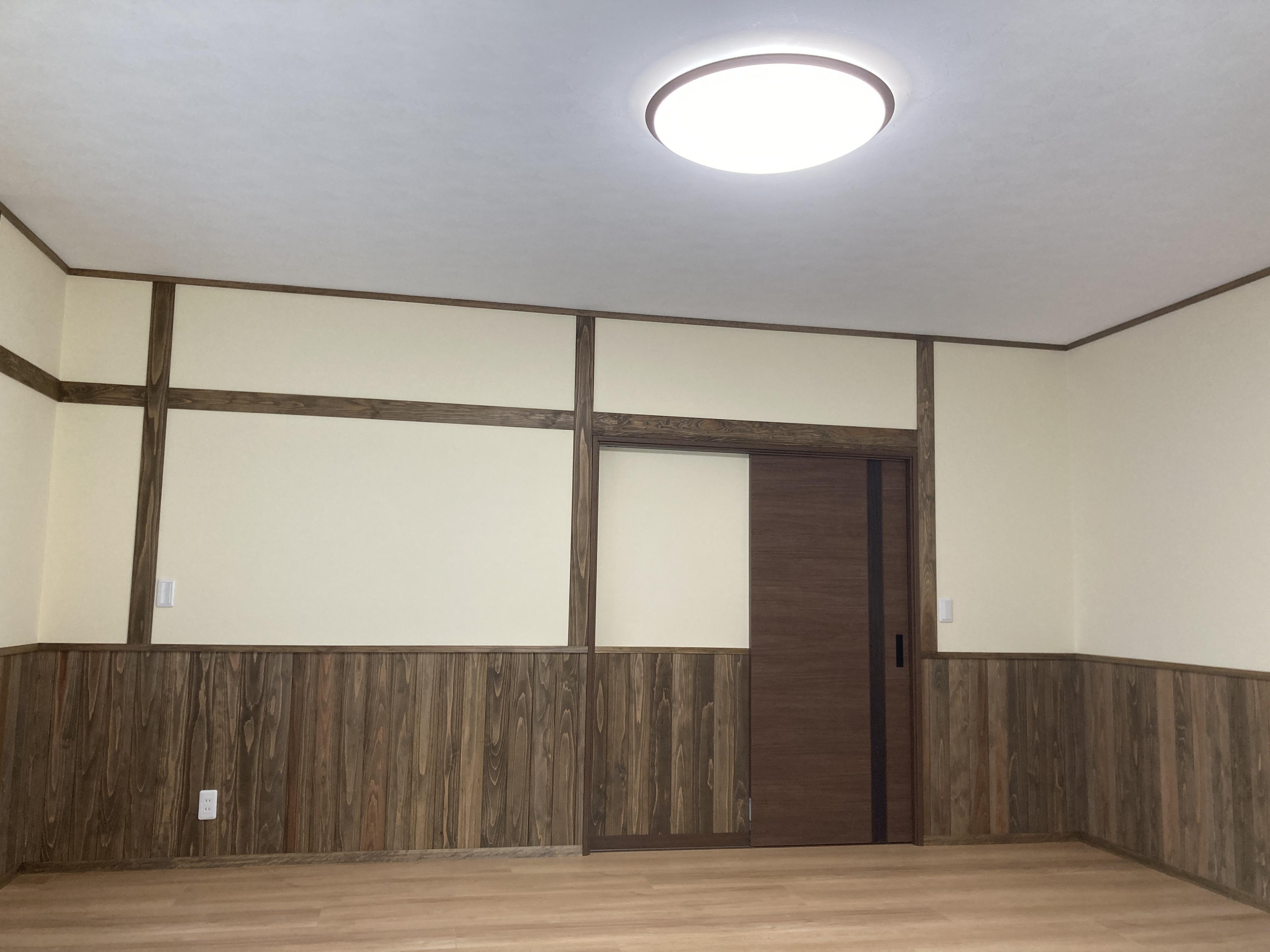 9帖和室・2.5帖広縁・1帖押入・1帖床の間を13部屋に改造 広縁-和室の間仕切りを取って明るく 畳からフローリングへの変更 珪藻土の塗壁 廊下との段差を少なく リビング間仕切りの遮音