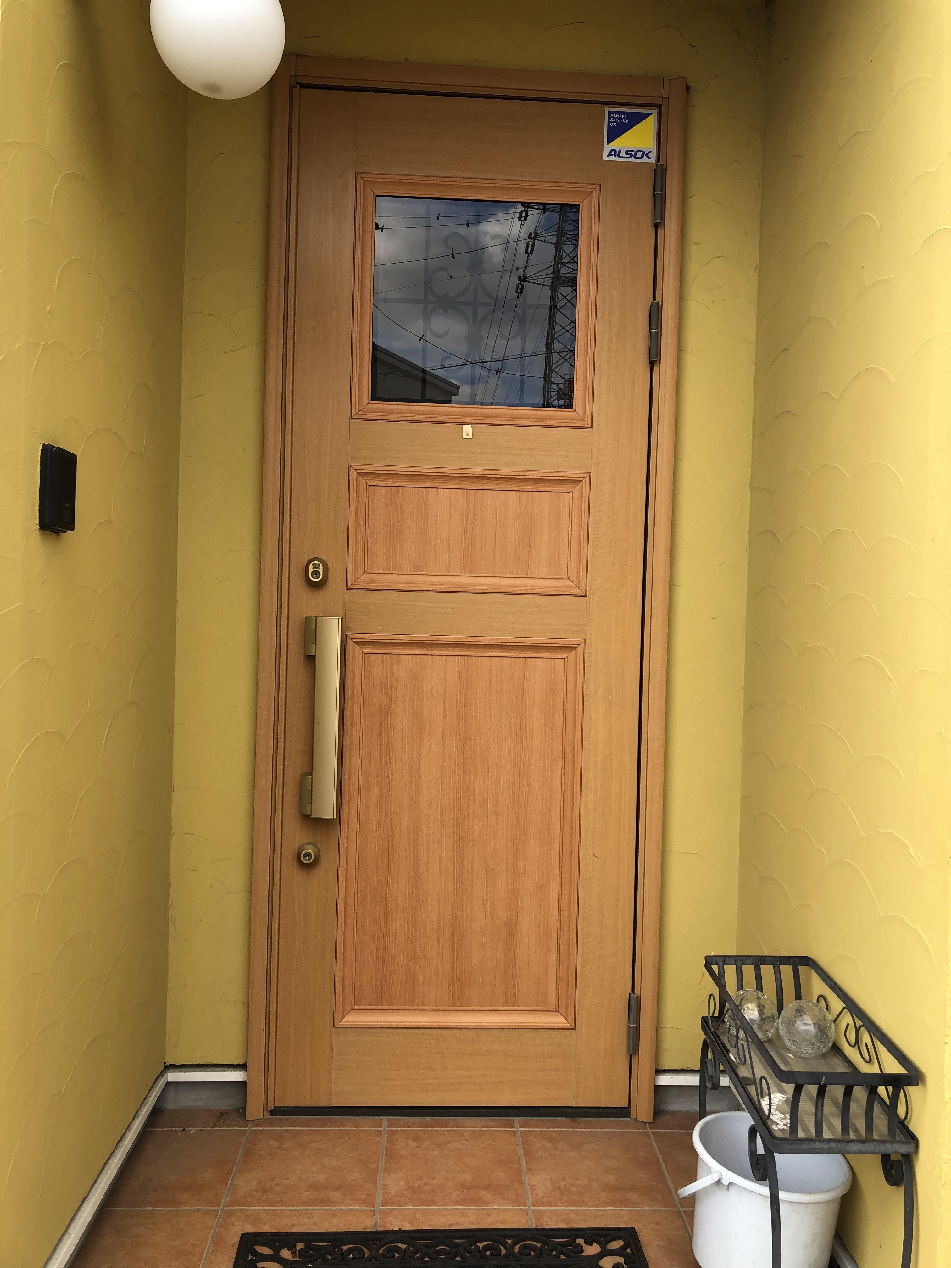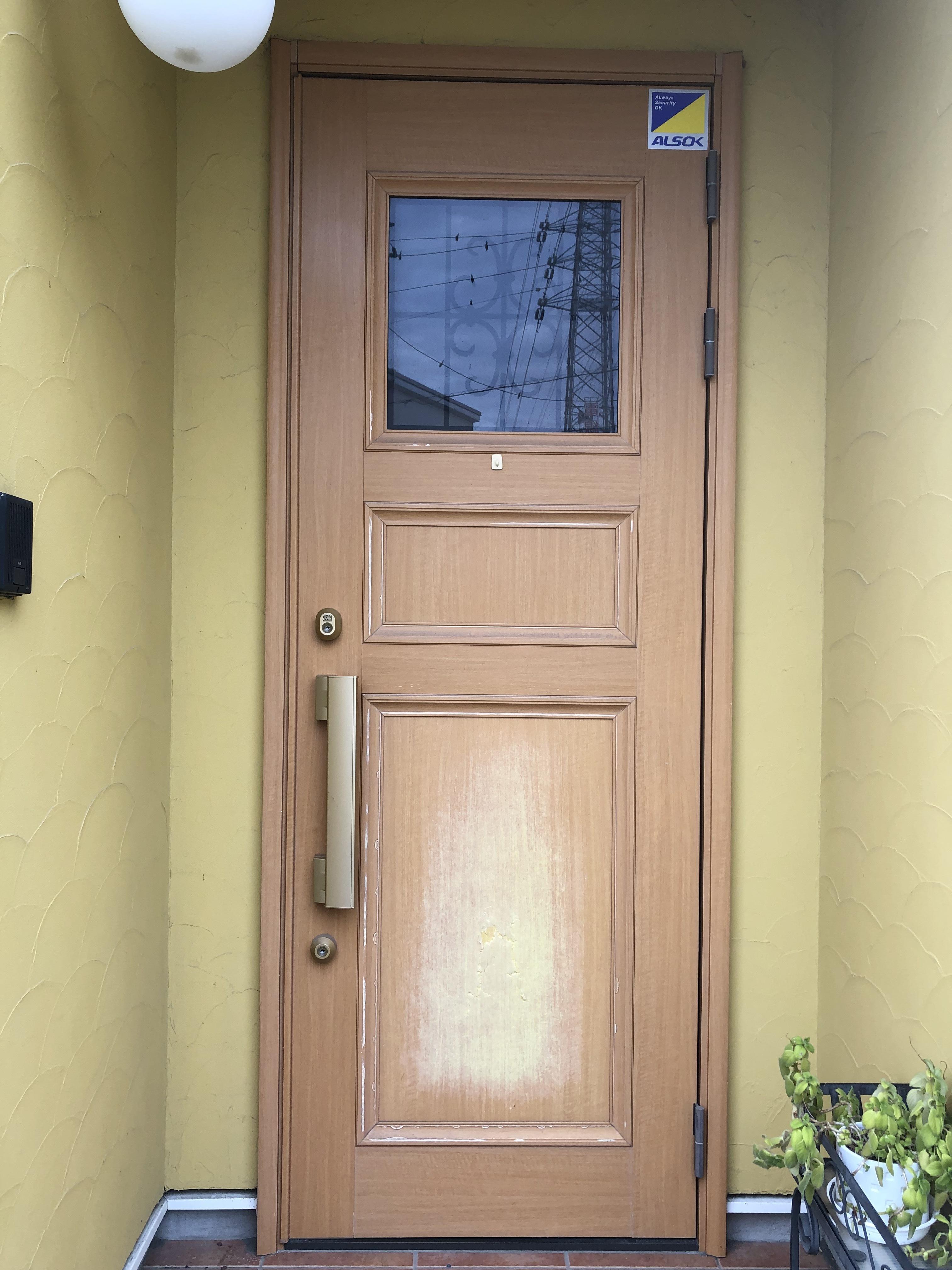 玄関ドアの修繕工事です。 通常ならばドアの交換となってしまい、予算は13万円以上かかってしまいますが 現玄関ドアはアルミ等の表面にシートを張っていますのでシートの張替で予算半分で修繕しました。 通常サッシ屋さんでは対応できないので特殊な作業が出来る技術者さんにお願いをしました。 玄関は家の顔、こんなお悩みのある方相談ください。