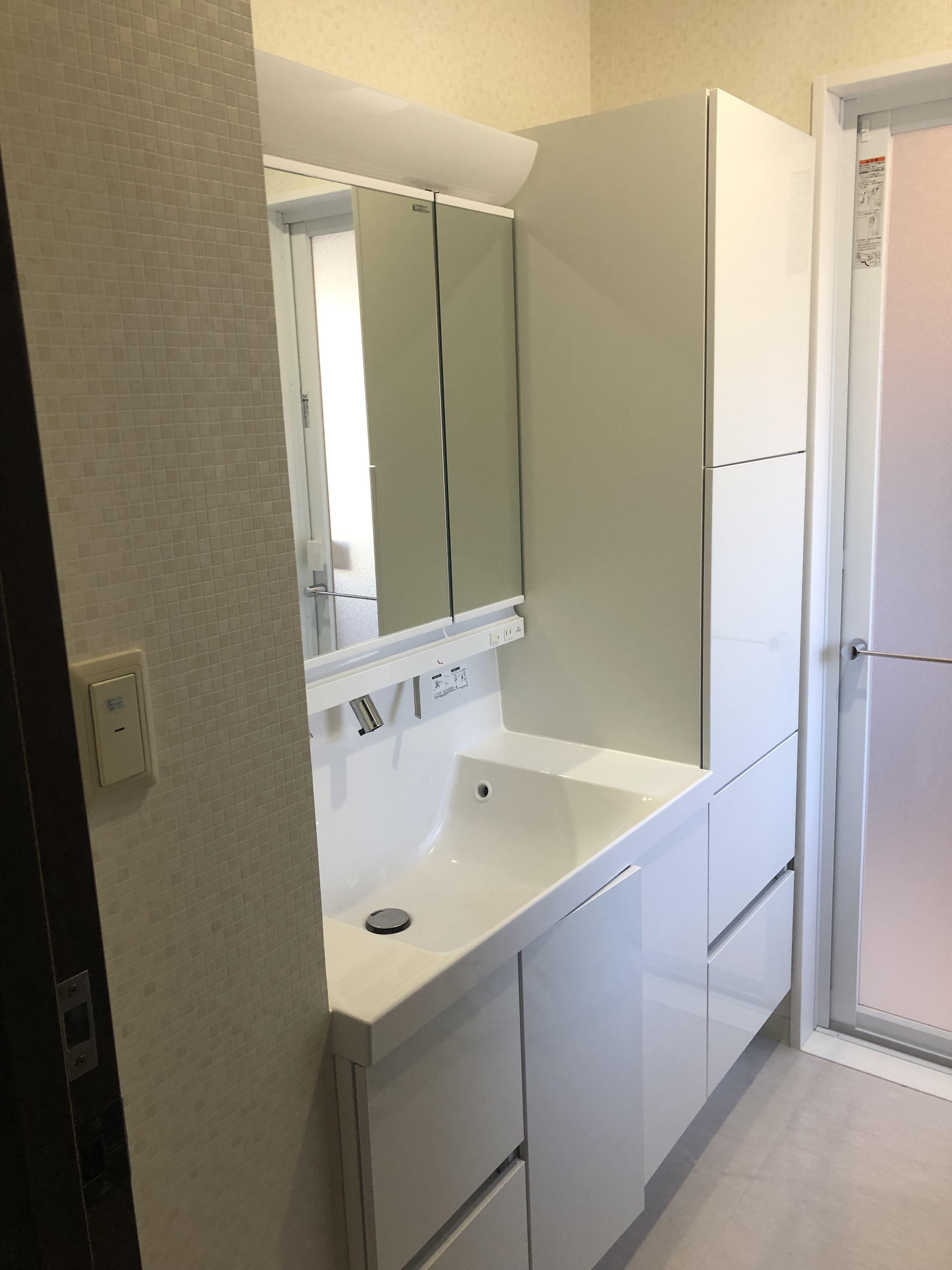 収納たっぷり明るい色使いで洗面脱衣室が素敵に