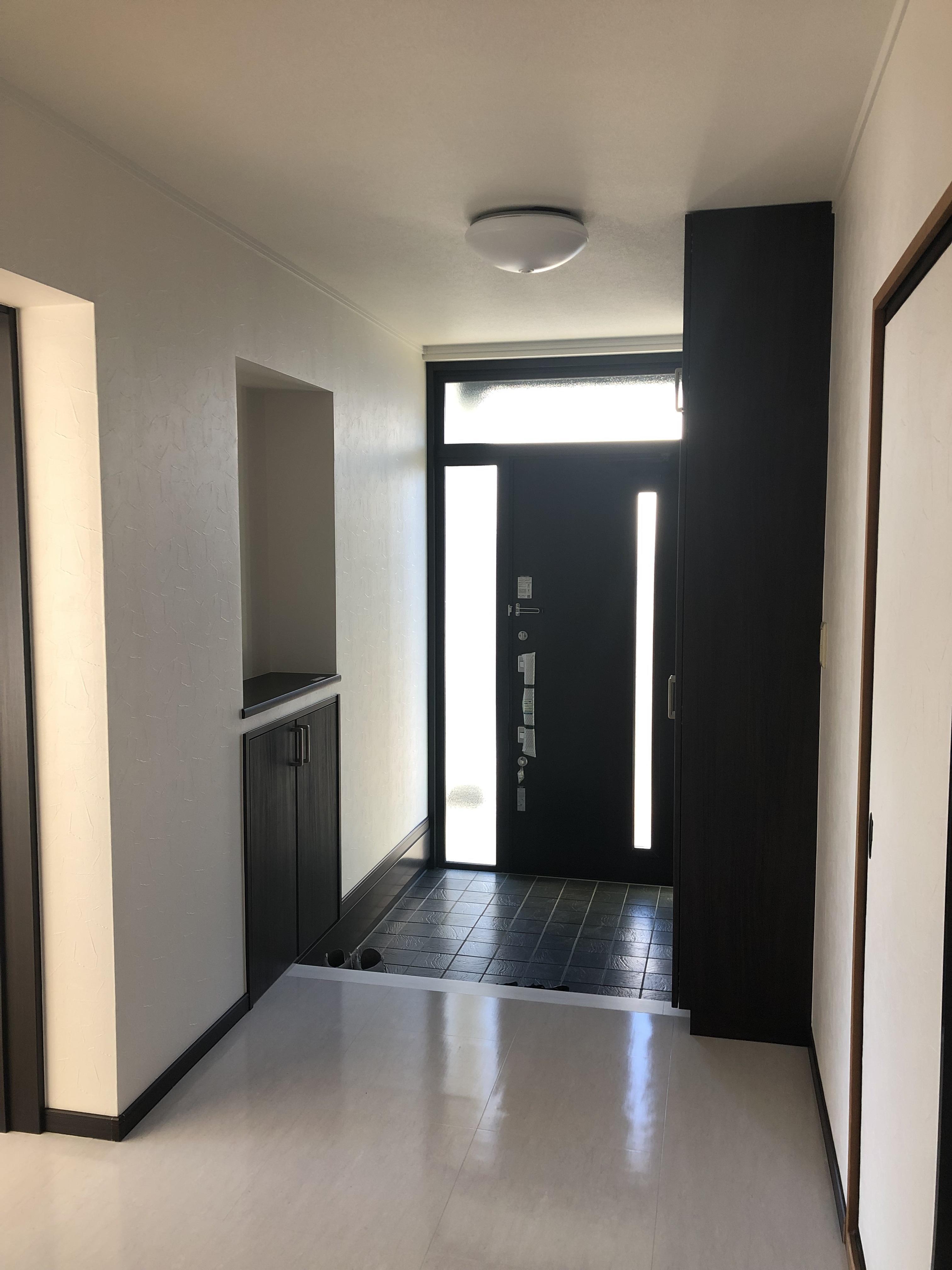 玄関ホールの壁になにを置けば良いかわからない窪み部分に収納カウンターを設置しました。ホールは壁天井はクロスの張替、床はフロアタイル張りでモノトーン調で演出しています。玄関の照明は人感センサー付きで夜に帰宅してもスイッチを探さず、すぐに明るく安心です。玄関リシェントサッシで断熱性がアップ、電子錠でセキュリティの面でも安心です。