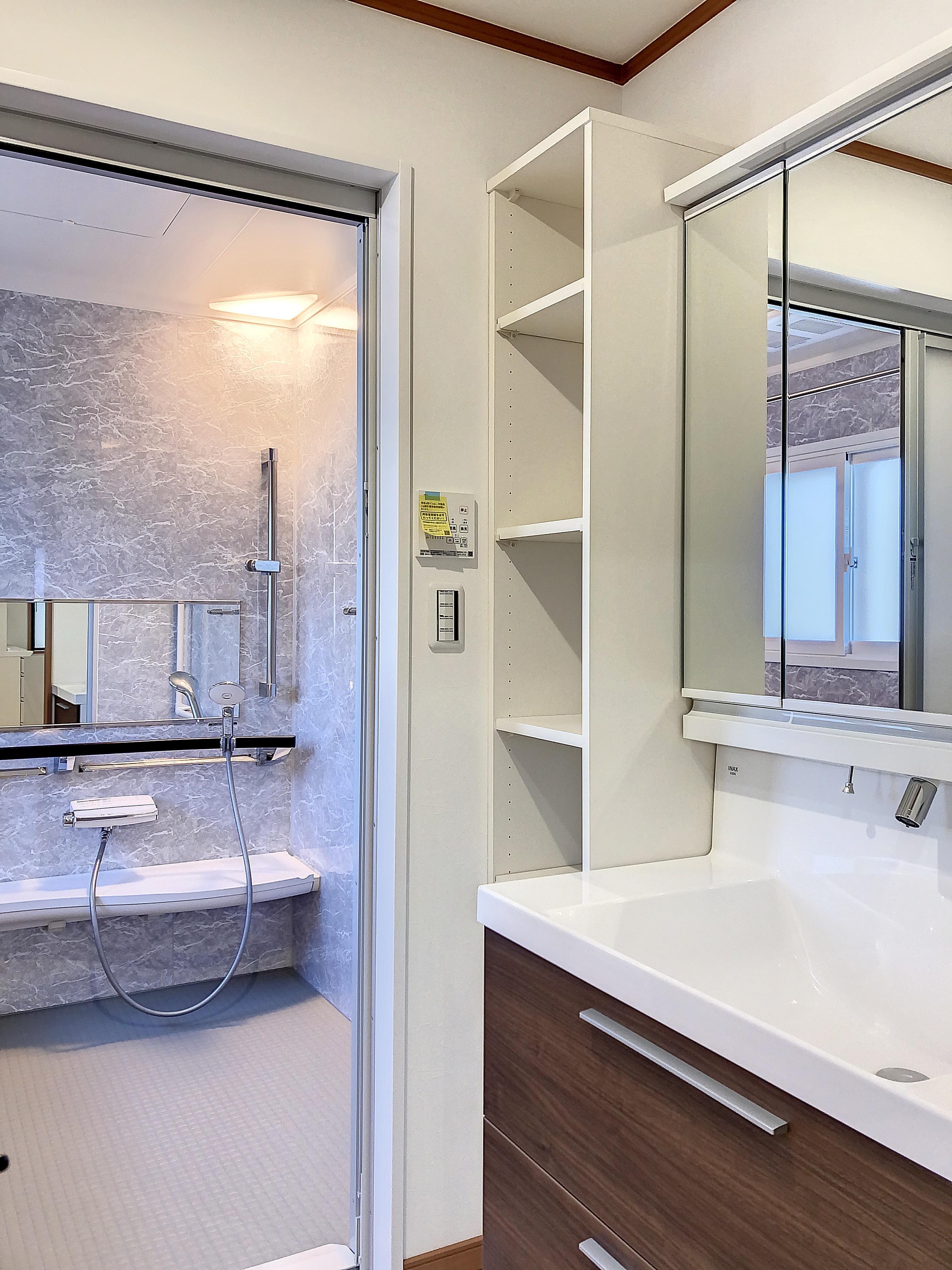 ちょっとしたスキマにも可動棚を設置しました。洗面化粧台は 上部3面鏡下部2段スライドのキャビネット付きです。