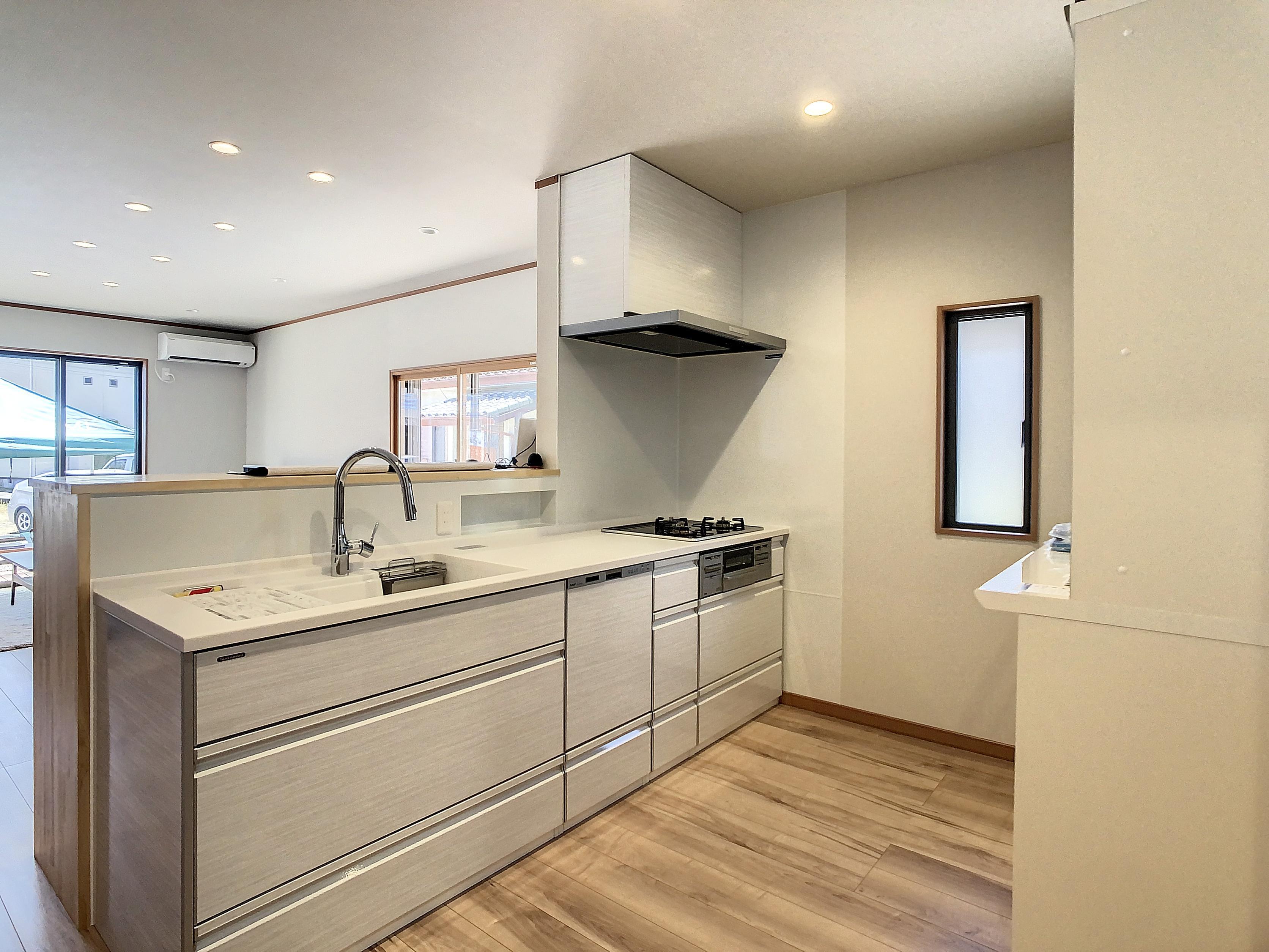 リシェルSI W2550 食洗器 お手入れカンタンレンジフード ナビッシュ水栓対面式壁を利用したスパイスニッチとキッチン裏の手作り収納で奥様の希望通りの収納量となりました。
