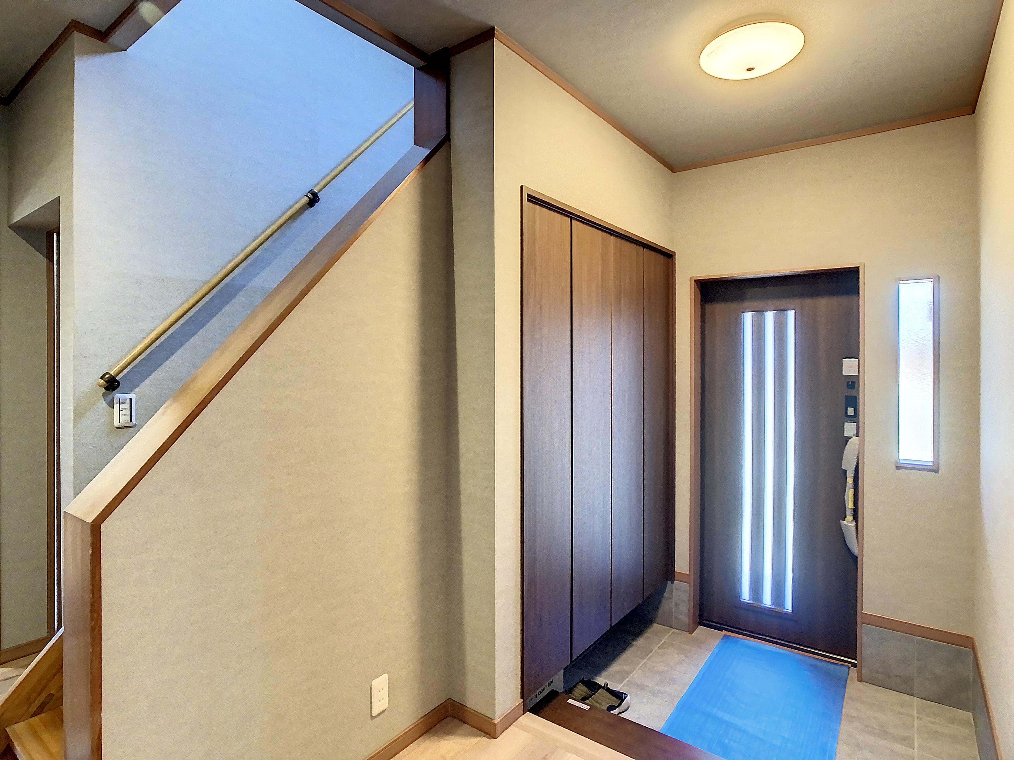 玄関収納にはご主人の趣味のゴルフバッグも入るようにと奥行きを持たせました。玄関サッシも交換する予定だったため位置をずらしてエルムーブを設置、空いた壁にもFIXをはめて明るさをキープしました。