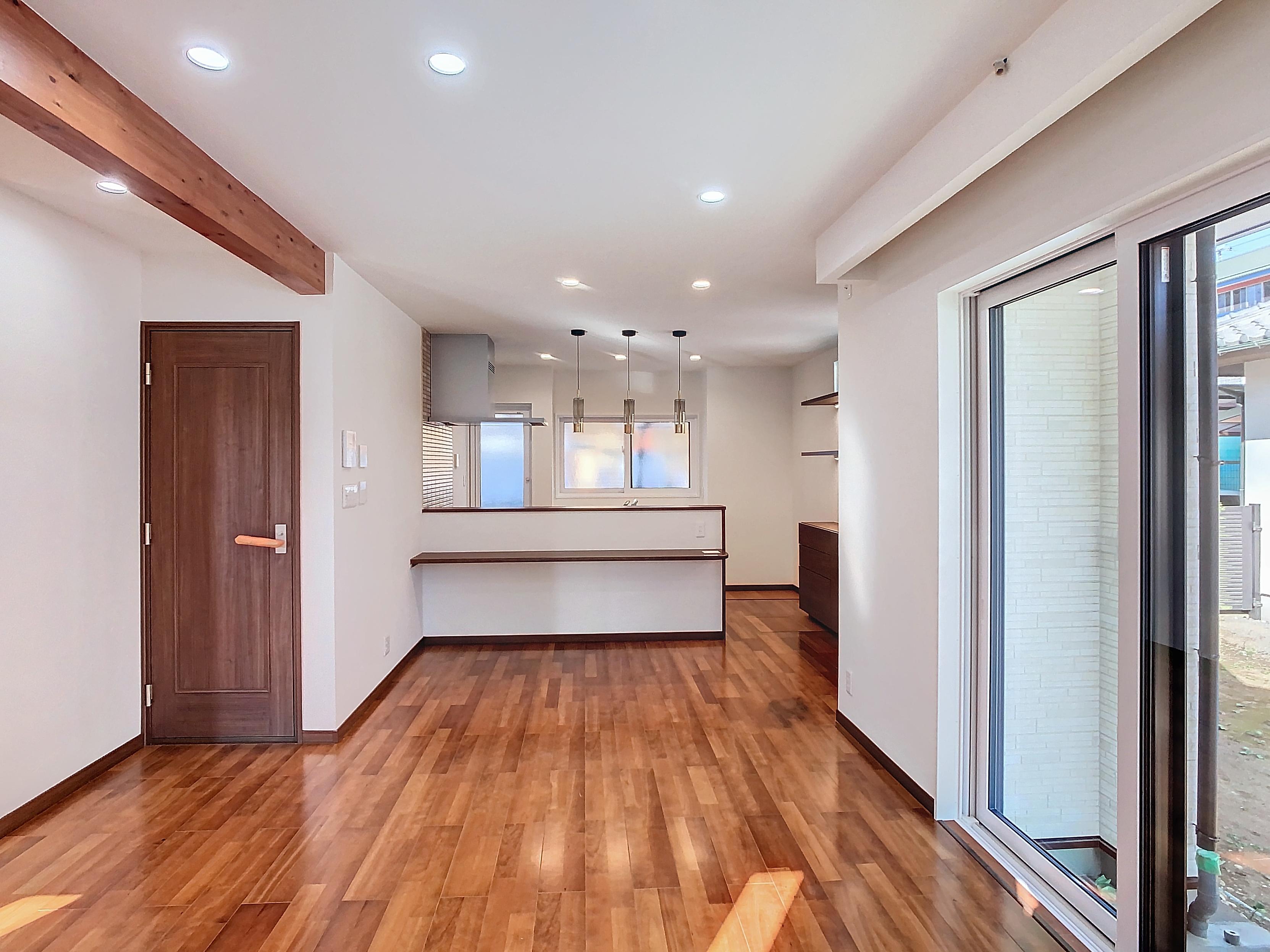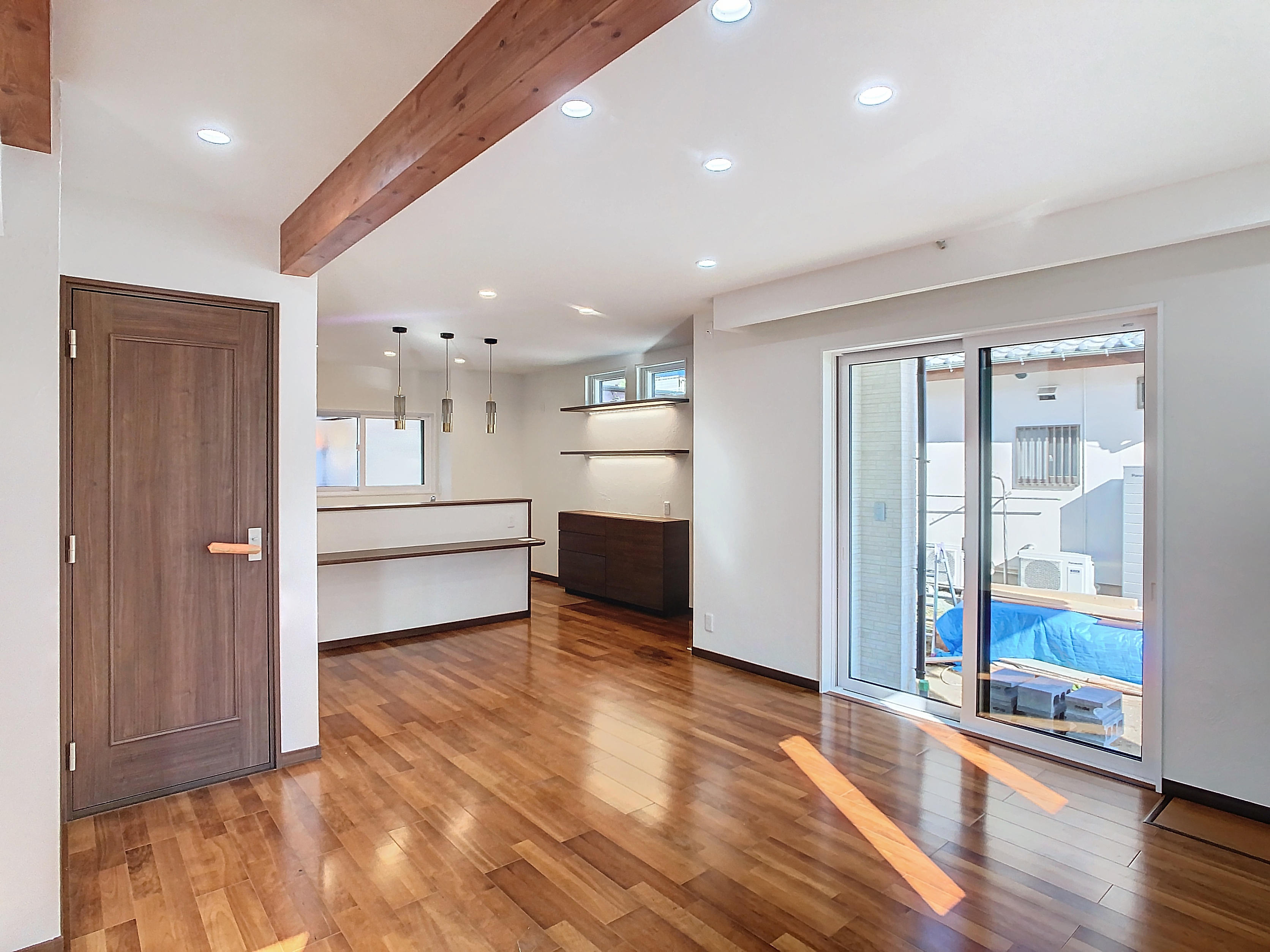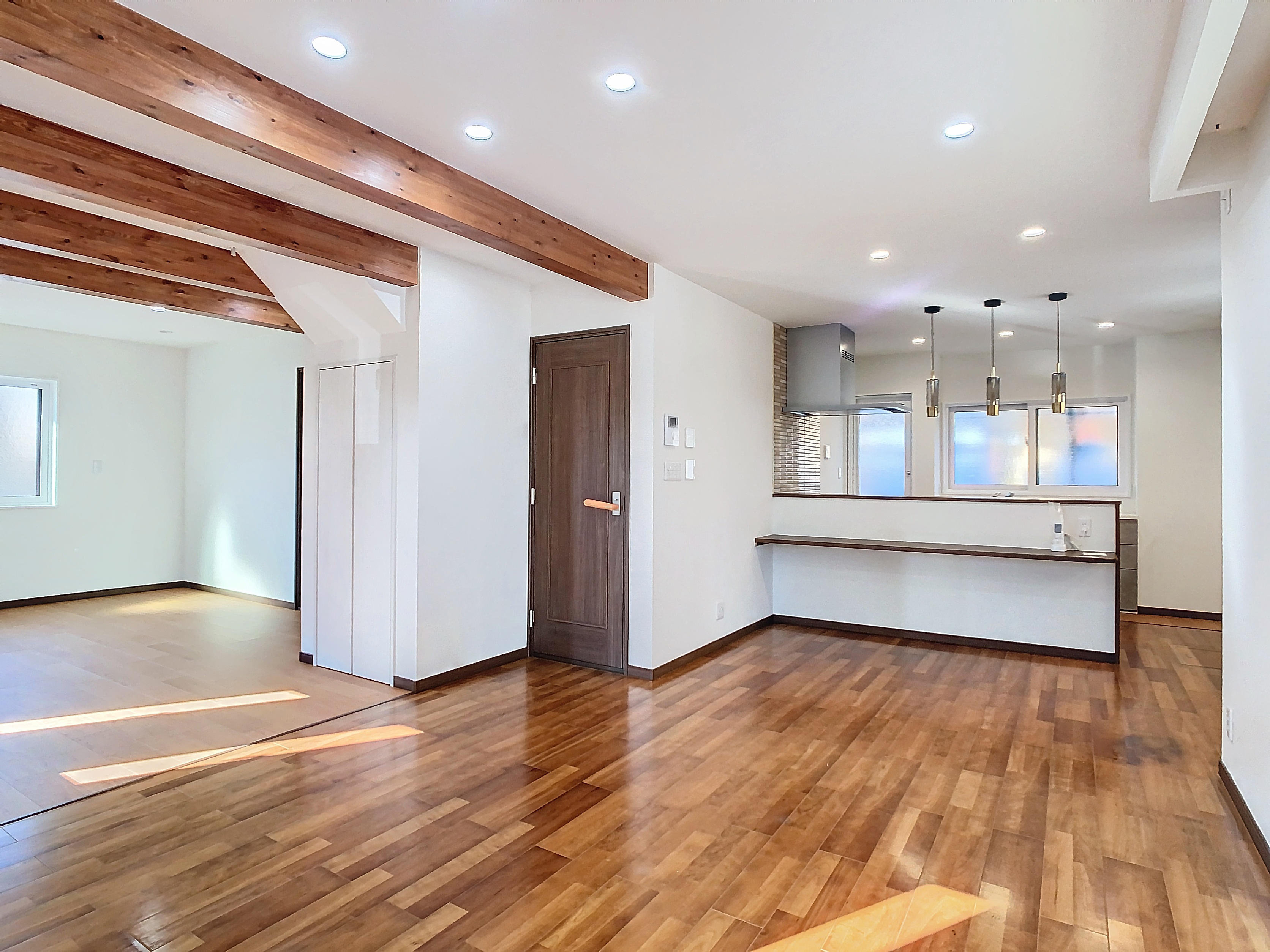 LDK+和室を大きなLDKに改造、梁補強(表し)、塗壁、フローリング貼