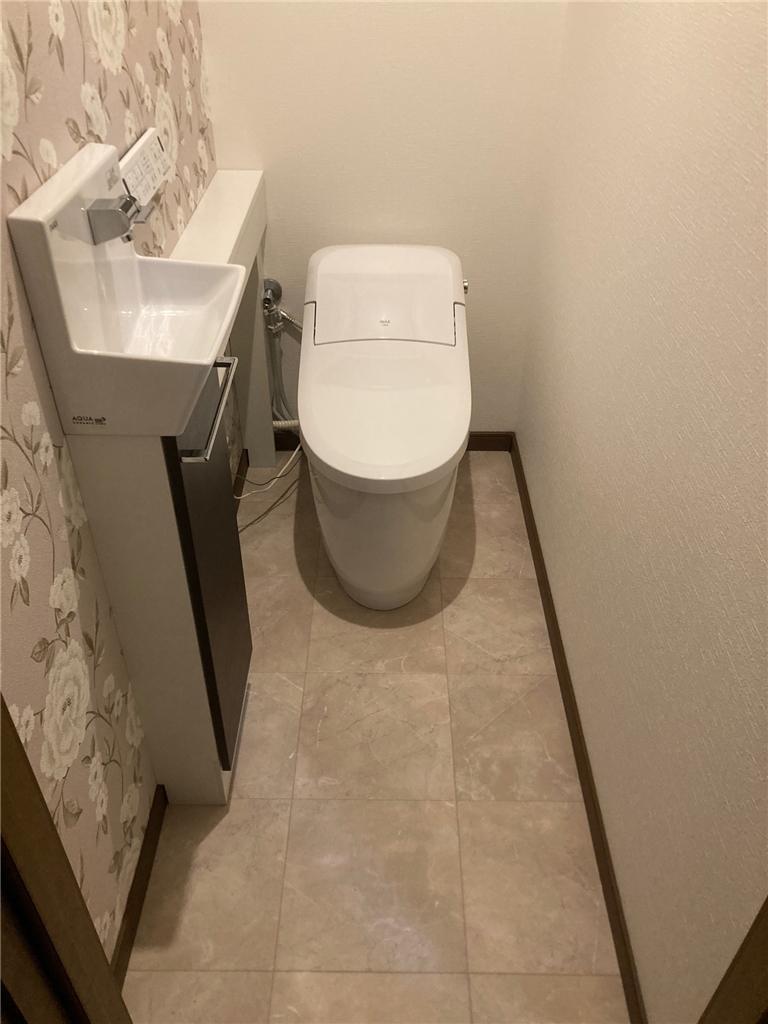 住みながらのリフォームで、撤去工事-資材の搬入・設置まで1日での作業をご希望でしたので時間単位での作業の段取りでした。 プレアス+リフォーム手洗いカウンターで床を捲らずに作業できる事で1日で作業を終えました。少し狭くも感じますがカウンターを手摺代わりにも利用でき、用をし終わって立ち上がったところに手洗器があるって便利です。