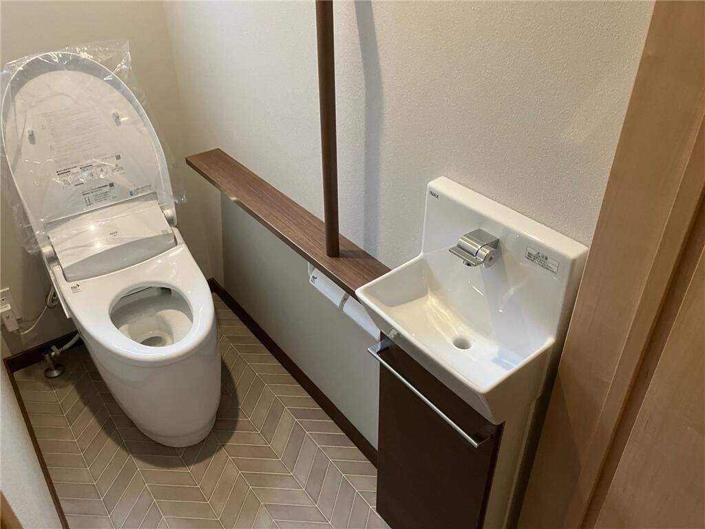 着座時、起立時に補助となる手摺と立ち上がった時に手洗器がそこにある体に負担がかからないトイレとなりました。