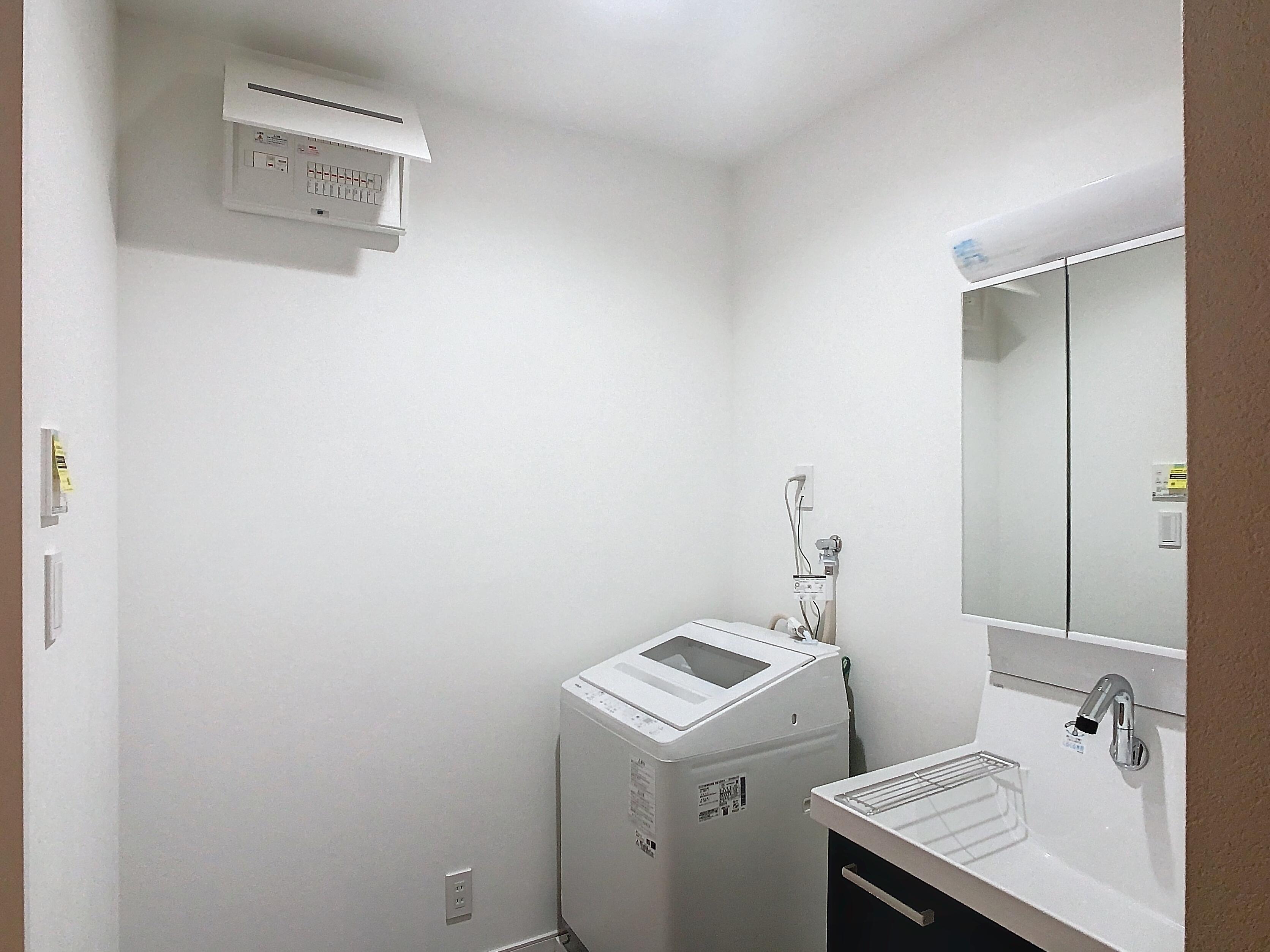 位置を変更して洗面脱衣室を作成、洗面化粧台LIXILピアラ 洗濯機パン無窓ですが人感センサー付き照明を採用すれば暗さは感じません。