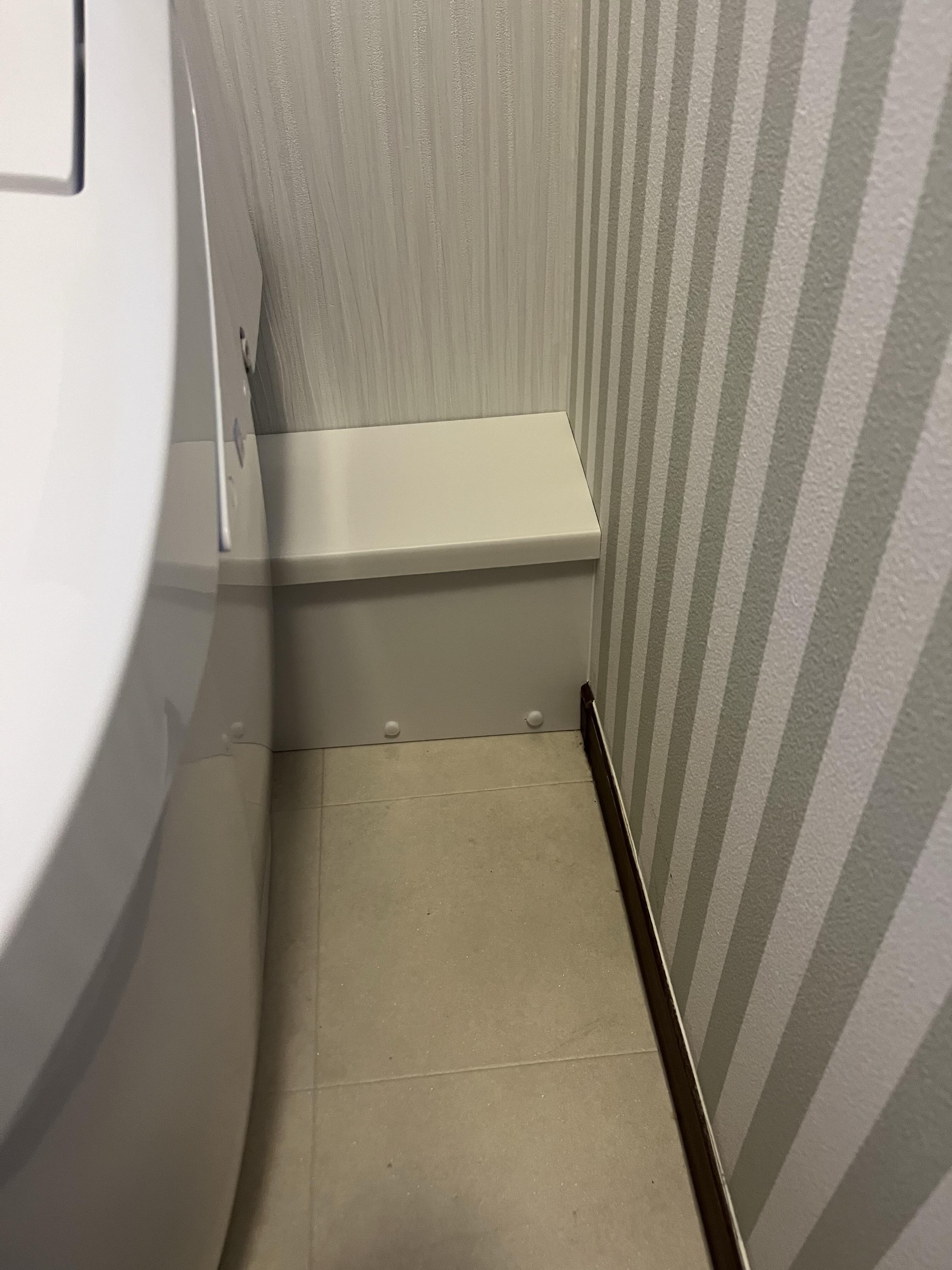 既存トイレ-床排水リフォーム用手洗いカウンターでしたが排水側と手洗いカウンターが同じ方向にあったために給排水が無理やり納められていました。 今回、プレアスリトイレ+リフォーム用手洗いカウンターを取付、給排水管をカバー材で覆い、スッキリ、お掃除しやすくなりました