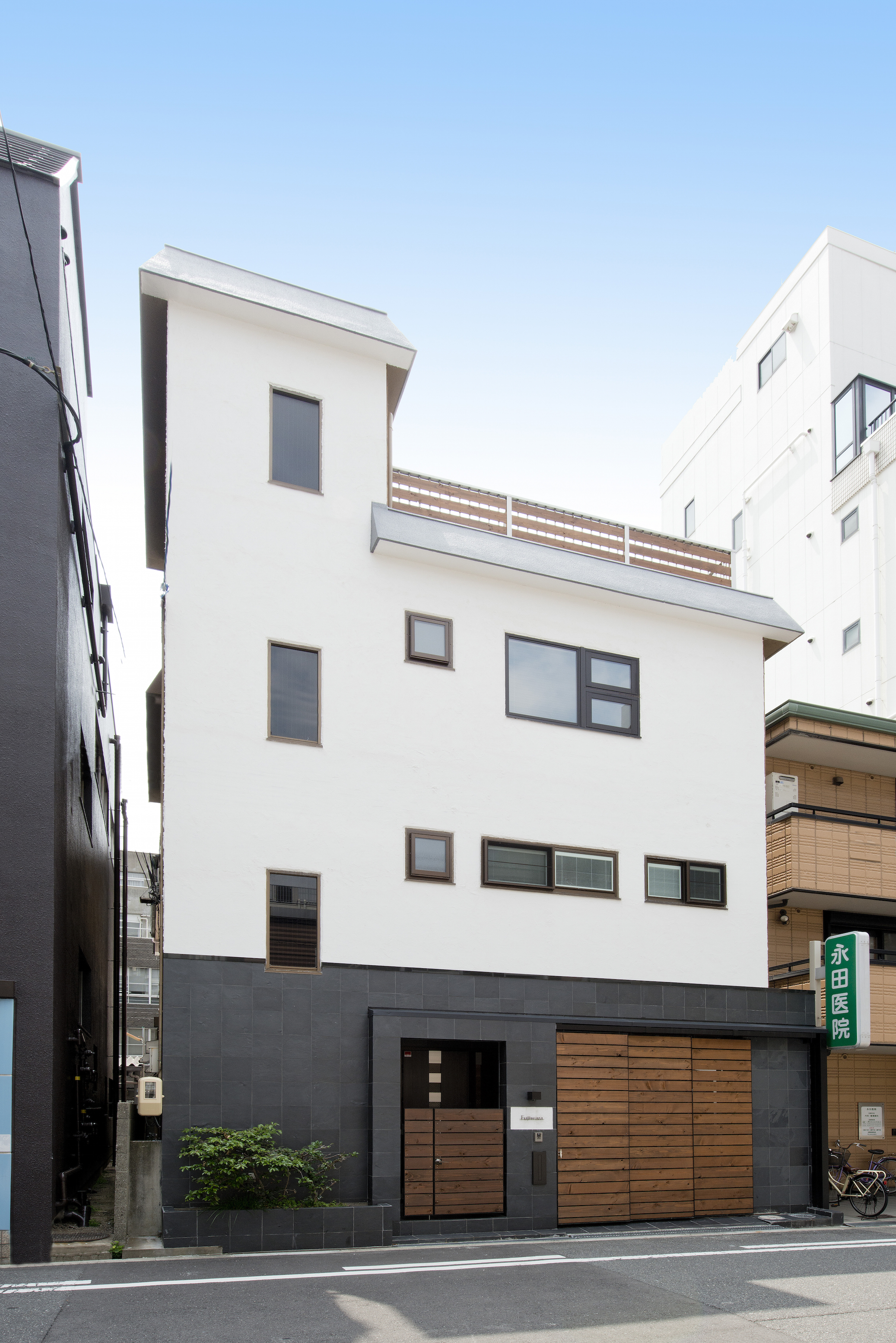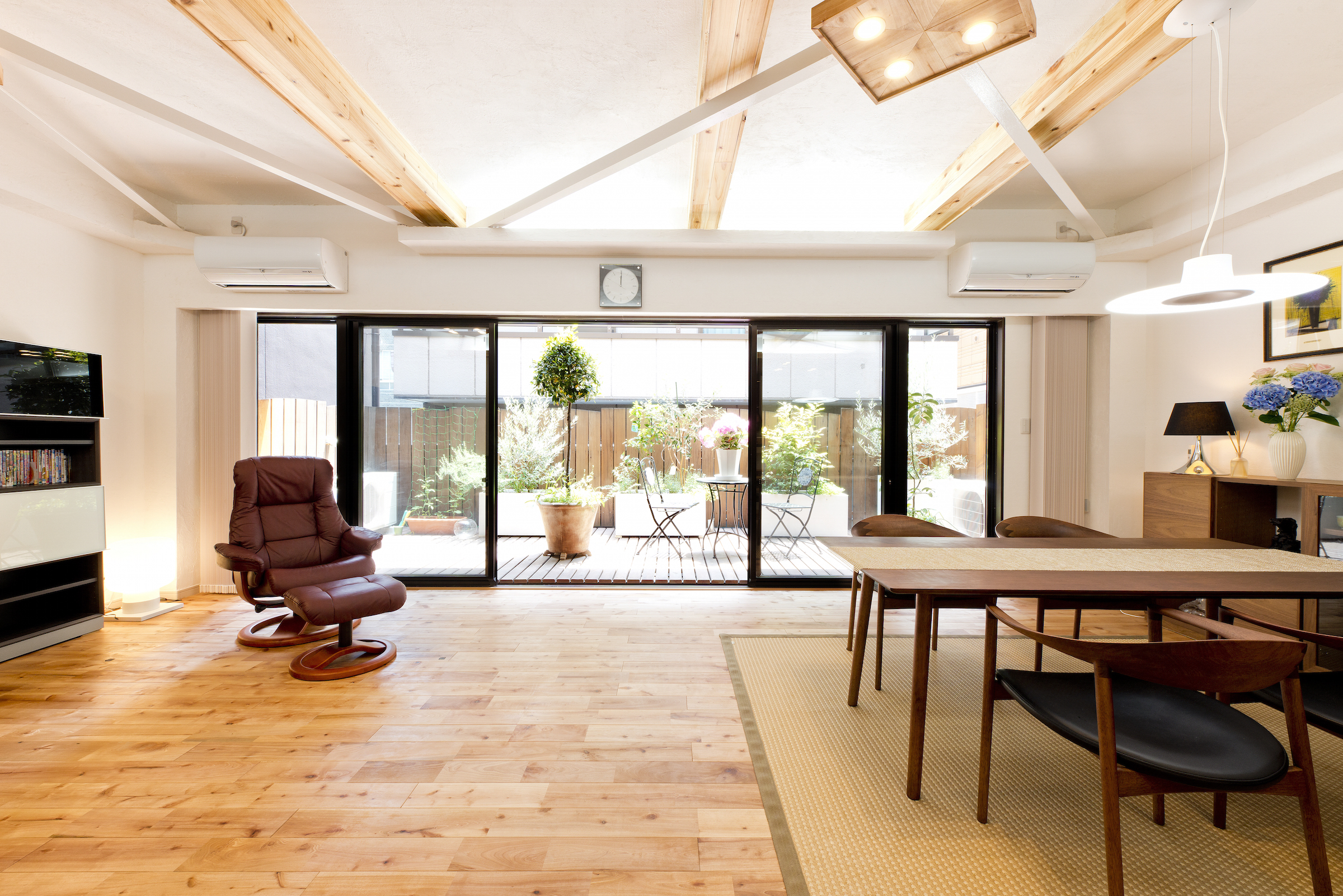 量鉄骨の事務所併用住宅を購入し、ダイナミックにリフォーム。リビングは天井板を撤去して高くし、むき出しになった構造材を空間のアクセントに生かした。 バルコニーに面する窓は高さも幅も拡大し、間の壁を撤去。光と風がたっぷり入る、リゾート感覚の住まいになった。床や壁に無垢材や漆喰、キッチンや浴室、外壁には天然石など、自然素材をふんだんに使っている。
