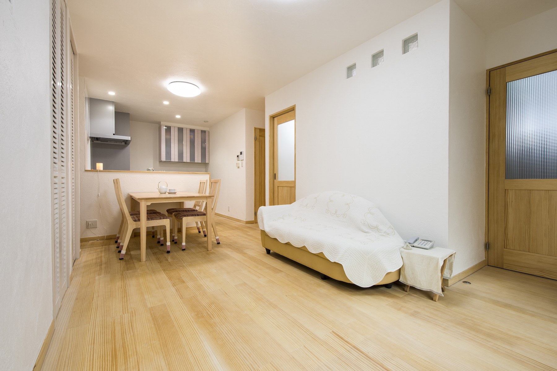 漆喰や無垢材を使ったリフォームを希望。古い家の寒さや耐震性も何とかしたい。壁に向いた暗いキッチンを明るくしたい。将来は1階だけで暮らせる間取りにしたいなど、たくさんの希望が叶った一邸。