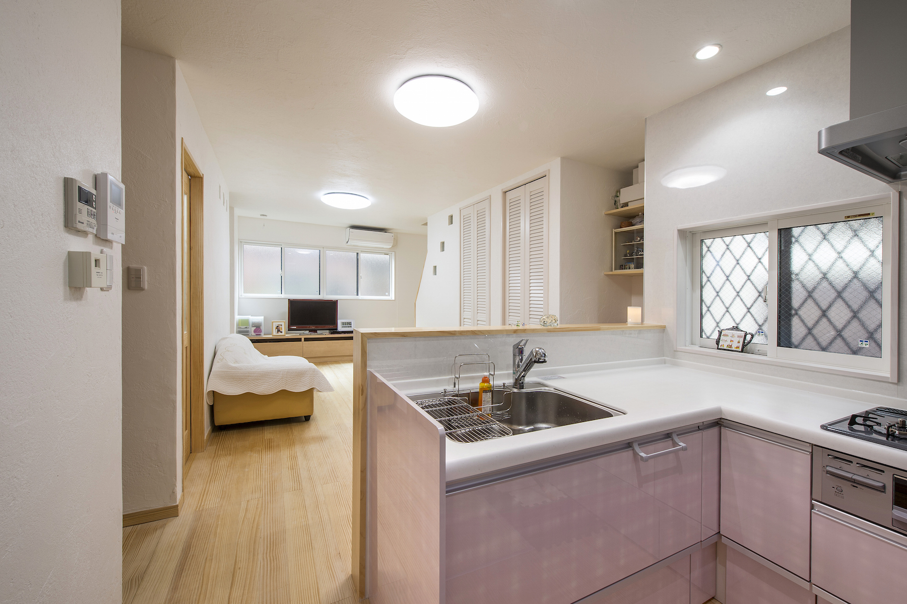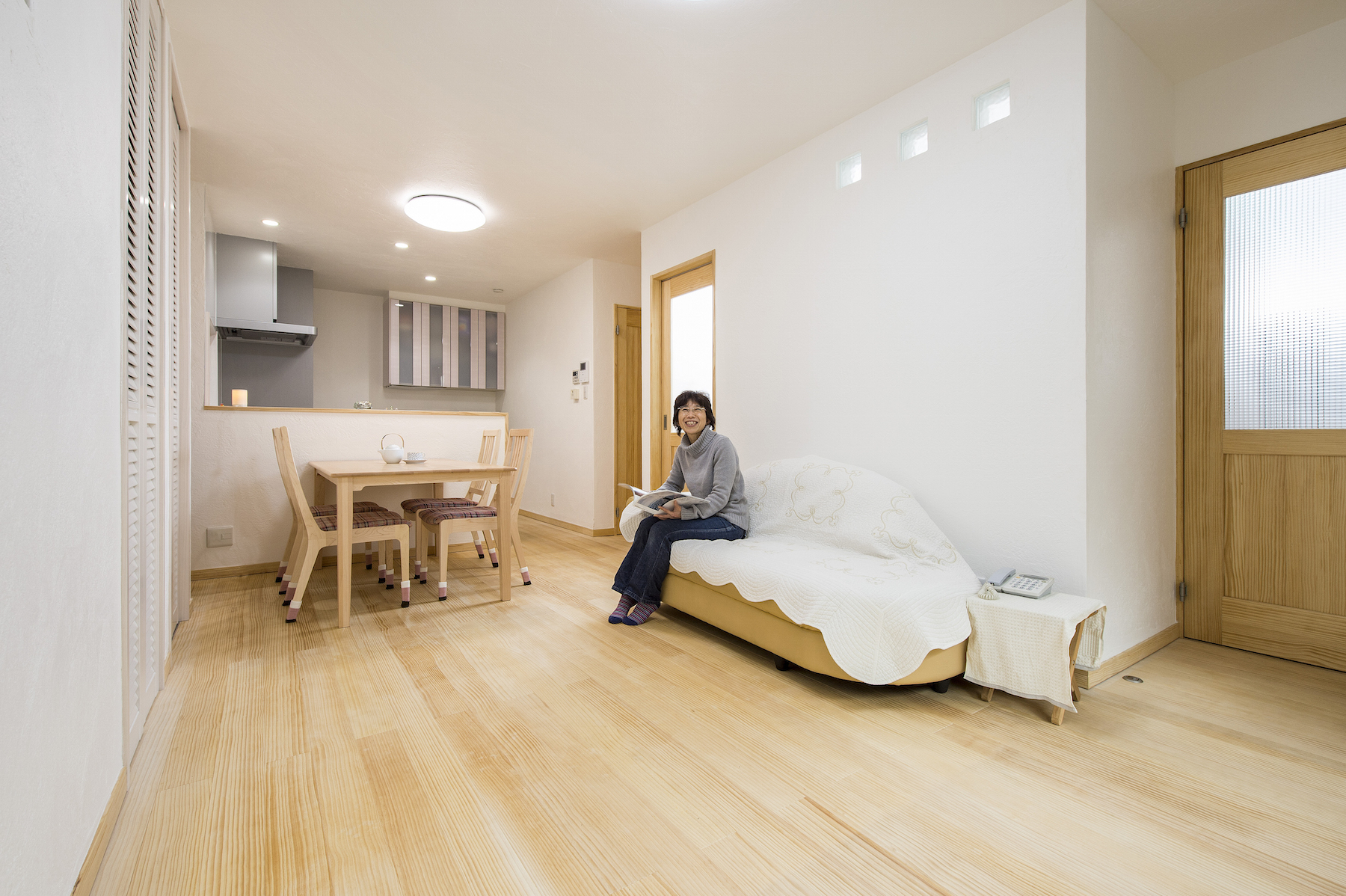 断熱材を入れ、窓を断熱サッシにし て「暖房の設定温度が低くても大丈夫なほど、暖かくなりました」。キッチンは憧れの対面式にし、LDに向かって作業できるので、料理が楽しくなったそう。 「町田工務店のモデルハウスに入った瞬間 、『気持ちいい ! 』と感じたんです」。それが自然素材のおかげだと知ったKさん。自然素材のおかげで明るく、心地いい空間になり、「ゆったりお抹茶をたてて楽しむなど、家で過ごす時間が豊かになりました」。小さなお孫さんが遊びに来ても、自然素材だから安心。