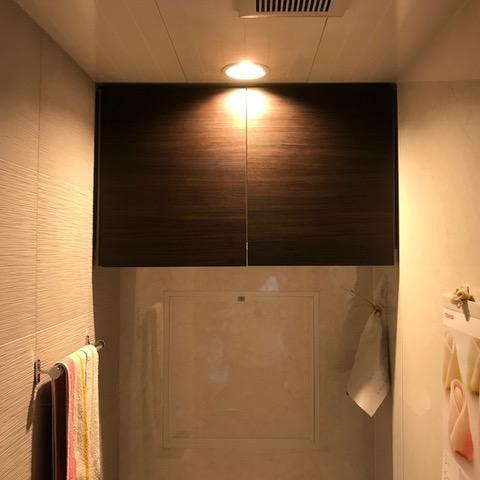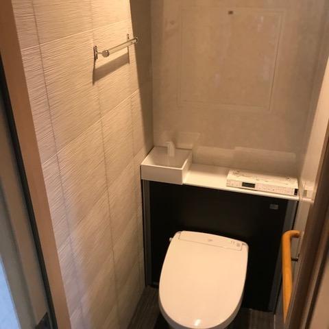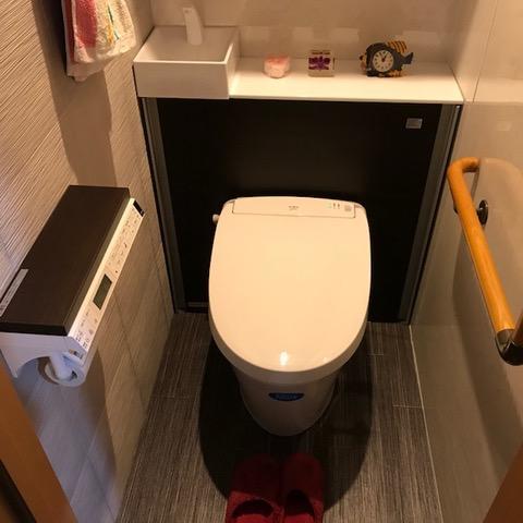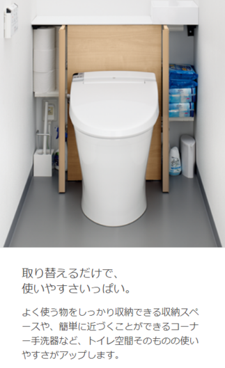 LIXIL(リフォレ)へのトイレの交換工事です。配管やコードが隠れるのでお手入れしやすく収納量もたっぷりのキャビネットが特徴です。予備のトイレットペーパーやお掃除道具も収納できますね。 (キャビネットカラー:クリエダーク)