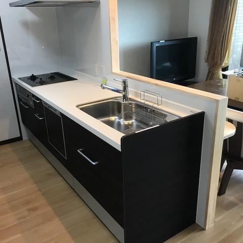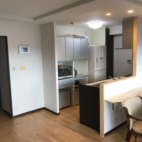 吊り戸棚をなくすことで明るく開放的なキッチンになりました。笠木の色目もダークからナチュラル色に変更し、軽やかなイメージです。
