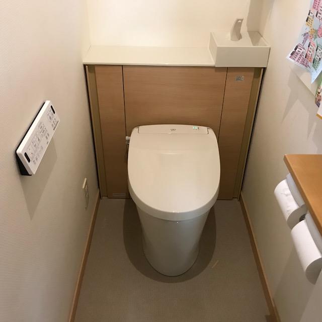 トイレの入れ替え工事です。タンク・給水管・コードもキャビネットに隠れて見た目すっきりスタイリッシュなLIXIL「リフォレ」に。出しっぱなしだったお掃除道具も予備のトイレットペーパーも両サイドの収納に入ります。キャビネットの上のカウンターには小物や花が飾れます。シンプルながら木調扉がやさしい印象を与えてくれます。(キャビネット・色:クリエペール)