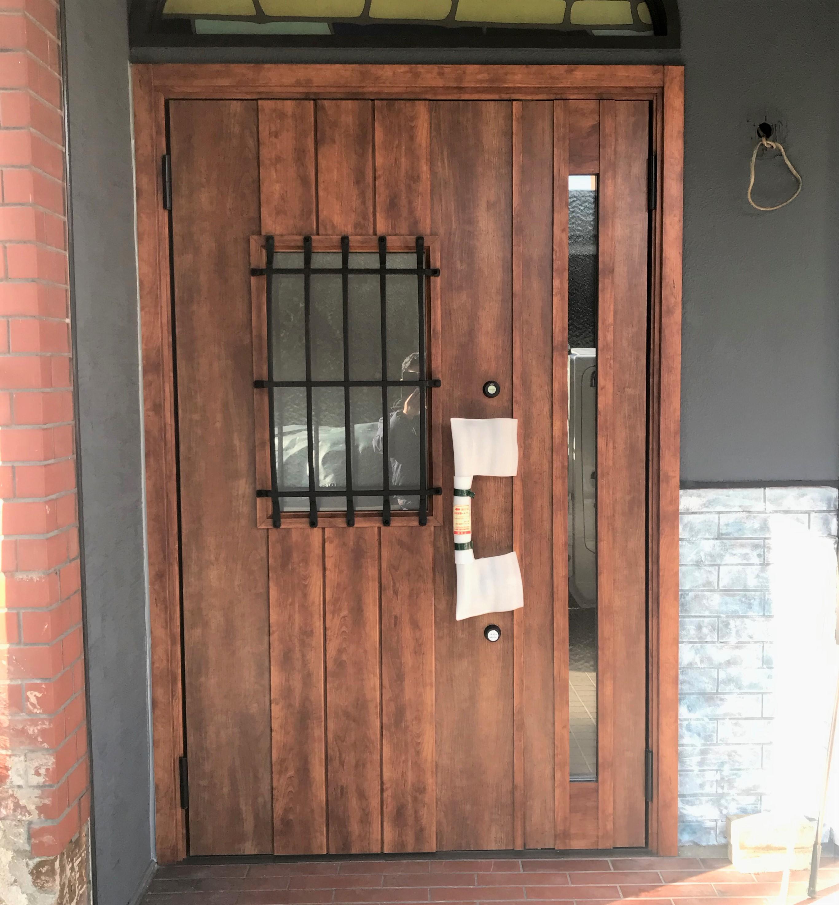改装中の店舗のドアの入替工事です。 アイアン調の飾りがついている素敵なデザインです。 ドアの色も変わり、明るい雰囲気になりました。 *リシェント:Ⅾ44 (カラー・ハンドダウンチェリー)