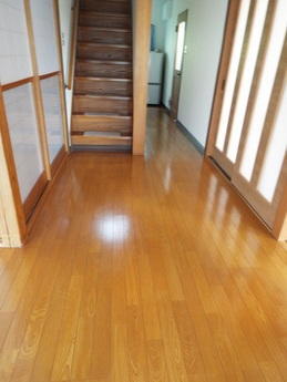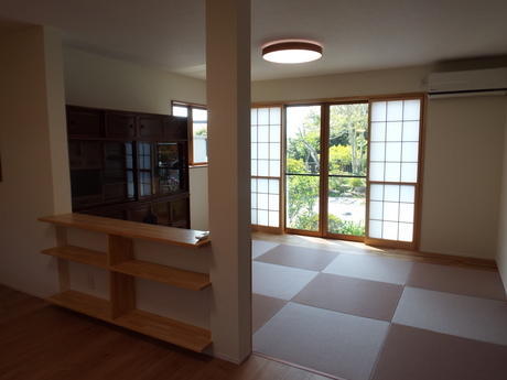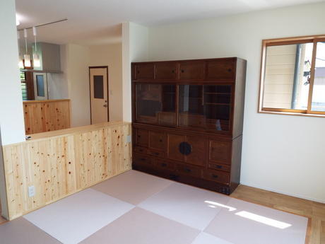 以前和室だった部分は琉球畳を敷きました。縁なしの畳で半畳サイズの琉球畳はフローリングなどの洋室空間とも相性が良く素敵な雰囲気です。使用されていた茶箪笥ともよく合いお客様にも喜こんでいただけました。