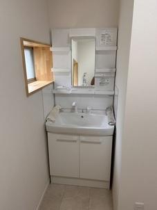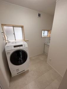 お風呂の位置はそのままでトイレの位置を変更。洗面脱衣室が広くなりました。洗濯機を置いても広々です‼