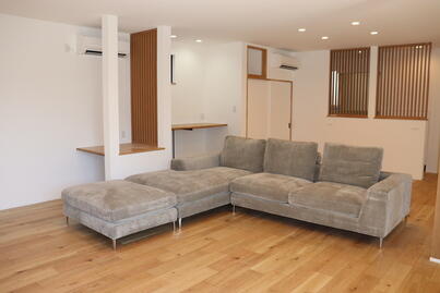 お施主様のこだわりは「広々としたLDK」。1日のうちで過ごす時間の多いLDKは、間取りを変更し広々とした空間に。家族がそれぞれ好きなことをしながらくつろげます。キッチンからも見渡せ、お子様の様子を見ながらお料理することができます。