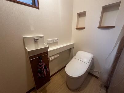 トイレ本体の交換と合わせて、壁紙の交換やお客様がずっとつけたいと思われていた手洗い器の設置も行いました。プレアスLSタイプは手洗器がセットになったタイプがあり、手洗いの為の給排水を新設せずに設置が可能です。