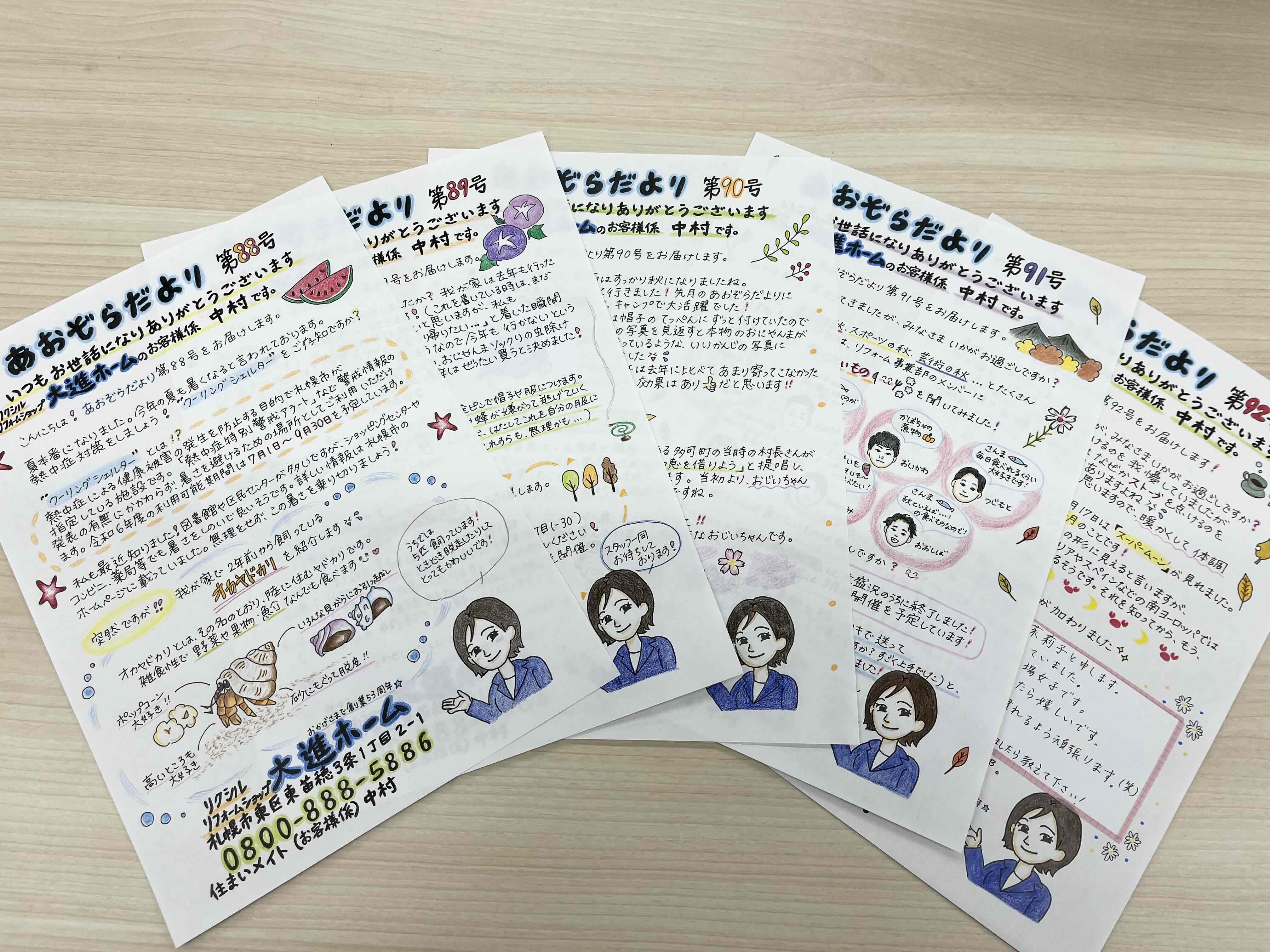 大進ホームでは住まいメイトのお仕事のひとつに、「あおぞらだより」というお便りを書いています。