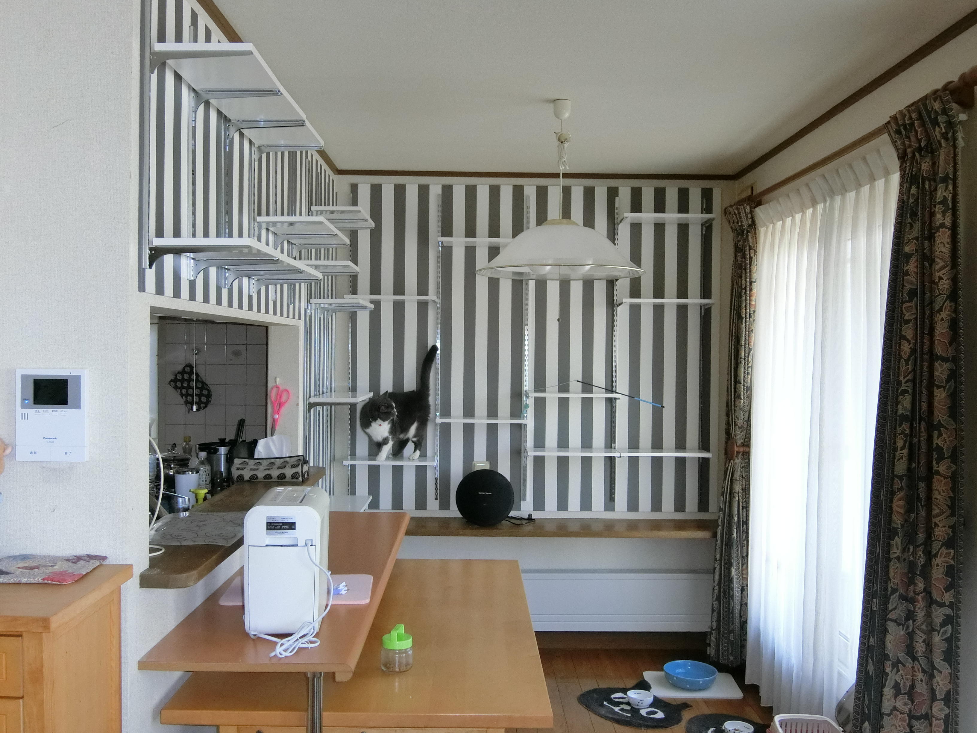 石狩市 O様邸 キャットウォーク設置工事 猫ちゃんにあわせて好きな高さに移動可能。棚としても使えます。 ストライプのアクセントクロスでさらにおしゃれ度UP!