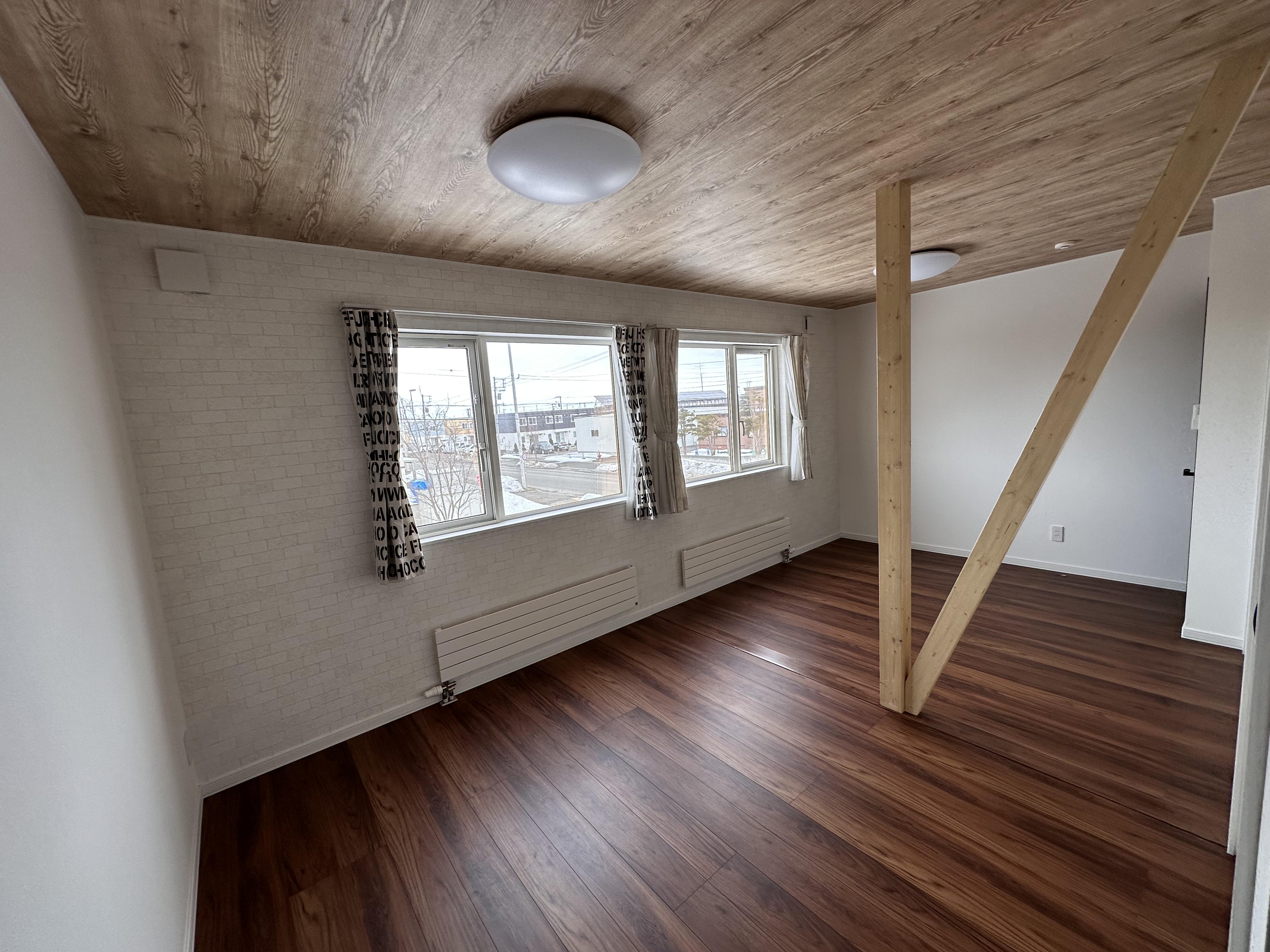 元々2部屋だった洋室を1部屋へ、 構造上抜けない柱と筋交いは表しとし、塗装仕上げとしました。