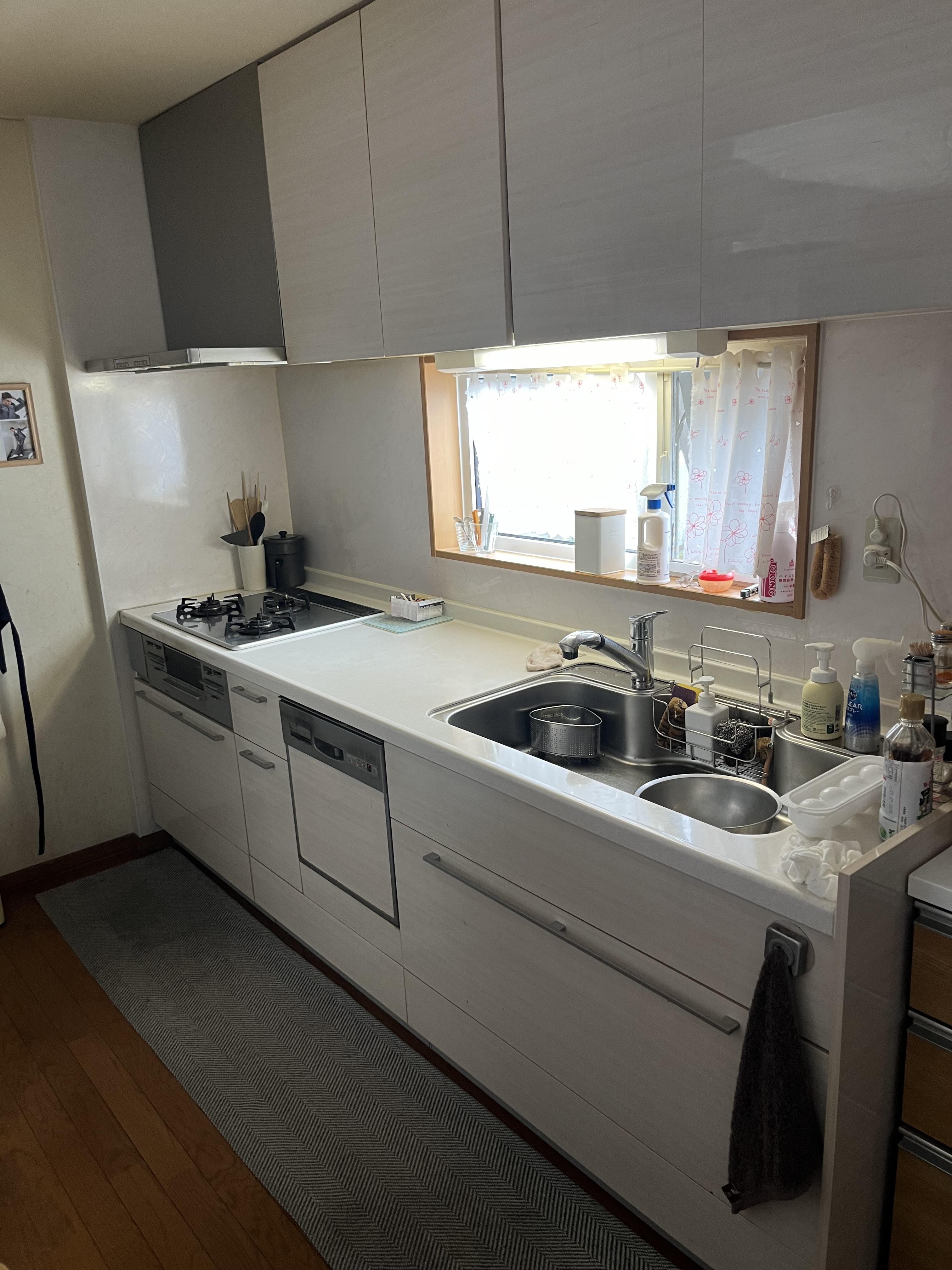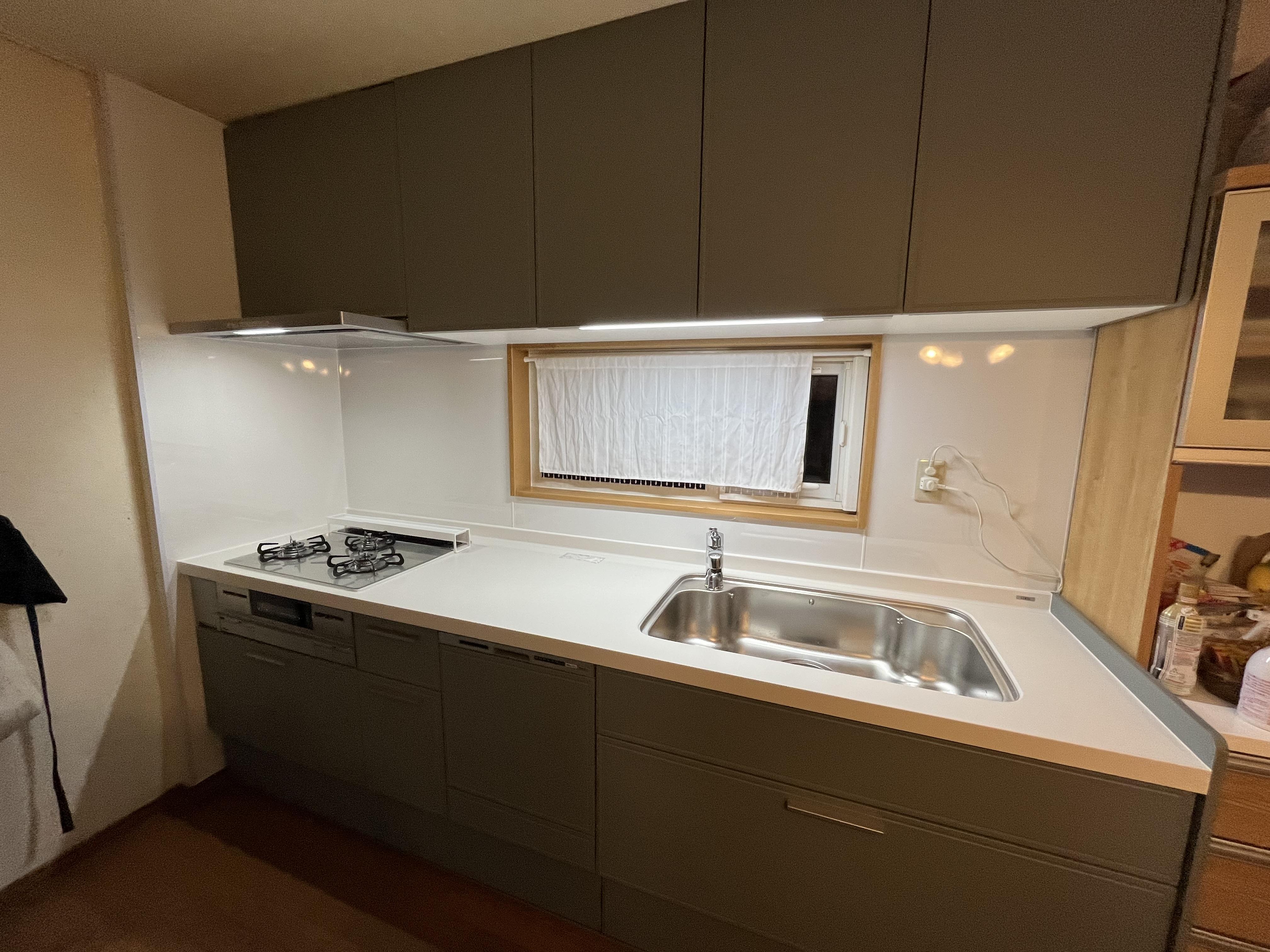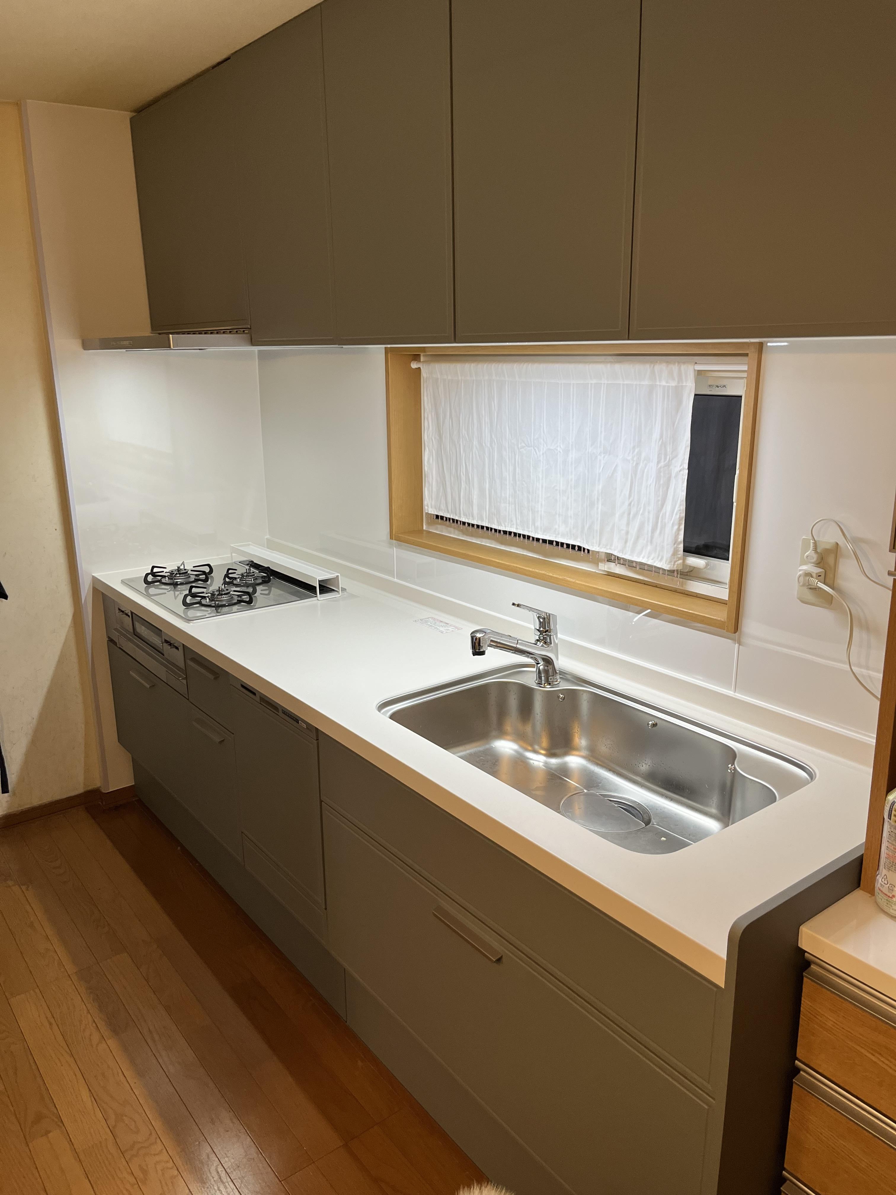 レンジフード、ガスコンロ、食洗器 不調続きのキッチンに大胆にも大きくメスを入れ 緑系の落ち着いた雰囲気に変わりました。電気の色と相まってより神秘的に仕上がっています。