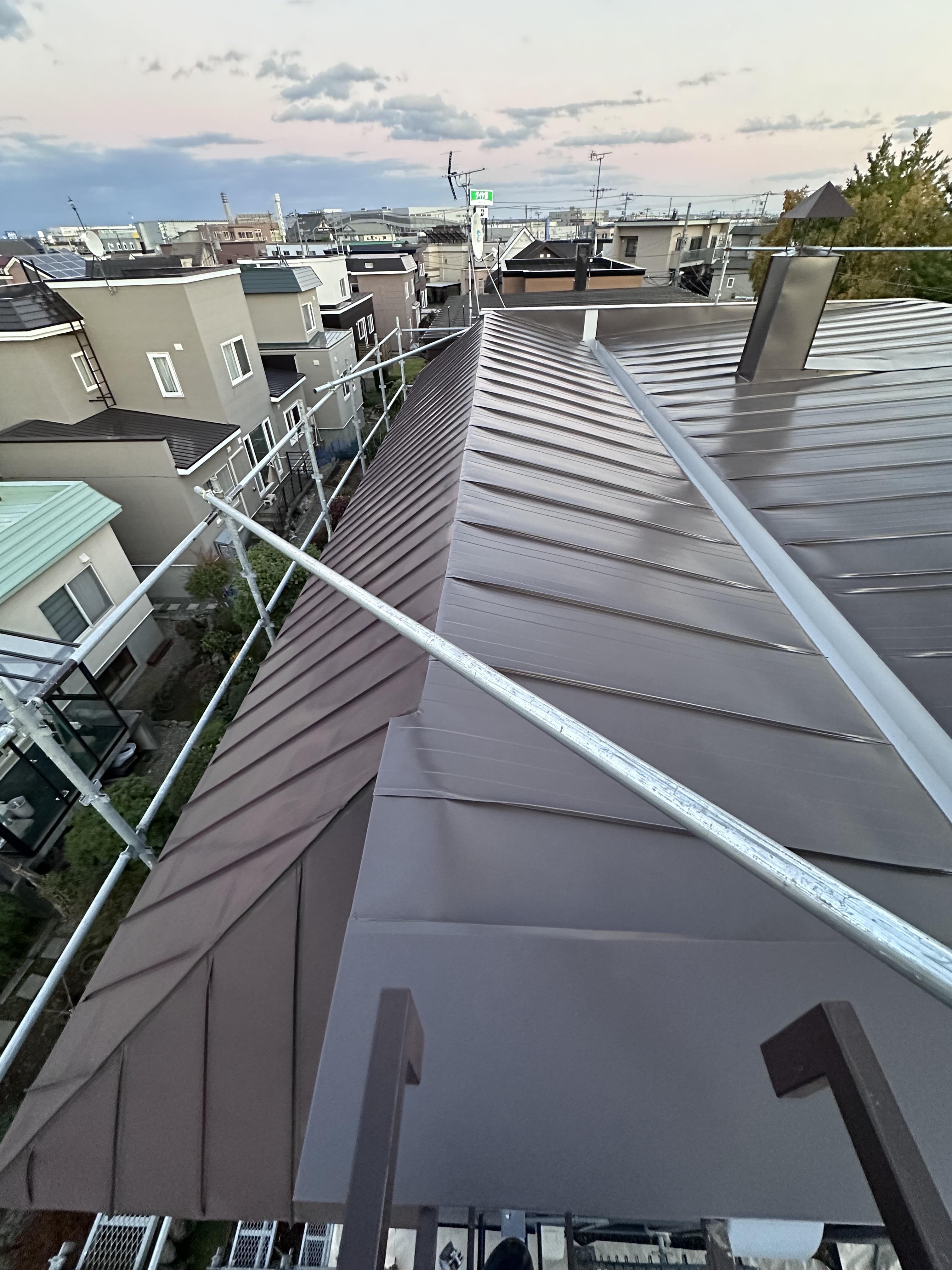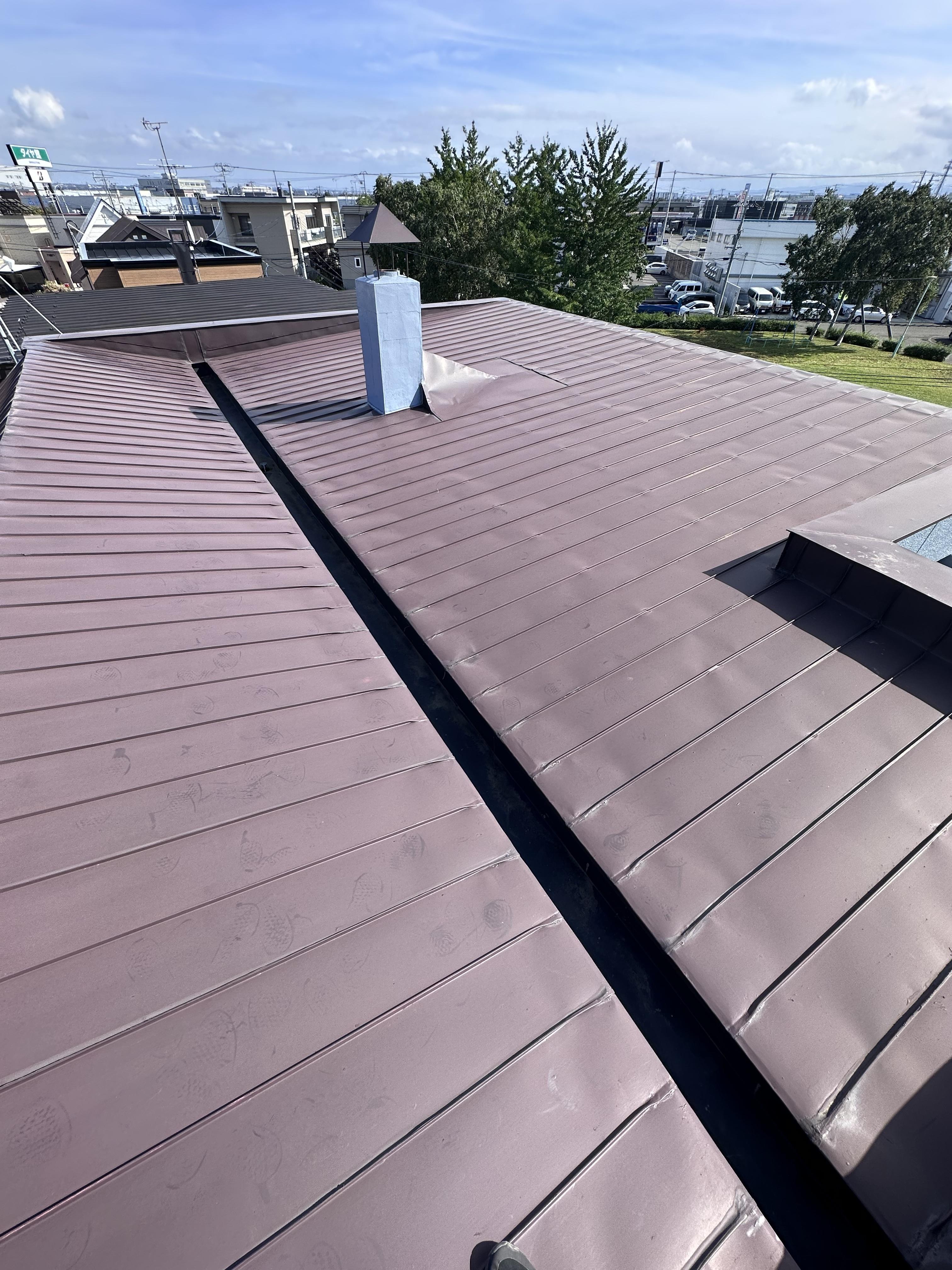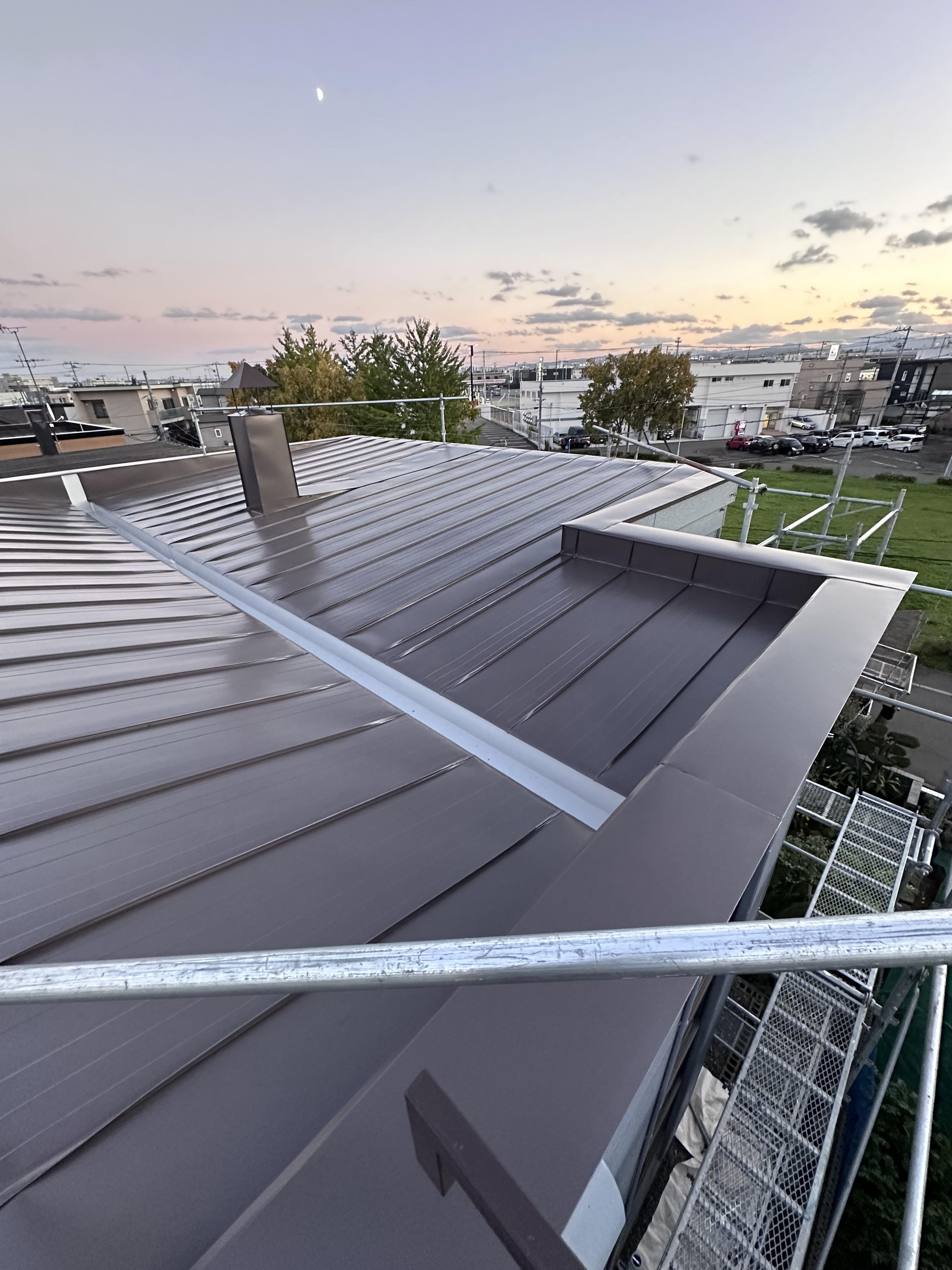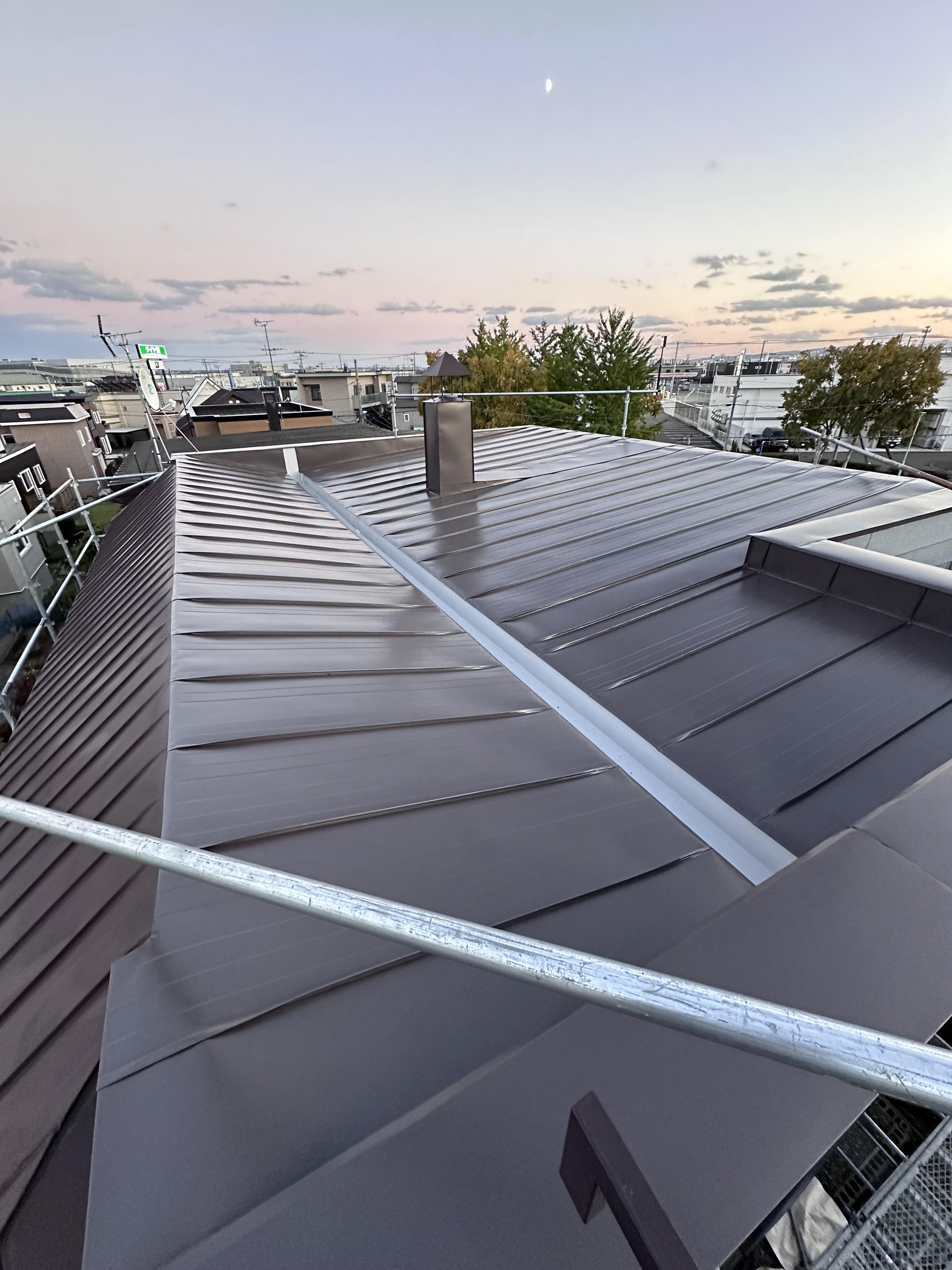 複数箇所に小さな穴があることや、強風の影響でアンテナが折れてしまった際に、屋根にぶつかり、傷やへこみができてしまったこともあり、屋根を葺き替える工事をおこないました。 既存はカラートタンでしたが、ガルバリウム鋼板を施工したことで耐久性が期待できます。
