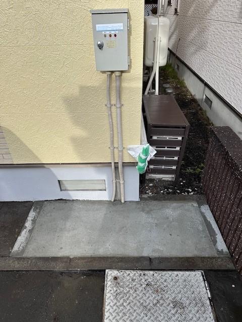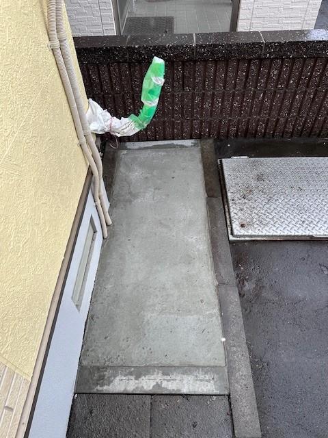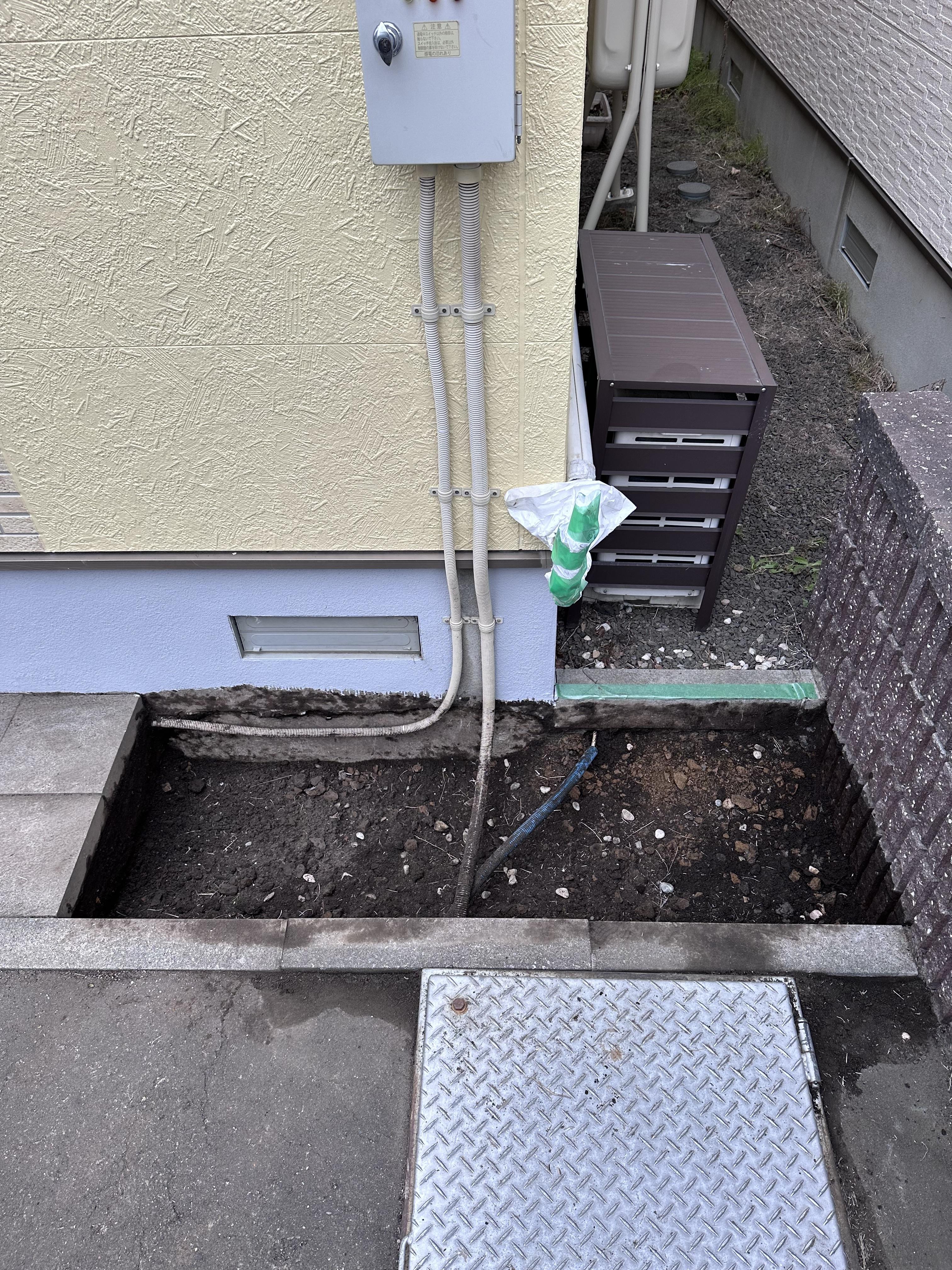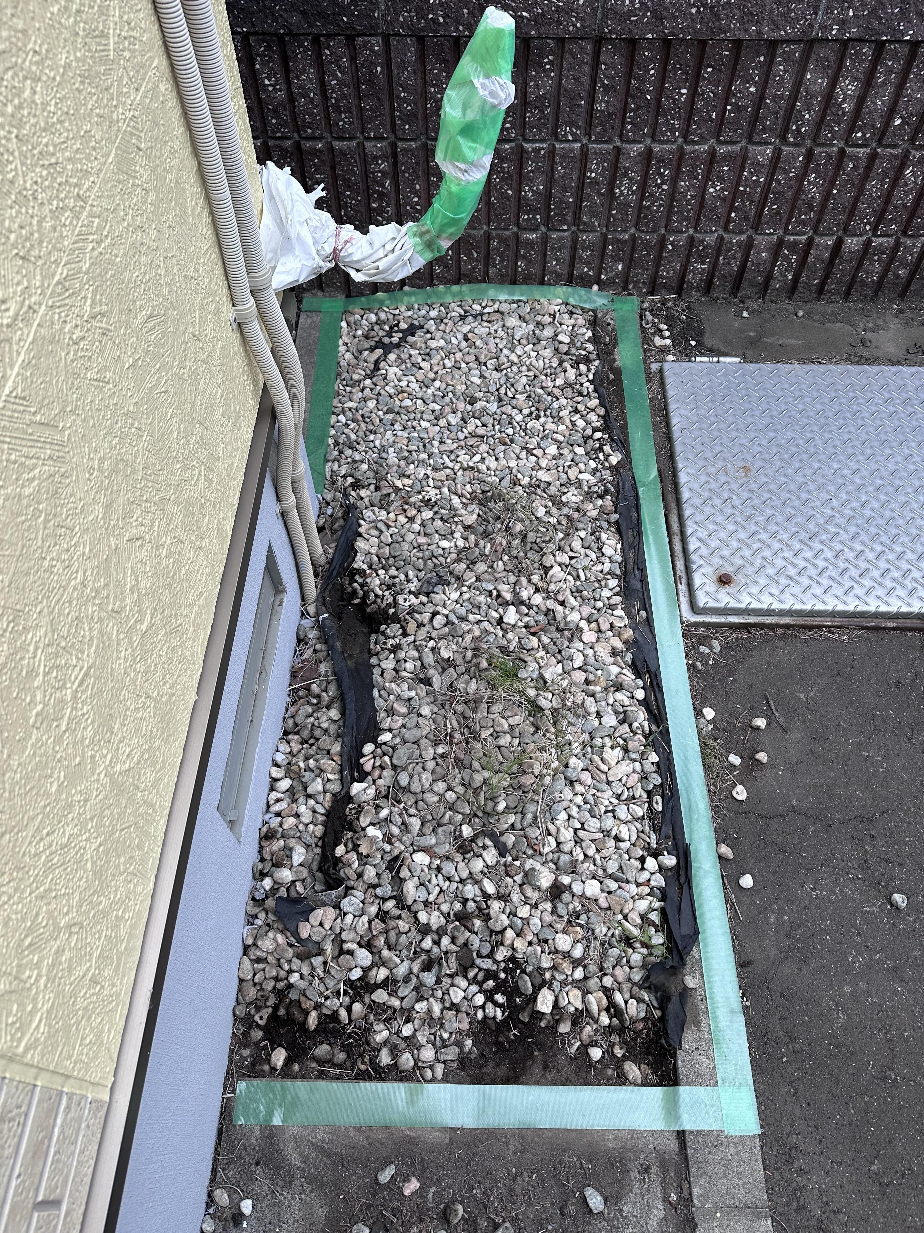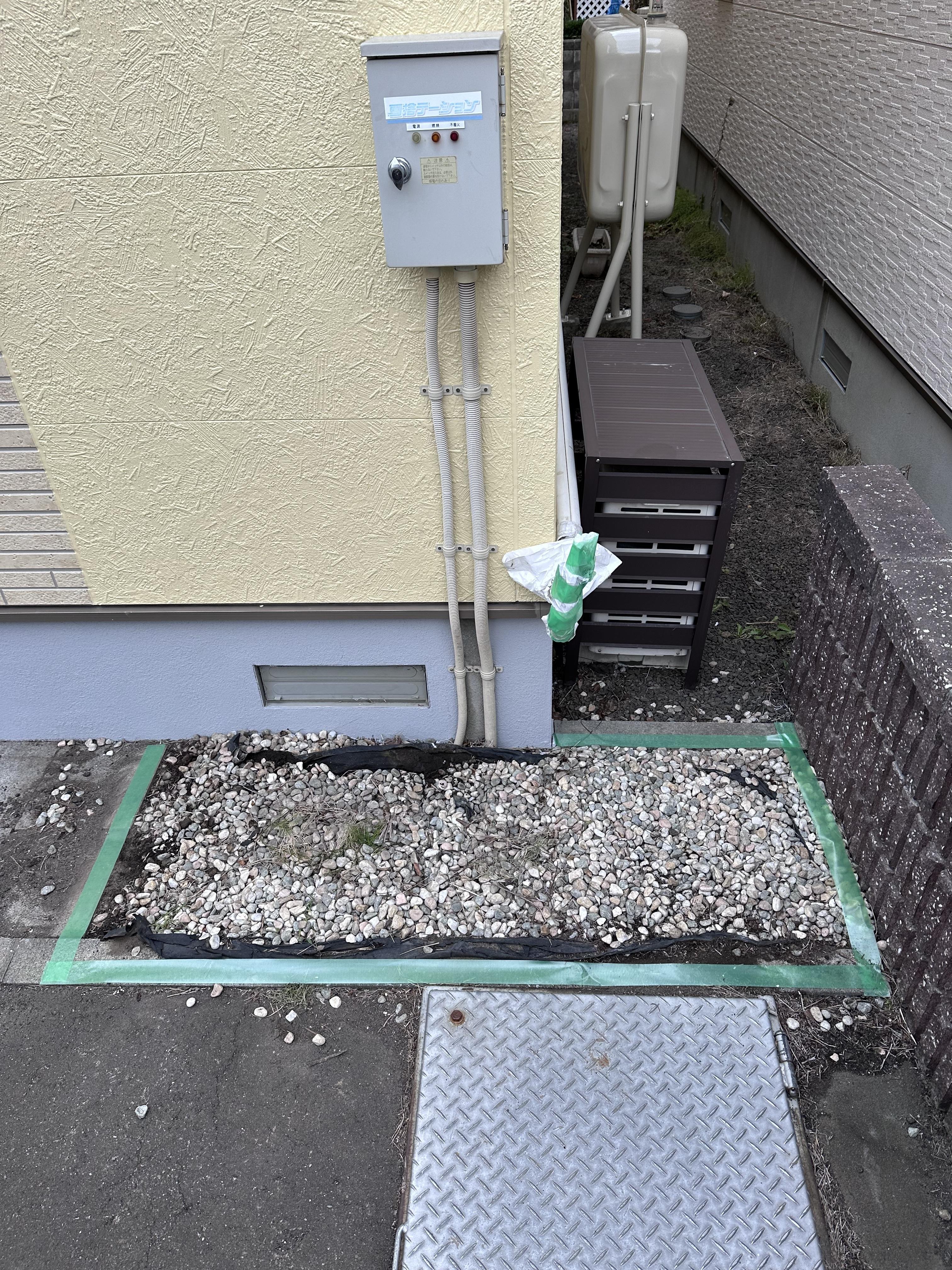 エアコン用室外機が春先になると傾いてしまうとのご相談でした。 化粧砂利や黒土を撤去し、部分的に土間コンクリートを施工させていただきました。 水分を含んだ土などが凍結することで地盤が動いてしまう原因となります。 砕石を入れ、しっかりと転圧してからコンクリートを打設することでお悩みが改善されました。