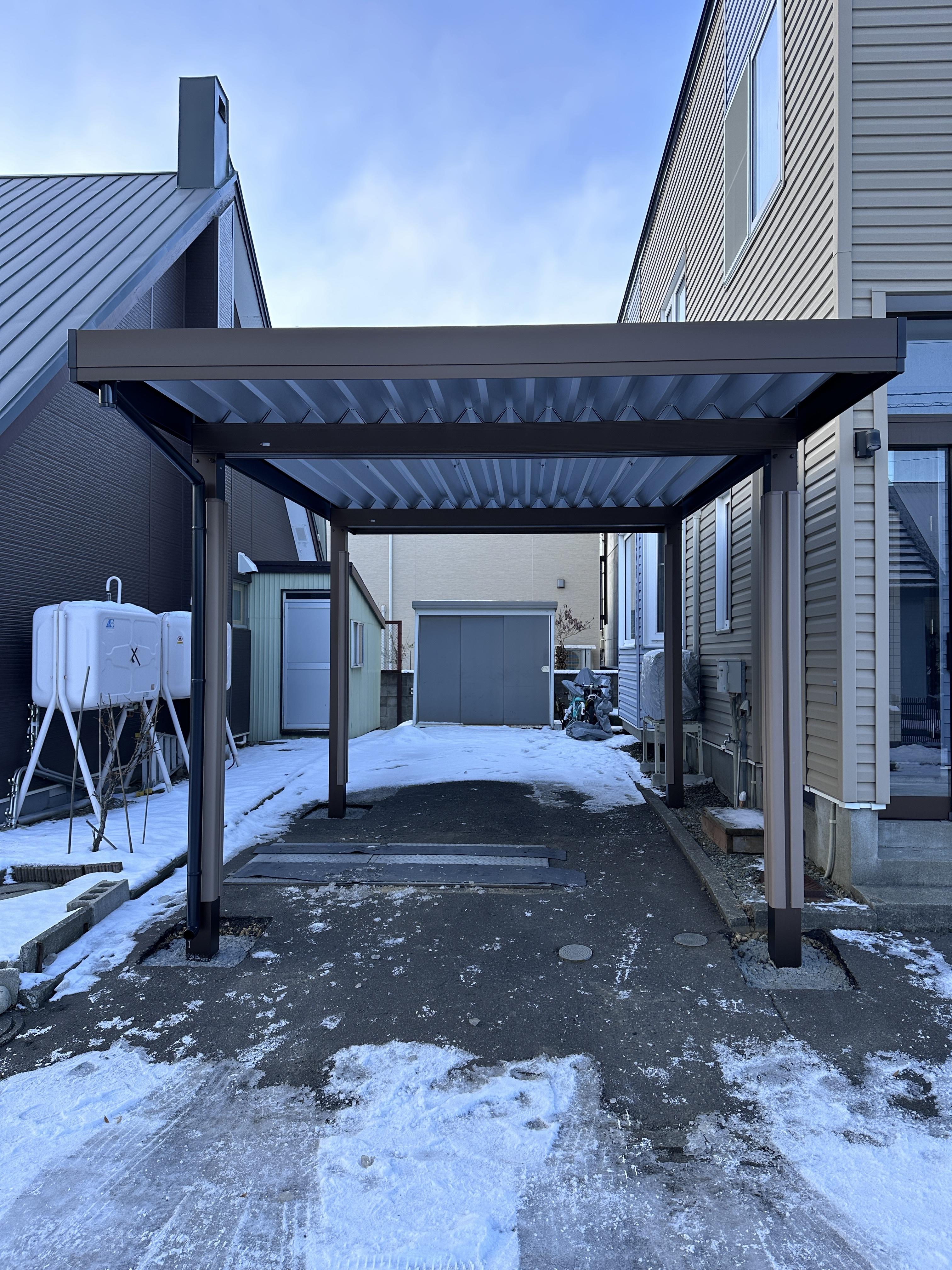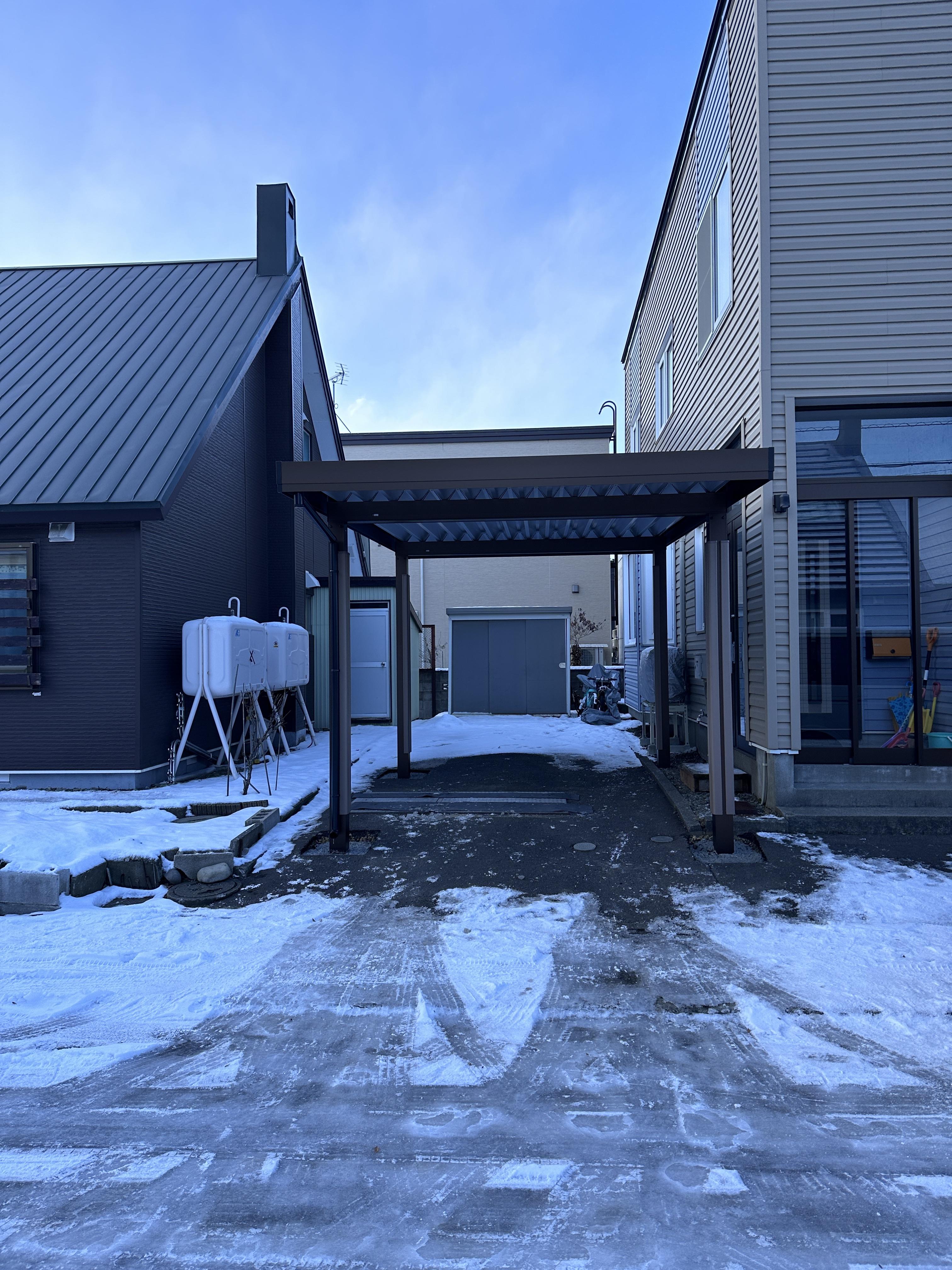 車の雪下ろしなど少しでも手間を省くことができるようにカーポートを新設しました。 リビングへの日の入りも考慮し、カーポートの位置を決めました。