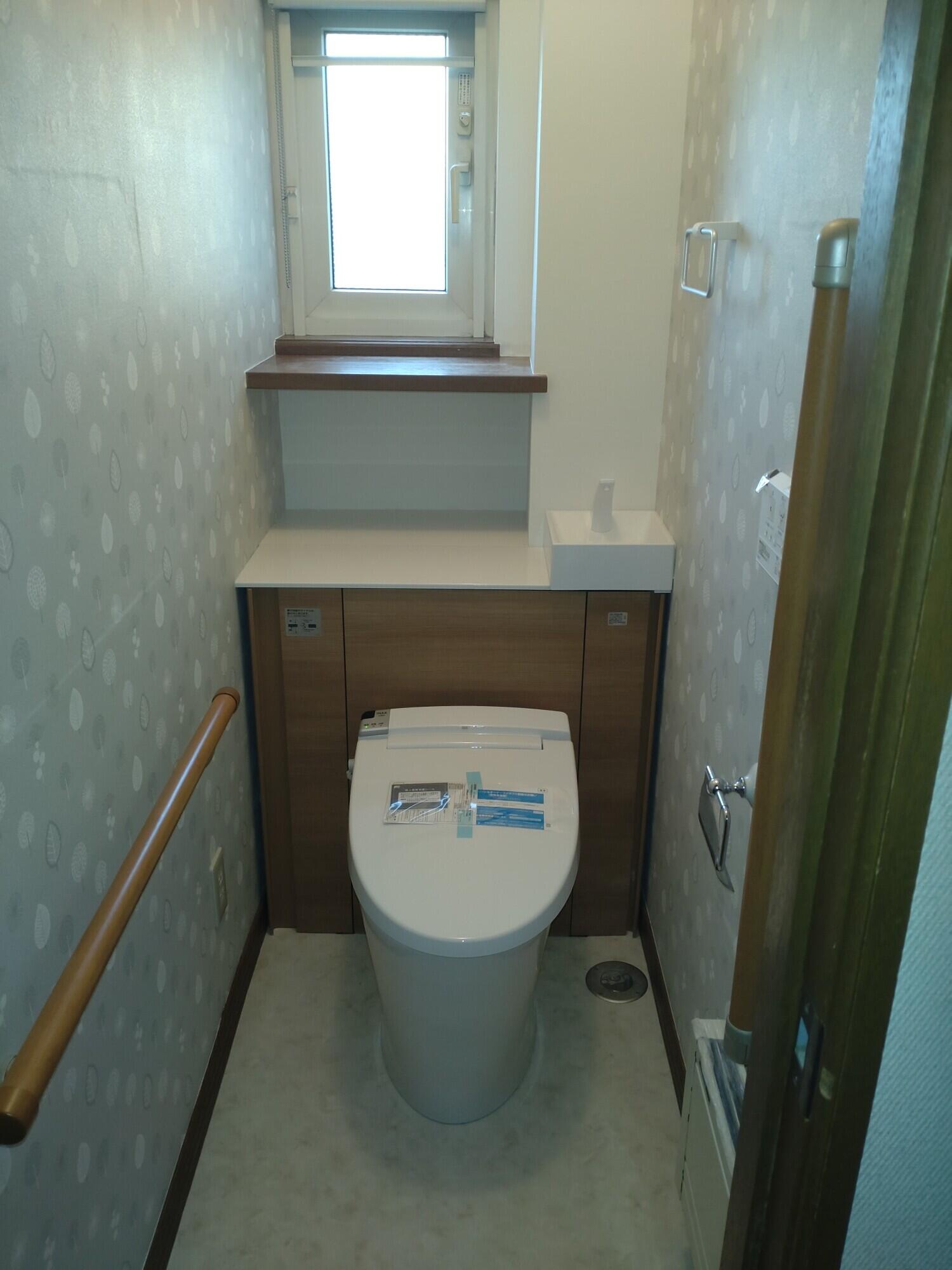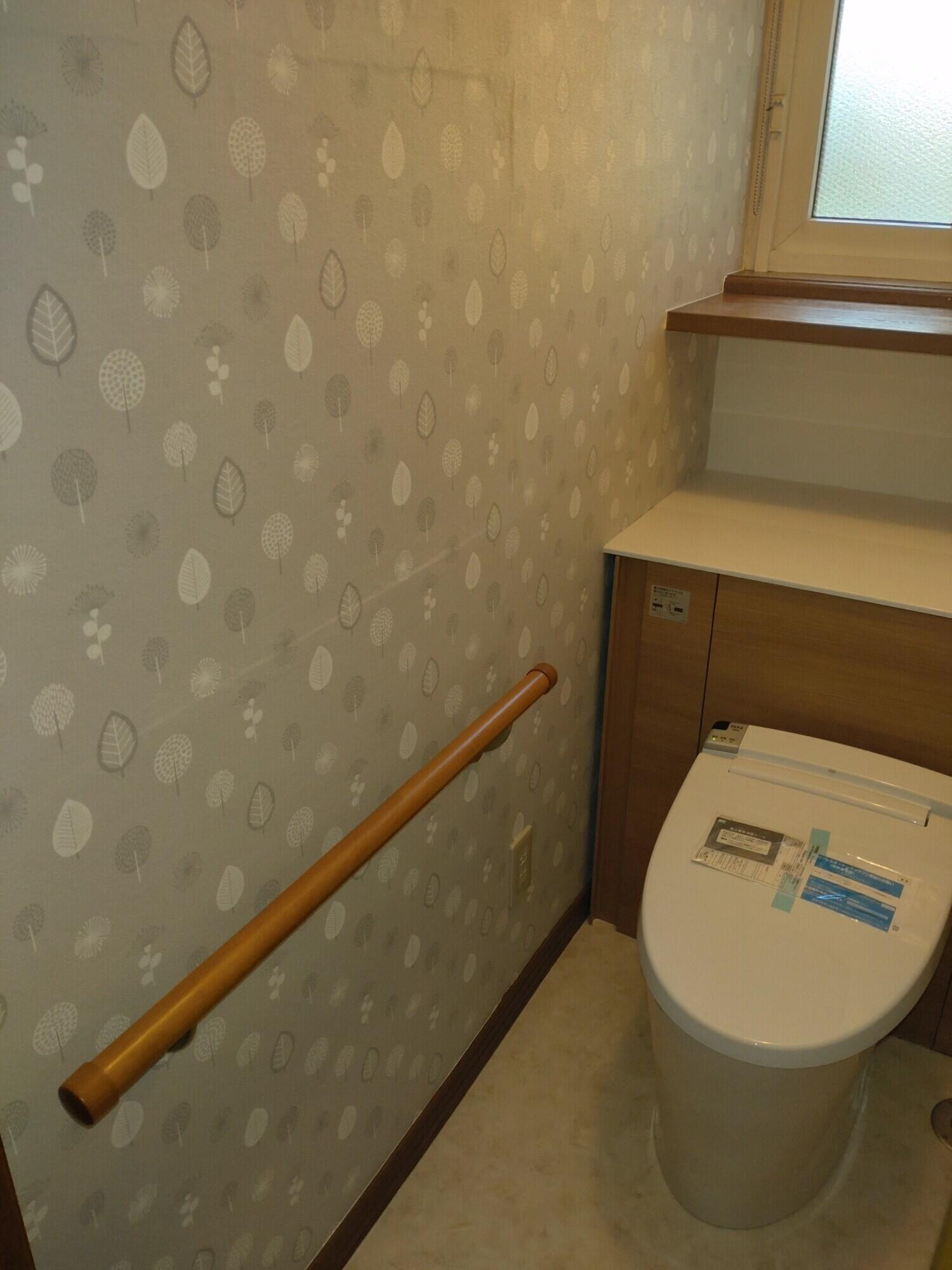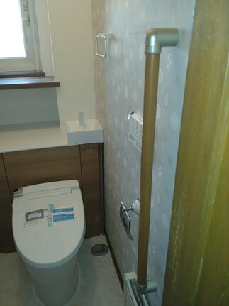 後ろのデッドスペースにライニングを作り、配管等を設置してお掃除しにくい場所を封鎖しました。 両サイドに収納、上部の棚を延伸して物を置けるようにしています。 左右の壁に木下地を入れ、手摺を取り付け転倒防止対策しました。